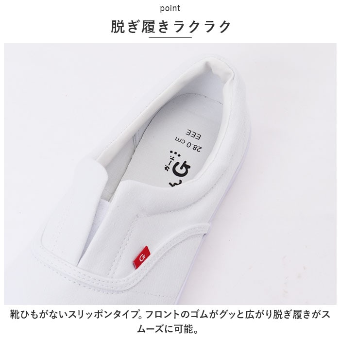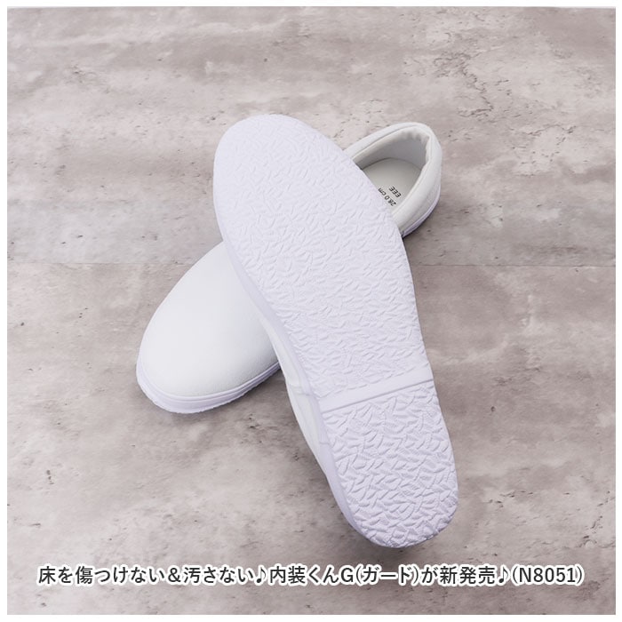 | 商品説明 | 床を傷つけない&汚さない♪内装くんG(ガード)が新発売♪(N8051)【上履き仕様】清潔感のあるまっしろなデザインで靴感が少ない上履き仕様。アウトソールも白色だから床に色移りしないのも嬉しいポイント。【先芯入り】つま先部分にはプラスチック製の先芯入りで、安全に作業が可能!上に道具を落としても安心♪(※安全靴ではございません。)【脱ぎ履きラクラク】靴ひもがないスリッポンタイプ。フロントのゴムがグッと広がり脱ぎ履きがスムーズに可能。【こだわりある履き口】履き口にクッションを内蔵し、柔らかい肌あたりで靴擦れしにくい!合皮素材の滑り止め付き。【アウトソール】床を傷つけないゴム素材を使用。細かな凹凸がタイル床など滑りやすい床もしっかりグリップ。安定して作業が可能♪ |