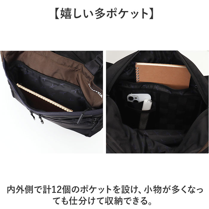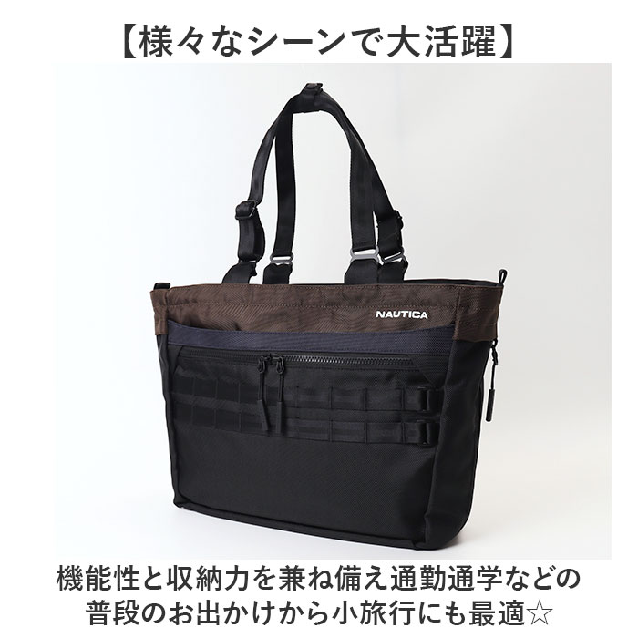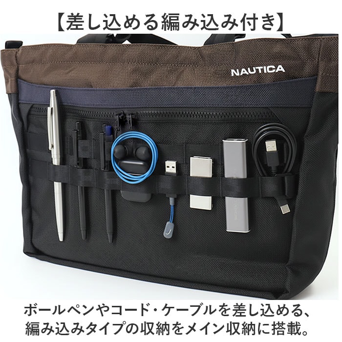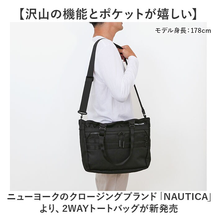 | 商品説明 | 【沢山の機能とポケットが嬉しい】ニューヨークのクロージングブランド「NAUTICA」より、2WAYトートバッグが新発売【A4サイズ対応】メイン収納はA4サイズが収納可能♪書類ケースや雑誌、テキスト類の収納もお任せ。【お弁当やポーチもOK!】しっかりとマチ幅があり、お弁当箱やポーチなどの収納もできる大容量さが魅力☆【タブレットやノートPCもOK】ウレタン内蔵のオープンポケット付き。電子機器の持ち運びも安心。【差し込める編み込み付き】ボールペンやコード・ケーブルを差し込める、編み込みタイプの収納をメイン収納に搭載。【荷物が多い時も安心】サイドのファスナーを開くとマチ幅が拡張されるので、荷物が多い時も安心♪【小物をスマートに収納可能】フロントのファスナーポケットの1つに計4つのポケットを搭載。小物をスマートに収納可能。【嬉しい多ポケット】内外側で計12個のポケットを設け、小物が多くなっても仕分けて収納できる。【ハンドルはお好みの長さに調節】ハンドルは長さ調節ができ、コートなど厚めのアウターを着たままでも肩掛けOK【斜め掛けでも持ち運び】ショルダーベルトも付属し、斜め掛けで持ち運び可能。荷物が多い時も持ち運び楽々。【キャリーケースに取り付け可能】背面にキャリーオンベルトも搭載。キャリーケースのハンドルに取り付けて遠征の移動も楽チン【様々なシーンで大活躍】機能性と収納力を兼ね備え通勤通学などの普段のお出かけから小旅行にも最適☆【ポケット仕様】メインルーム・・・オープンポケット×2、ファスナーポケット×1、PCポケット×1フロント(1)・・・ファスナーポケット×1フロント(2)・・・ファスナーポケット×1(内側:オープンポケット×2、ペン挿し×2)背面・・・オープンポケット×2 |