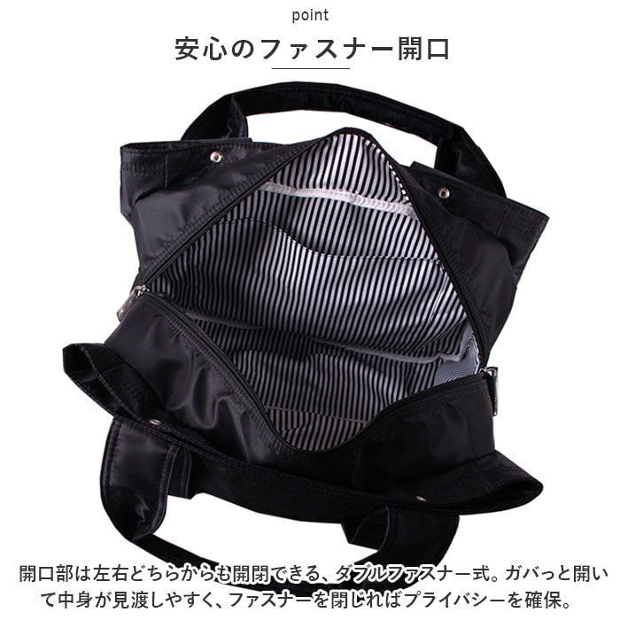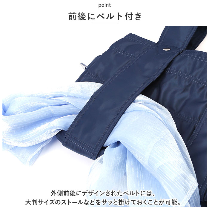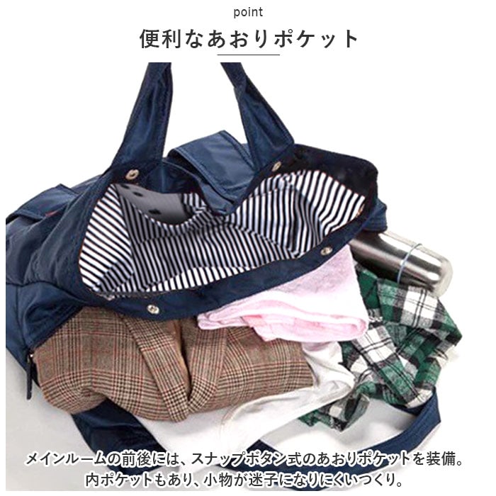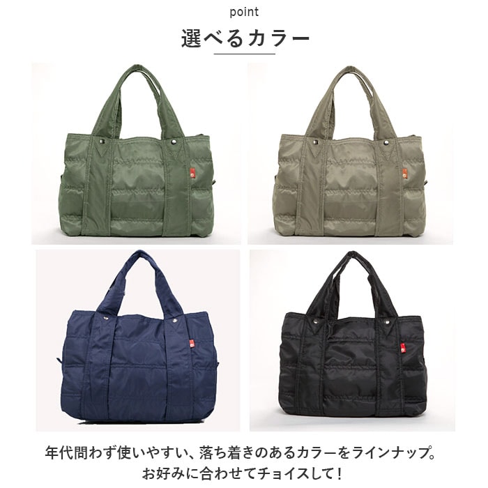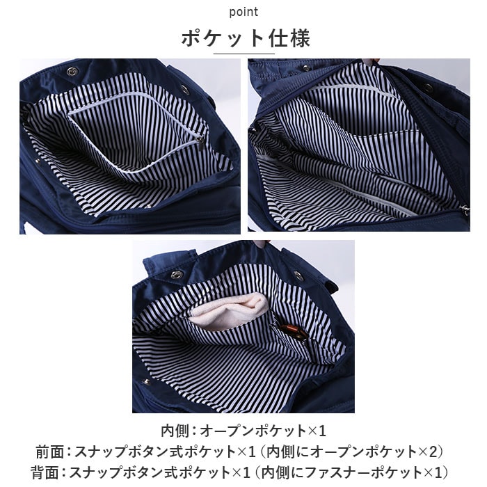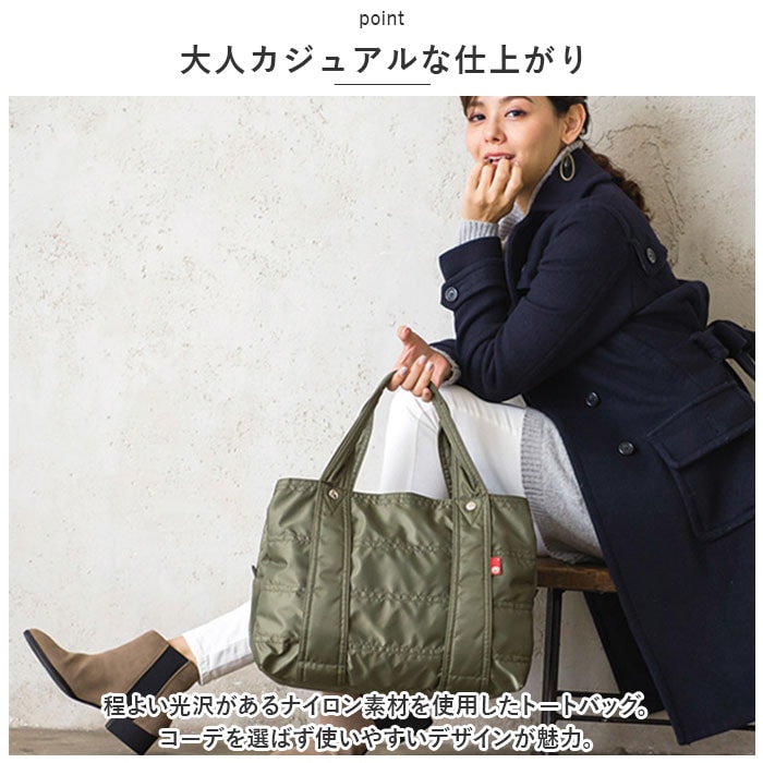 | 商品説明 | お子さまとのお出かけにぴったり。デイリーに使いまわせる、マザーズバッグ(M&Lサイズ)が登場。【大人カジュアルな仕上がり】程よい光沢のあるナイロン素材を使用したトートバッグ。コーデを選ばず使いやすいデザインが魅力。【軽やかな使い心地】ふんわりソフトな生地感で、体に負担がかかりにくい軽量設計。程よいマチ設計で電車やバス移動時にも邪魔になりにくく、スマートに持ち歩きOK。【安心のファスナー開口】開口部は左右どちらからも開閉できる、ダブルファスナー式。ガバっと開いて中身が見渡しやすく、ファスナーを閉じればプライバシーを確保。【選べる2サイズ】MサイズはA4サイズがすっぽり収まり、LサイズはB4サイズがぴったり。お好みやシーンに合わせて選べるのが嬉しい!どちらも内生地は、アクセントになるストライプ柄。【便利なあおりポケット】メインルームの前後には、スナップボタン式のあおりポケットを装備。内ポケットもあり、小物が迷子になりにくいつくり。【前後にベルト付き】外側前後にデザインされたベルトには、ストールなどをサッと掛けておくことが可能。【うれしい収納ポーチ付き】小物をまとめておけるポーチは、旅行などでも重宝。キュッと絞る巾着仕様。【シンプルなデザイン】年代問わず使いやすいデザイン&落ち着きのあるカラーをラインナップ。お好みに合わせてチョイスして!【ポケット仕様】内側:オープンポケット×1前面:スナップボタン式ポケット×1(内側にオープンポケット×2)背面:スナップボタン式ポケット×1(内側にファスナーポケット×1) |