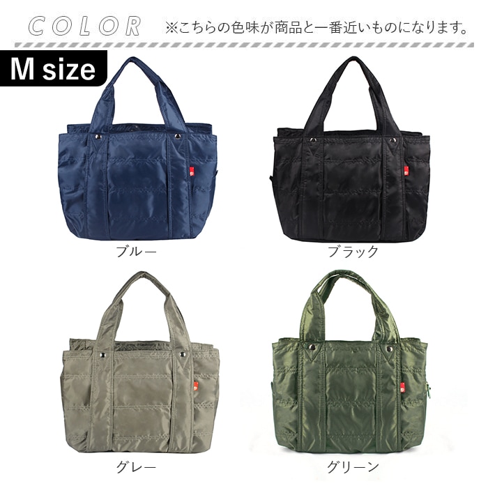 | サイズ | 【Mサイズ】 [縦]約28cm/[横]約37cm [マチ]約18cm(約12cm+約3cm+約3cm) [持ち手]約46cm 【Lサイズ】 [縦]約34cm/[横]約41cm [マチ]約22cm(約16cm+約3cm+約3cm) [持ち手]約54cm ※収納袋は全サイズ共通です。[縦]約36cm/[横]約25cm ※サイズは当店計測の実寸サイズです。実際の商品ならびにメーカー表記サイズとは多少の誤差が生じる場合がございます。あらかじめご了承ください。 |