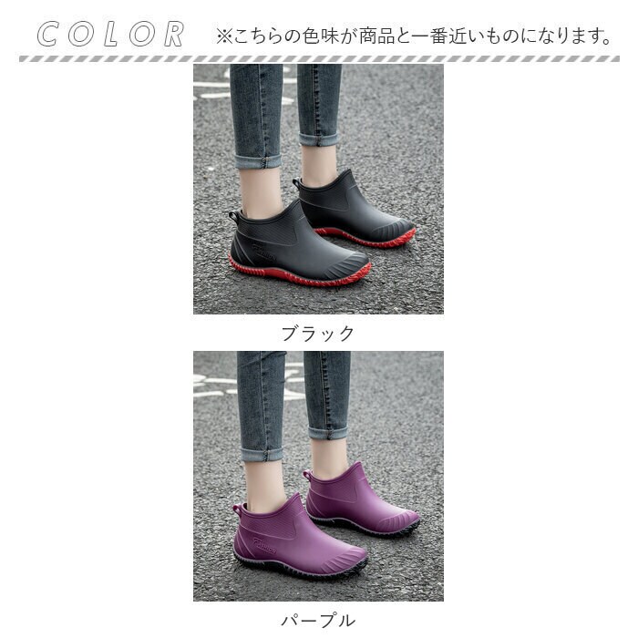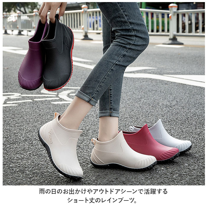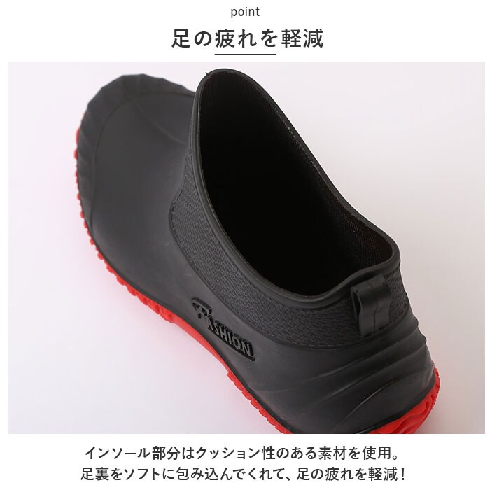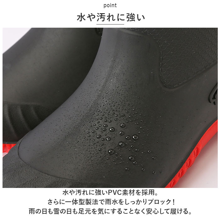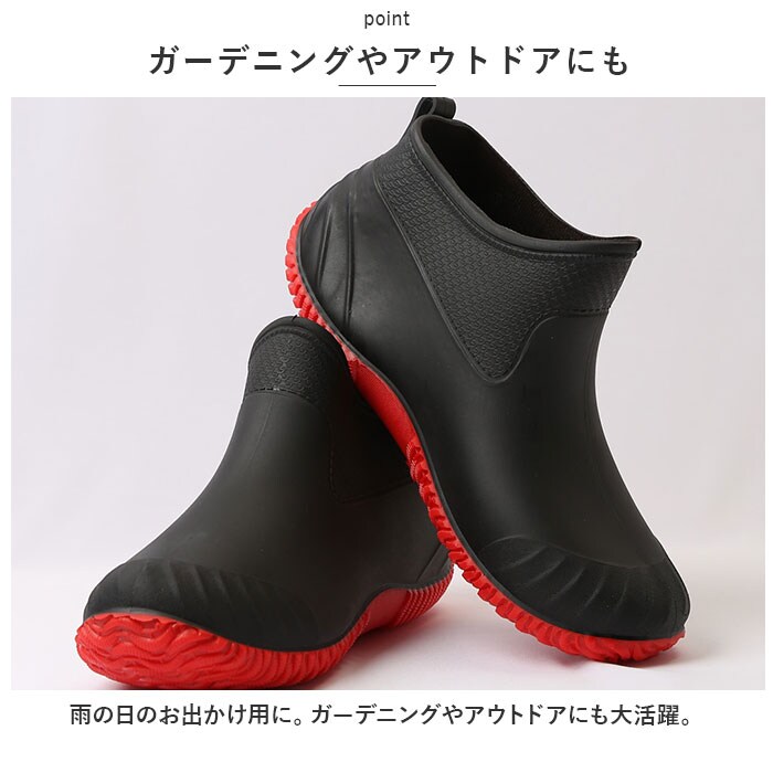 | 商品説明 | 雨の日のお出かけやアウトドアシーンで活躍する、ショート丈のレインブーツ。【水や汚れに強い】水や汚れに強いPVC素材を採用。さらに一体型製法で雨水をしっかりブロック!雨の日も雪の日も足元を気にすることなく安心して履ける。【履き心地も快適♪】屈曲性に優れた柔らかな素材なので、履き心地も快適♪【脱ぎ履きがスムーズ】スポンと履けるショート丈タイプ。履き口は柔らかく、脱ぎ履きがスムーズにできるプルストラップ付き。【足の疲れを軽減】インソール部分はクッション性のある素材を使用。足裏をソフトに包み込んでくれて、足の疲れを軽減!【滑りにくい】靴底は凹凸のある形状で、濡れた場所でも滑りにくい。【いつも清潔】中敷きは取り外しが可能。こまめに乾燥させたり水洗いすることで、常に清潔が保てるのがうれしい。【雨の日も気分をUP】コーデのアクセントになるカラーが憂鬱な雨の日の気分をUP!【ガーデニングやアウトドアにも】雨の日のお出かけ用に。ガーデニングやアウトドアにも大活躍。 |