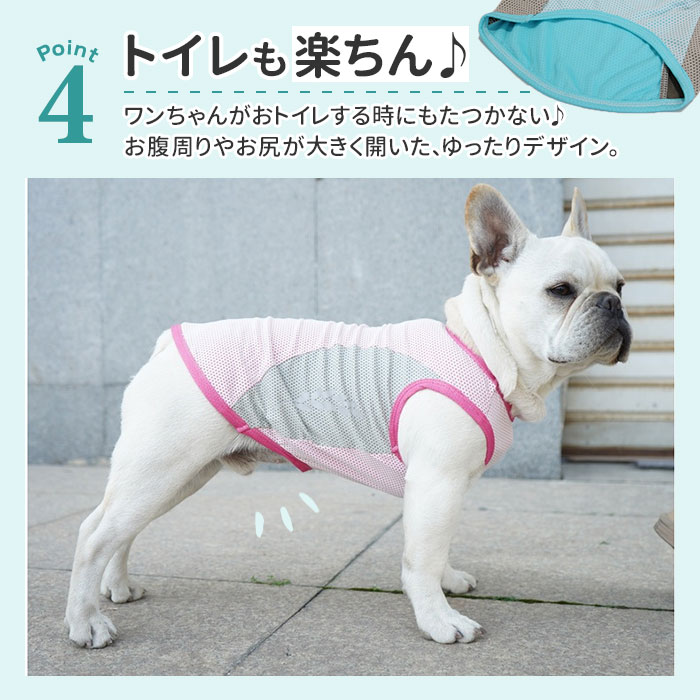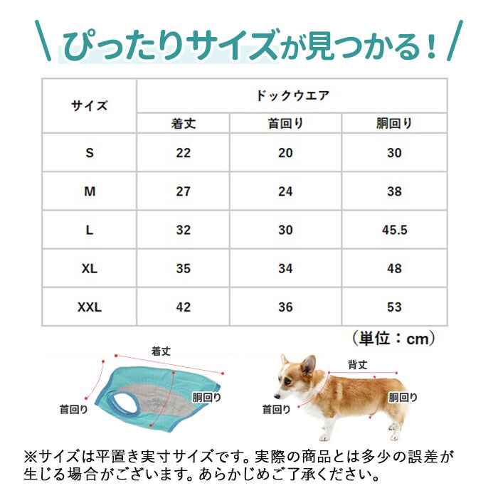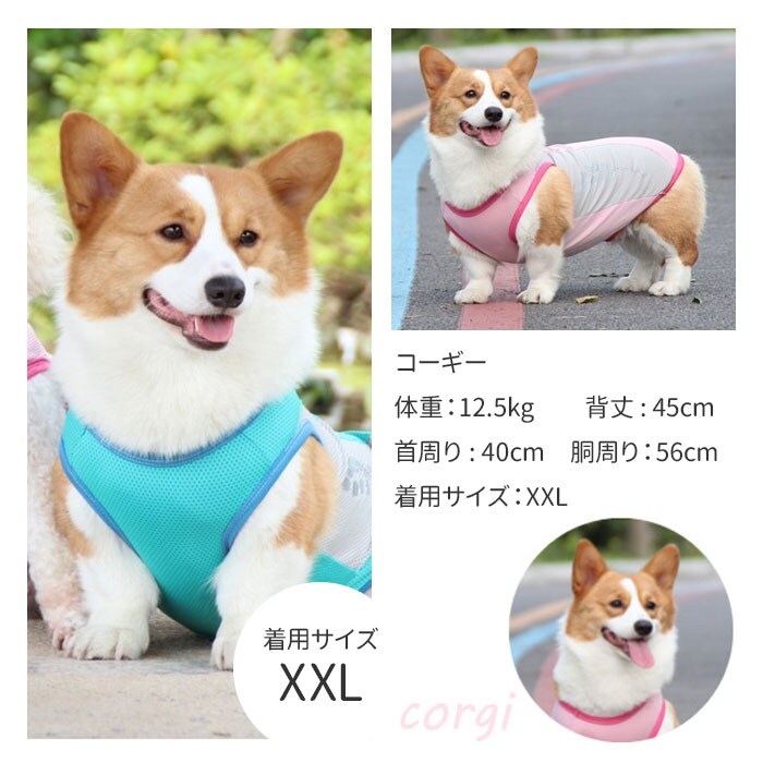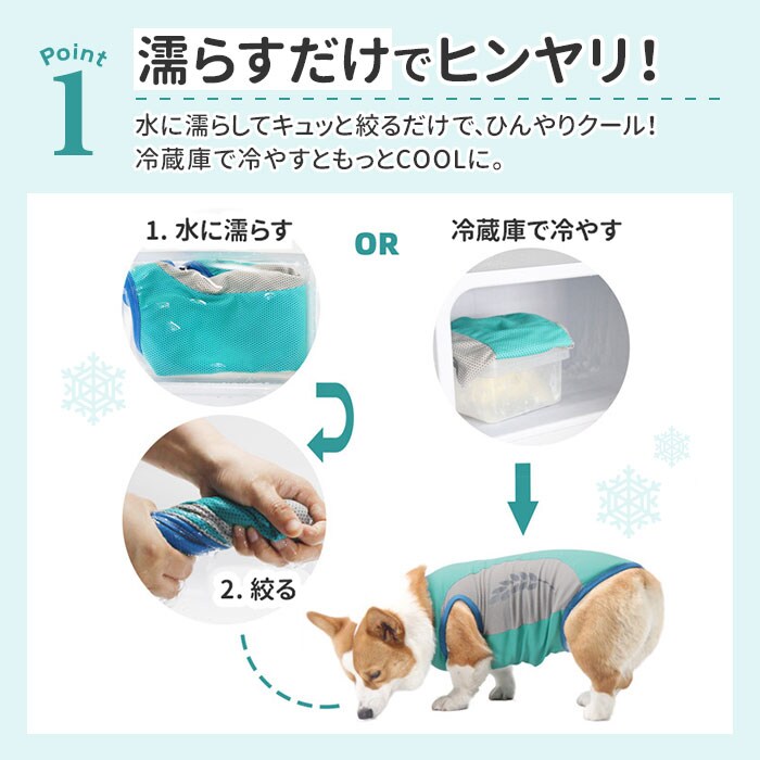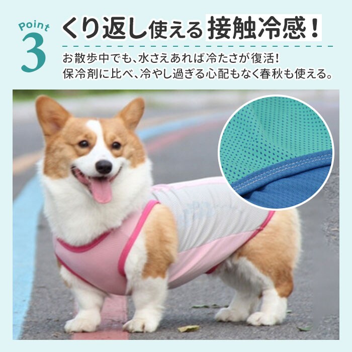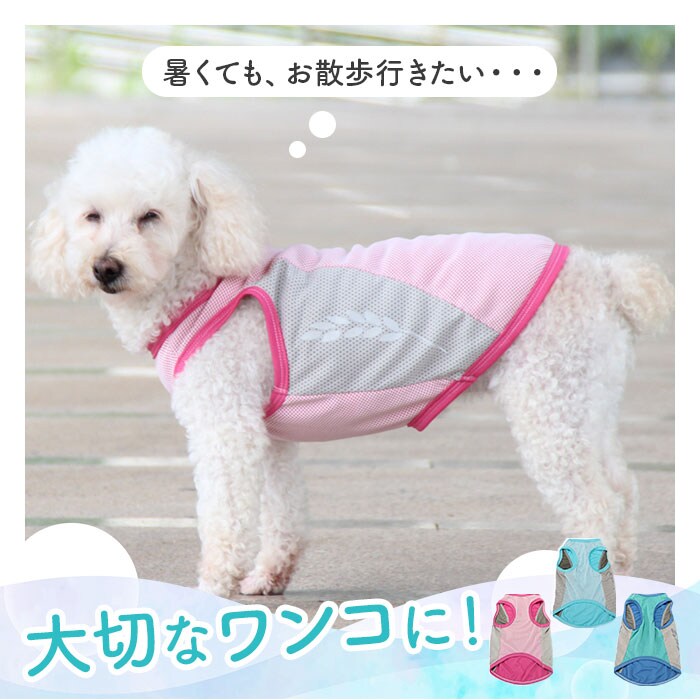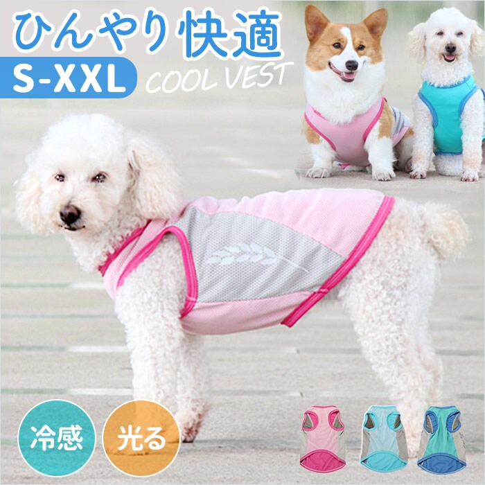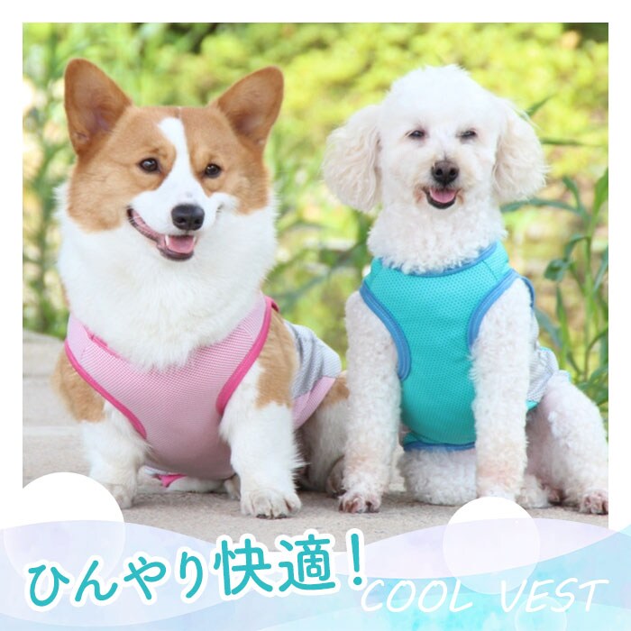 | 商品説明 | 【接触冷感生地でひんやり快適】真夏でも飼い主さんと元気にお散歩したいワンちゃんに♪「ドッグ用クールベスト」が新登場!【大切なワンコの熱中症対策に】熱した地面を歩く愛犬のことを考えた、お散歩時の暑さを和らげるひんやり冷却クールベスト。【柔らかくて、快適な着心地】濡れてもサッと乾いて、通気性抜群の接触冷感生地を使用。生地がぐーんと伸びて柔らかな着心地。【お出掛け前に簡単お着替え】お腹周りと広めの襟ぐりをぐーんと広げ、すっぽりと頭から被せて、両前脚を袖に通すだけ!【ワンコの身体に優しい冷たさ】水に濡らしてキュッと絞ってから着せてあげれば、気化熱が身体の熱を逃がし、ひんやりクール。【冷蔵庫で冷やしてもっとCOOLに】暑さが特に気になる季節には、クールベストを冷蔵庫で冷やしておくとひんやり感がUP!【繰り返し使えてとってもエコ】必要なのはクールベストと水道水だけ!保冷剤に比べ冷やし過ぎる心配がなく、とってもエコ。【おトイレ楽ちん・ゆったり設計】ワンちゃんがおトイレする時にもたつかない♪お腹周りやお尻が大きく開いた、ゆったりデザイン。【夜のお散歩もより安全に】ウェアの両脇には、麦の穂をかたどった自動車のライトにキラリと光るリフレクター素材を配置。【ぴったりサイズが見つかる!】小型犬から体に熱がこもりやすい大型犬まで、ゆったり着られるS~XXLサイズの5サイズ展開。※超小型犬から、胴回り53cm程度までの中型~大型のワンちゃんに最適なサイズ感です。【クールネックもオススメ】水に濡らして使うドッグ用「クールネック」と一緒にお使いいただくと、暑さ対策により効果的!※「クールネック」は、別商品ページでお買い求めいただけます。ストアの検索窓に、英数字の商品コード「clnk029」を入力して、検索してください。 |