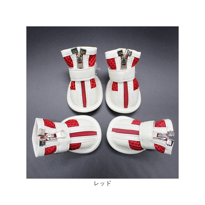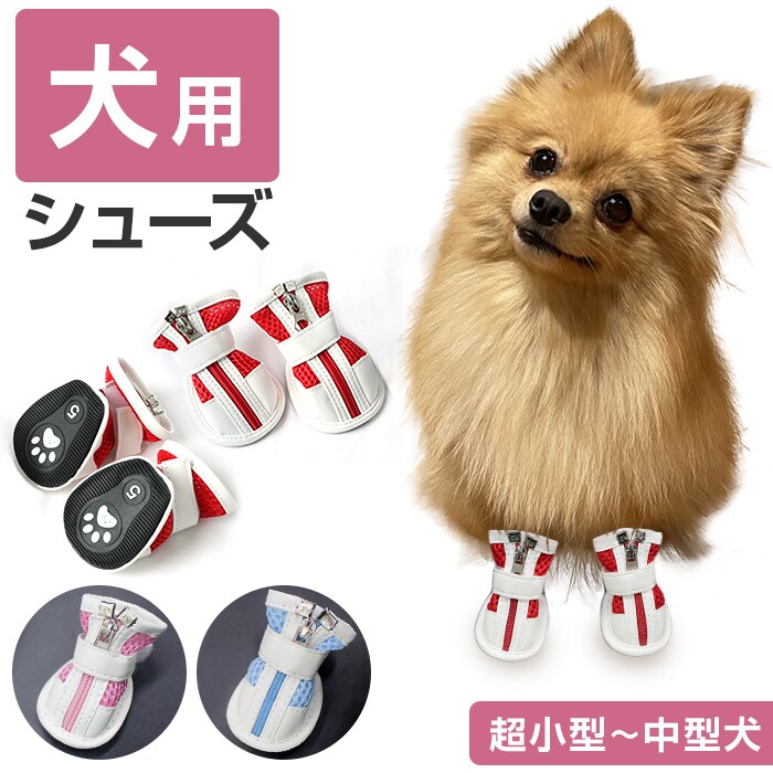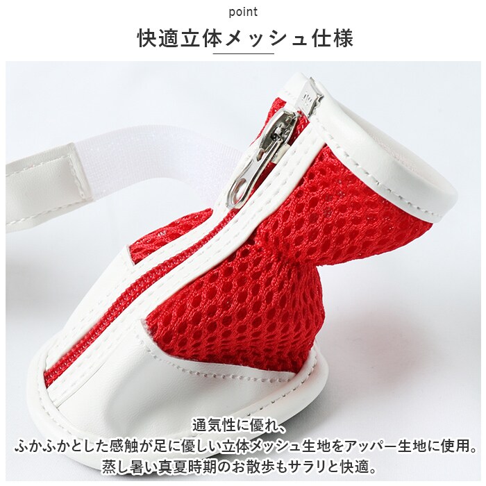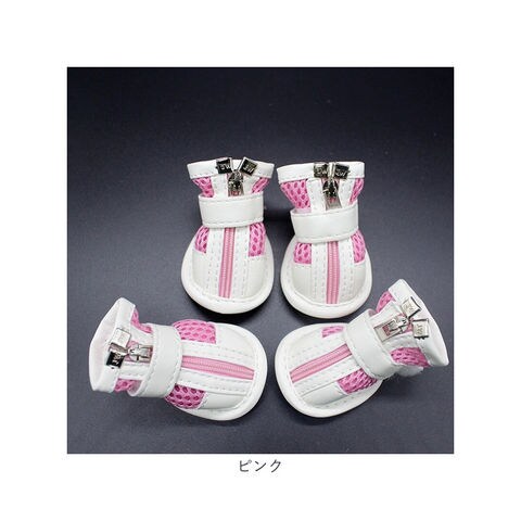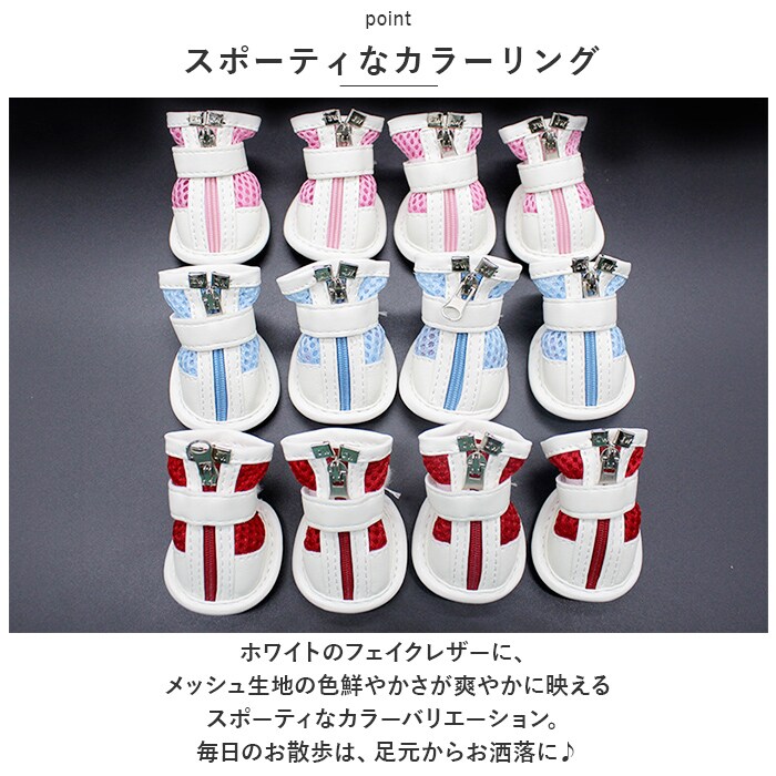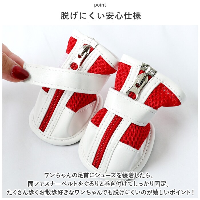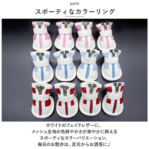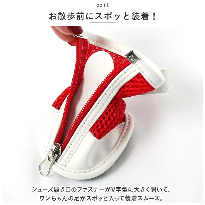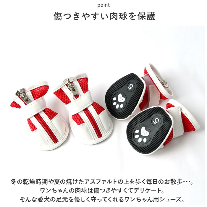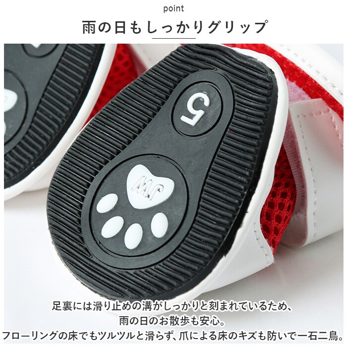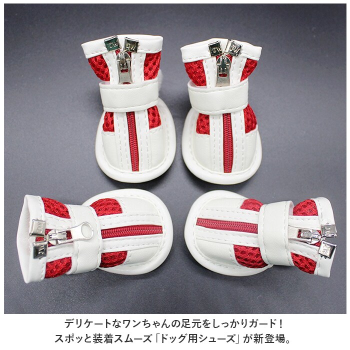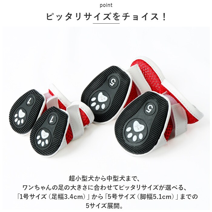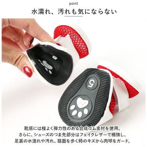 | 商品説明 | デリケートなワンちゃんの足元をしっかりガード!スポッと装着スムーズ「ドッグ用シューズ」が新登場。【傷つきやすい肉球を保護】冬の乾燥時期や夏の焼けたアスファルトの上を歩く毎日のお散歩・・・。ワンちゃんの肉球は傷つきやすくてデリケート。そんな愛犬の足元を優しく守ってくれるワンちゃん用シューズ。【お散歩前にスポッと装着!】シューズ履き口のファスナーがV字型に大きく開いて、ワンちゃんの足がスポッと入って装着スムーズ。【脱げにくい安心仕様】ワンちゃんの足首にシューズを装着したら、面ファスナーベルトをぐるりと巻き付けてしっかり固定。たくさん歩くお散歩好きなワンちゃんでも脱げにくいのが嬉しいポイント!【快適立体メッシュ仕様】通気性に優れ、ふかふかとした感触が足に優しい立体メッシュ生地をアッパー生地に使用。蒸し暑い真夏時期のお散歩もサラリと快適。【水濡れ、汚れも気にならない】靴底には程よく弾力性のある合成ゴム素材を使用。さらに、シューズのつま先部分はフェイクレザーで補強し、足裏の水濡れや汚れ、路面を歩く時のキズから肉球をガード。【雨の日もしっかりグリップ】足裏には滑り止めの溝がしっかりと刻まれているため、雨の日のお散歩も安心。フローリングの床でもツルツルと滑らず、爪による床のキズも防いで一石二鳥。【ピッタリサイズをチョイス!】超小型犬から中型犬まで、ワンちゃんの足の大きさに合わせてピッタリサイズが選べる、「1号サイズ(足幅3.4cm)」から「5号サイズ(脚幅5.1cm)」までの5サイズ展開。【スポーティなカラーリング】ホワイトのフェイクレザーに、メッシュ生地の色鮮やかさが爽やかに映えるスポーティなカラーバリエーション。毎日のお散歩は、足元からお洒落に♪ |
