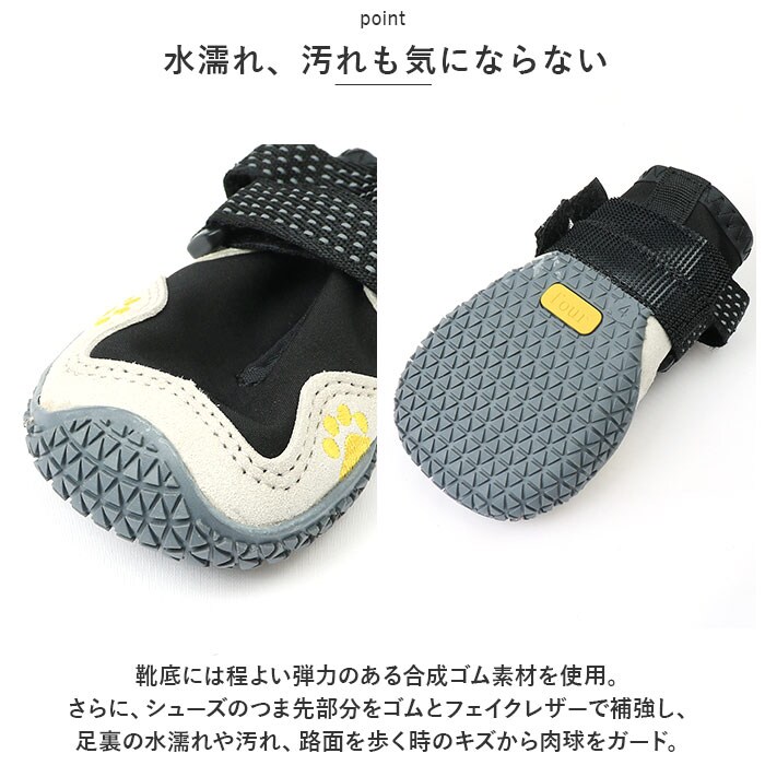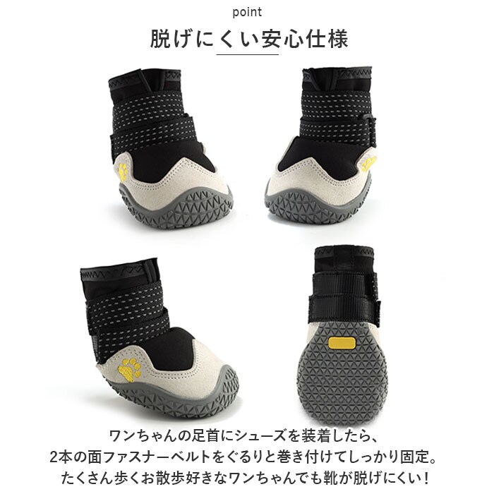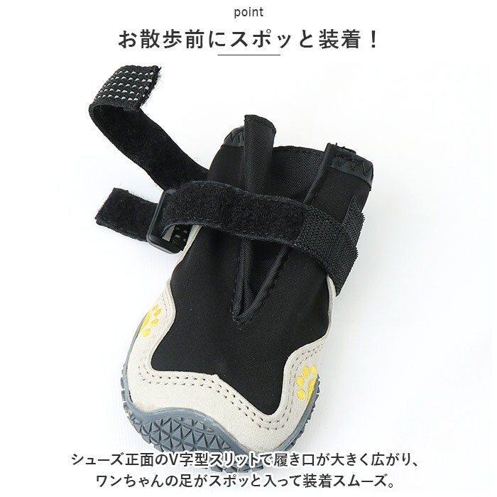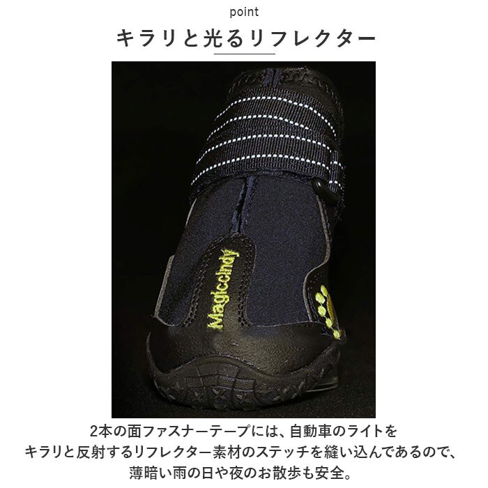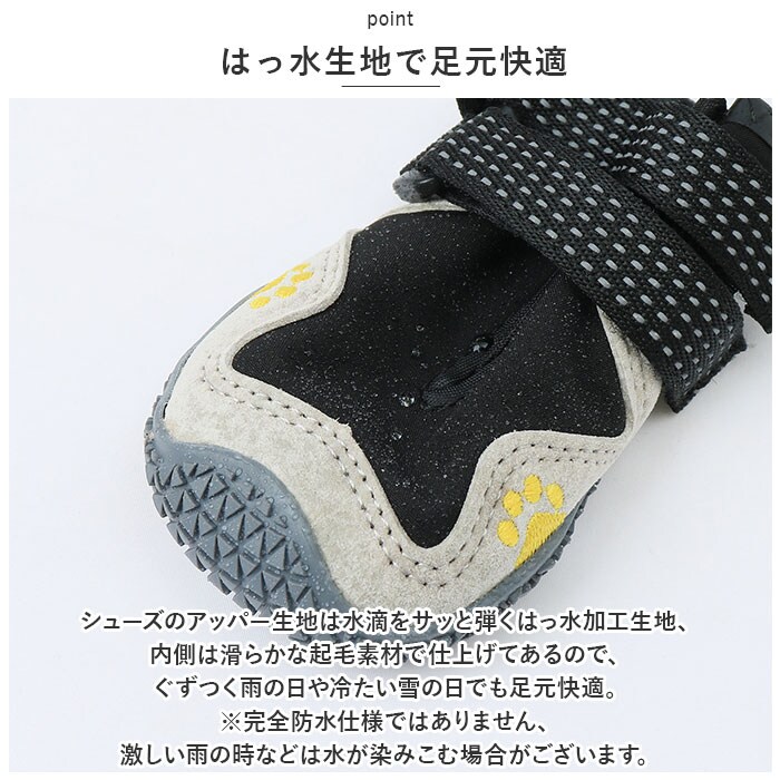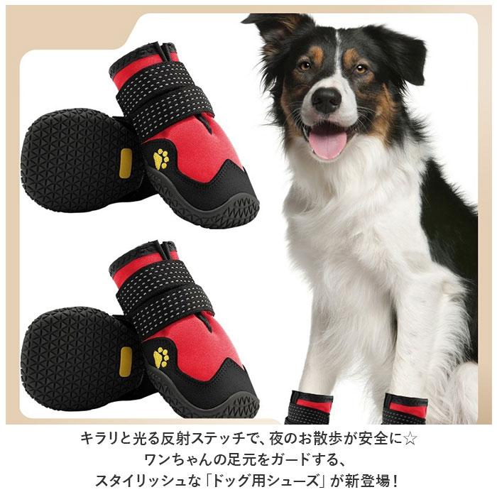 | 商品説明 | キラリと光る反射ステッチで、夜のお散歩が安全に☆ワンちゃんの足元をガードする、スタイリッシュな「ドッグ用シューズ」が新登場!【傷つきやすい肉球を保護】冬の乾燥時期や夏の焼けたアスファルトの上を歩く毎日のお散歩・・・。ワンちゃんの肉球は傷つきやすくてデリケート。そんな愛犬の足元を優しく守ってくれるワンちゃん専用シューズ。【お散歩前にスポッと装着!】シューズ正面のV字型スリットで履き口が大きく広がり、ワンちゃんの足がスポッと入って装着スムーズ。【脱げにくい安心仕様】ワンちゃんの足首にシューズを装着したら、2本の面ファスナーベルトをぐるりと巻き付けてしっかり固定。たくさん歩くお散歩好きなワンちゃんでも靴が脱げにくい!【はっ水生地で足元快適】シューズのアッパー生地は水滴をサッと弾くはっ水加工生地、内側は滑らかな起毛素材で仕上げてあるので、ぐずつく雨の日や冷たい雪の日でも足元快適。(※フェイクレザー部分ははっ水しません。完全防水仕様ではありませんので、激しい雨の時などは水が染みこむ場合がございます。)【水濡れ、汚れも気にならない】靴底には程よい弾力のある合成ゴム素材を使用。さらに、シューズのつま先部分をゴムとフェイクレザーで補強し、足裏の水濡れや汚れ、路面を歩く時のキズから肉球をガード。【雨の日もしっかりグリップ】足裏には細かい三角形の凹凸をしっかりと刻み、雨の日のお散歩も安心。フローリングの床でもツルツルと滑らず、爪による床のキズも防いで一石二鳥。【キラリと光るリフレクター】2本の面ファスナーテープには、自動車のライトをキラリと反射するリフレクター素材のステッチを縫い込んであるので、薄暗い雨の日や夜のお散歩も安全。【パッと目を惹くバイカラー】シックなカラーのアッパー生地に、ビビッドなフェイクレザーのミッドソールが映えるお洒落なバイカラーデザイン。黄色の糸で刺繍された肉球マークがパッと目を惹くワンポイント。 |