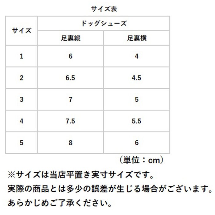 | サイズ | [ドッグシューズ] ・1(幅4.0cm) ・2(幅4.5cm) ・3(幅5.0cm) ・4(幅5.5cm) ・5(幅6.0cm) ※サイズについて詳細は、商品画像の中にあるサイズ表をご覧くださいませ。 |