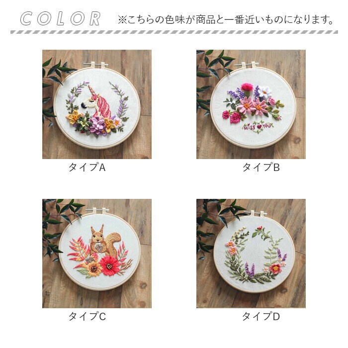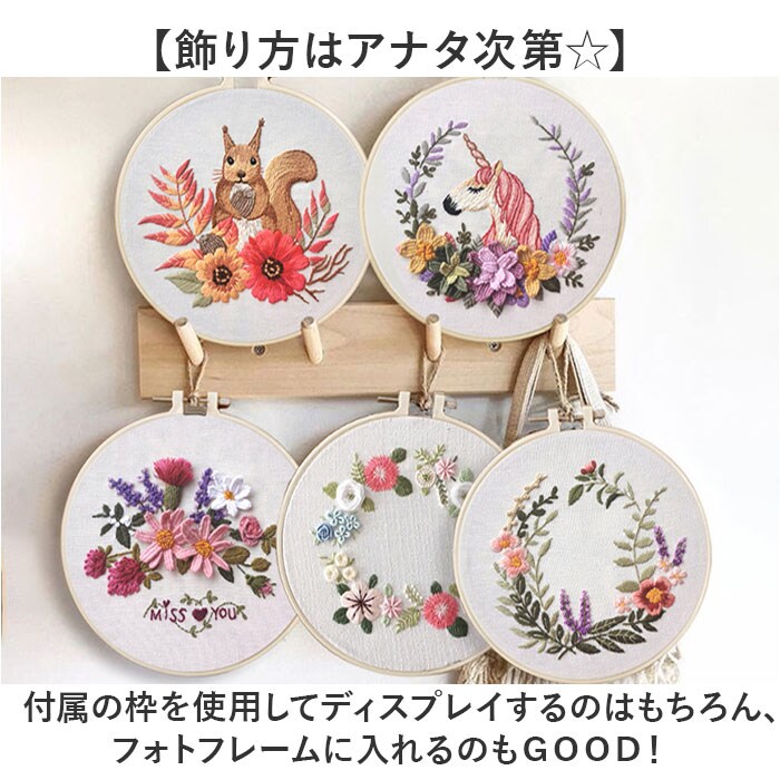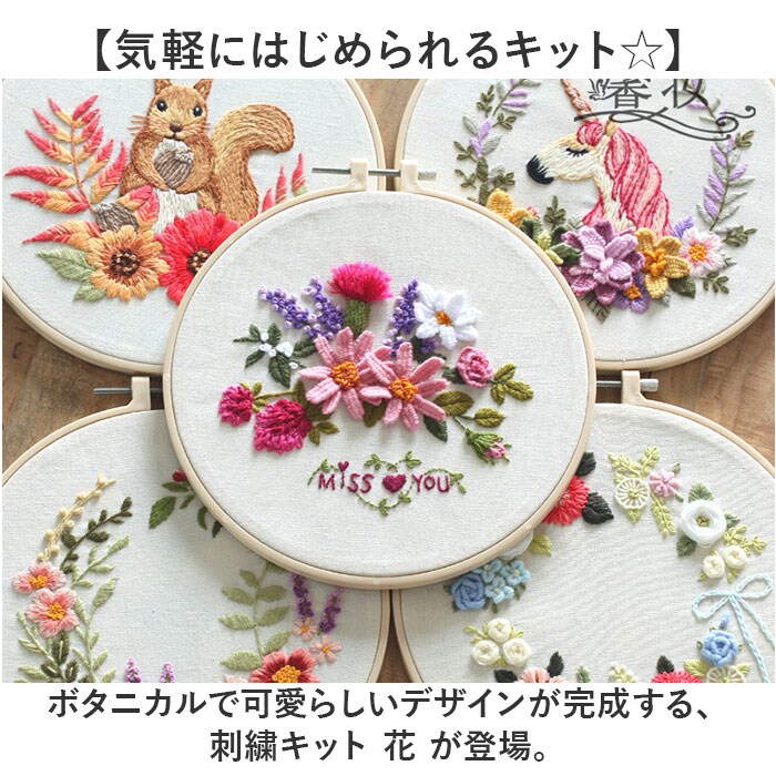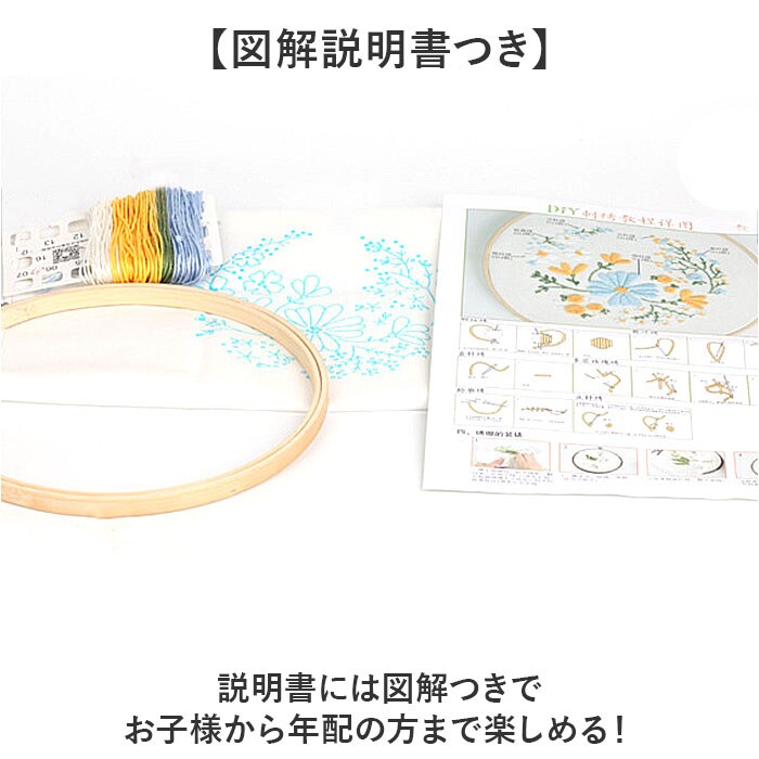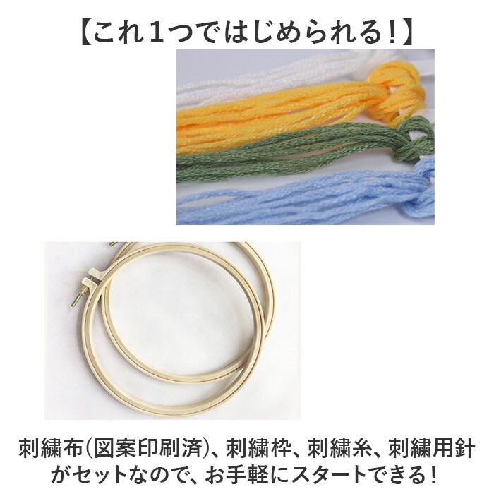 | 注意点 | 【セット内容】・刺繍用布(図案印刷済)・刺繍枠・刺繍糸・刺繍用針x 2本・説明書お取り扱いの際は、商品やパッケージなどに記載されている品質表示、アテンションタグ、ご使用上の注意事項などを必ずご確認下さい。本来の目的以外にはご使用にならないで下さい。カメラやモニターの性質により、画像と実物の色の違いがある場合がございますのでご理解願います。 |