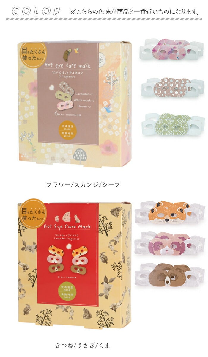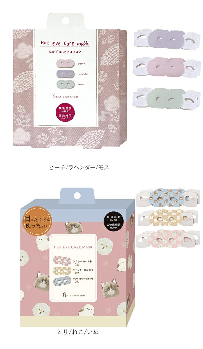 | 商品説明 | 疲れ目に最適♪可愛いアニマル柄や花柄の「ながら温アイマスク」6枚入りが登場。テレビを見ながら、スマホを見ながら、本を読みながらケアできる目元オープン仕様!約40度の快適温度で、目元を約15分温めることが可能。清潔に使える使い捨てタイプ。・3種類の異なる絵柄×各2枚の合計6枚入り。優しい香りがふわりと広がり、心もリラックス♪フラワー/スカンジ/シープ、ピーチ/ラベンダー/モスは、絵柄ごとに違う香りを楽しめちゃう◎(※きつね/うさぎ/くまは共通の香りです。) |