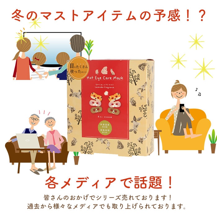 | 注意点 | [ご使用前の注意]目元パックやフェイスパックと併用しないでください。目薬の点眼直後には、お使いにならないでください。しばらく時間を置いてからご使用ください。目の周りに炎症があったり、温熱に敏感な方や温感が低下している方、医師の治療を受けている方は、医師または薬剤師に相談してからお使いください。幼児、高齢者、身体の不自由な方など自らの意思ですぐに使用を中止できない方はご使用にならないでください。[ご使用上の注意]本品に触れる部分に傷や腫れ、湿疹等の異常がある方はお使いにならないでください。現在通院中の方、持病により本品の使用に不安がある方は医師にご相談ください。熱すぎると感じられたり、お肌や身体に痒みや痛み、湿疹や腫れ等の異常を感じられた場合は、直ちに使用を中止し、医師にご相談ください。無理な力を加えると、破損の恐れがありますのでご注意ください。破損したものは、ご使用にならないでください。アイマスクが破れて、内容物が肌に付着した時は、水で洗い流すか拭き取ってください。万一、目に入った場合はこすらず、直ちに水で洗い流し、医師の診断を受けてください。就寝時のご使用はおやめください。水や湿気を与えないよう、ご注意ください。体感温度や継続時間は、環境等により差があります。[保管上の注意]発熱後は、再利用できませんので、地方自治体の定める区分に合わせて処分をしてください。小さなお子様の手の届かないところで保管してください。個包装が破損しますと、お使いいただけないことがあります。直射日光や高温多湿な場所、熱源を避けて保管してください。お取り扱いの際は、商品やパッケージなどに記載されている品質表示、アテンションタグ、ご使用上の注意事項などを必ずご確認下さい。本来の目的以外にはご使用にならないで下さい。カメラやモニターの性質により、画像と実物の色の違いがある場合がございますのでご理解願います。 |