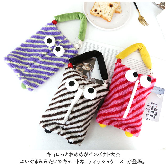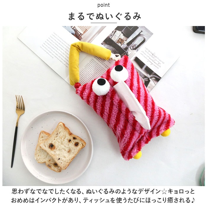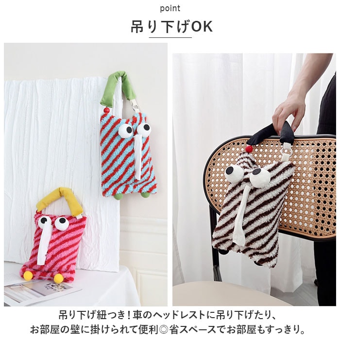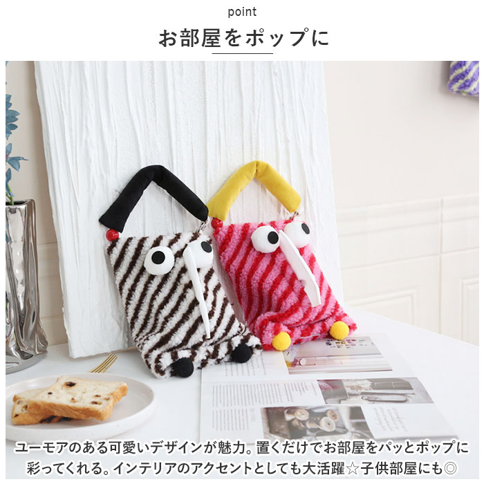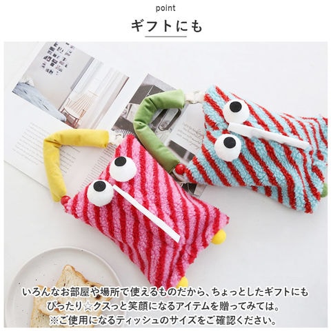 | 商品説明 | キョロっとおめめがインパクト大☆ぬいぐるみみたいでキュートな「ティッシュケース」が登場。【まるでぬいぐるみ】思わずなでなでしたくなる、ぬいぐるみのようなデザイン☆キョロっとおめめはインパクトがあり、ティッシュを使うたびにほっこり癒される♪【お部屋をポップに】ユーモアのある可愛いデザインが魅力。置くだけでお部屋をパッとポップに彩ってくれる。インテリアアイテムのアクセントとしても大活躍☆子供部屋にもぴったり!【吊り下げOK】吊り下げ紐つき!車のヘッドレストに吊り下げたり、お部屋の壁に掛けられて便利◎省スペースでお部屋もすっきり。【面ファスナー仕様】ペリっと剥がれる面ファスナー仕様なので、中身の入れ替えもラクラク。簡単仕様なのも嬉しいポイント。【ギフトにも】いろんなお部屋や場所で使えるものだから、ちょっとしたギフトにもぴったり☆クスっと笑顔になるアイテムを贈ってみては。※ご使用になるティッシュのサイズをご確認ください。 |