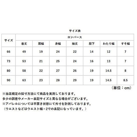 | サイズ | [ベビー] ・66cm ・73cm ・80cm ・90cm ※サイズについて詳細は、商品画像の中にあるサイズ表をご覧くださいませ。 |