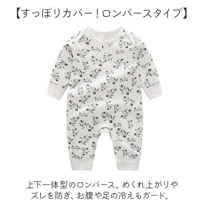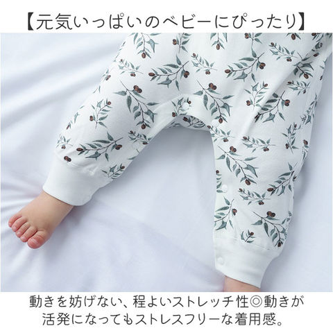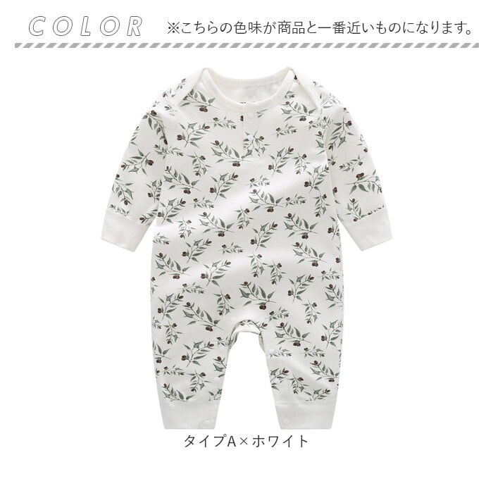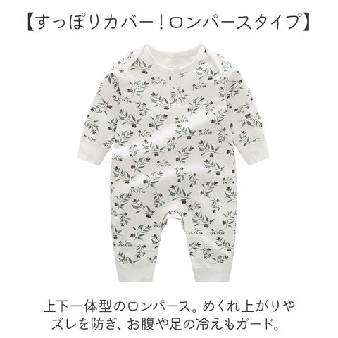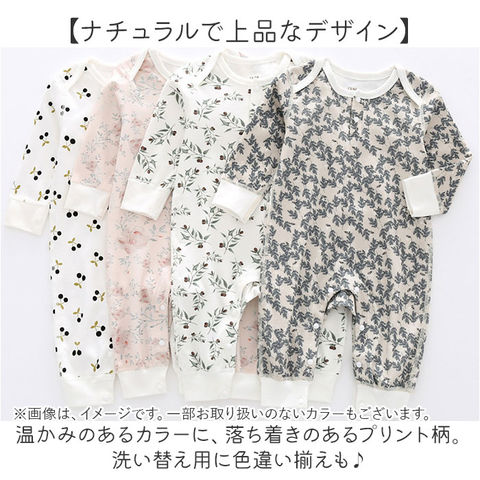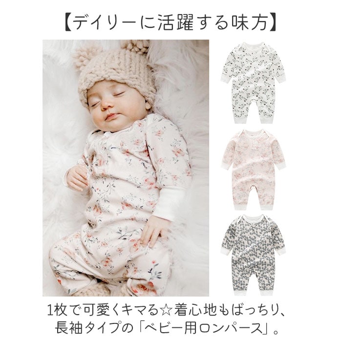 | 商品説明 | 【デイリーに活躍する味方】・1枚で可愛くキマる☆着心地もばっちり、長袖タイプの「ベビー用ロンパース」。【すっぽりカバー!ロンパースタイプ】上下一体型のロンパース。めくれ上がりやズレを防ぎ、お腹や足の冷えもガード。【着替えもおむつ替えもスムーズ】頭から被ったりボタンを留めるだけ。着替やおむつ替えの手間を軽減でき、パパ・ママも笑顔☆(※)タイプにより仕様が異なります。Aタイプは襟元と、股下、足元スナップボタン式。Bタイプは襟元から足元まで全てスナップボタン式です。【元気いっぱいのベビーにぴったり】動きを妨げない、程よいストレッチ性◎動きが活発になってもストレスフリーな着用感。【デリケートな肌に触れても安心】チクチク感せず、適度な厚みのコットン素材。快適な肌触りでロングシーズン活躍。【袖&裾リブで優しくフィット】袖と裾はリブ素材。少し大きくてもだら~んとせず、すっきり着せてあげられるのが嬉しい!【ナチュラルで上品なデザイン】温かみのあるカラーに、落ち着きのあるプリント柄。洗い替え用に色違い揃えも♪ |