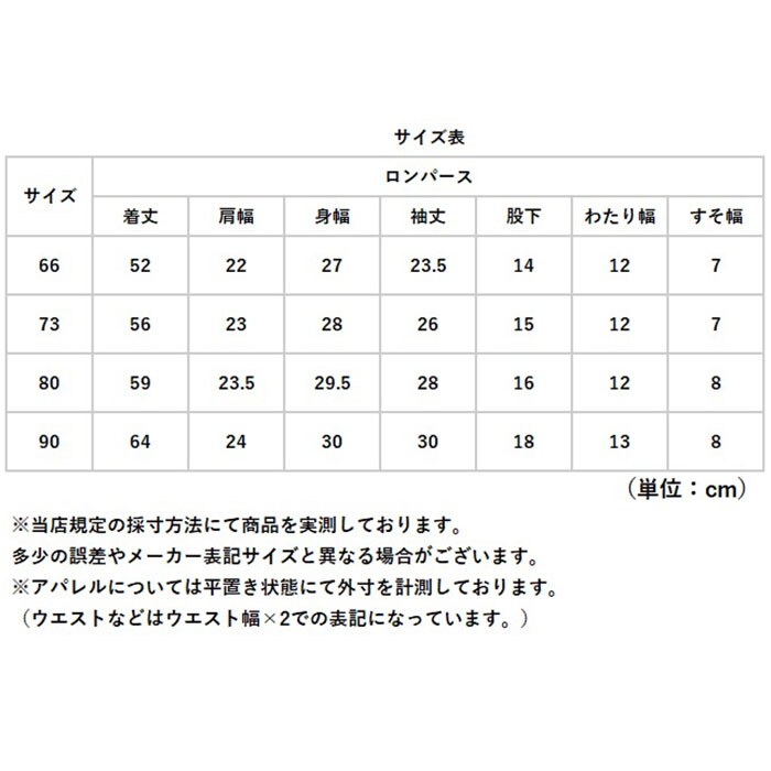 | サイズ | [ベビー(共通)] ・66cm ・73cm ・80cm ・90cm ※サイズについて詳細は、商品画像の中にあるサイズ表をご覧くださいませ。 |
