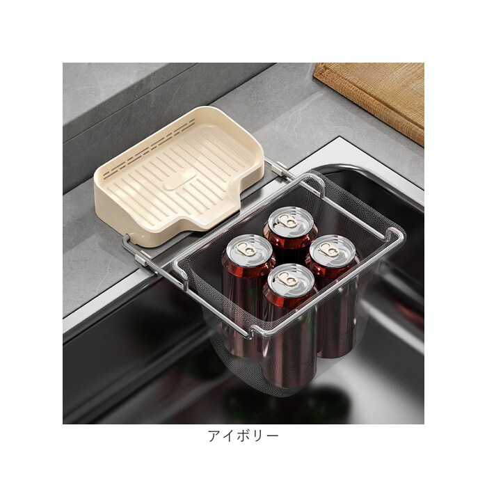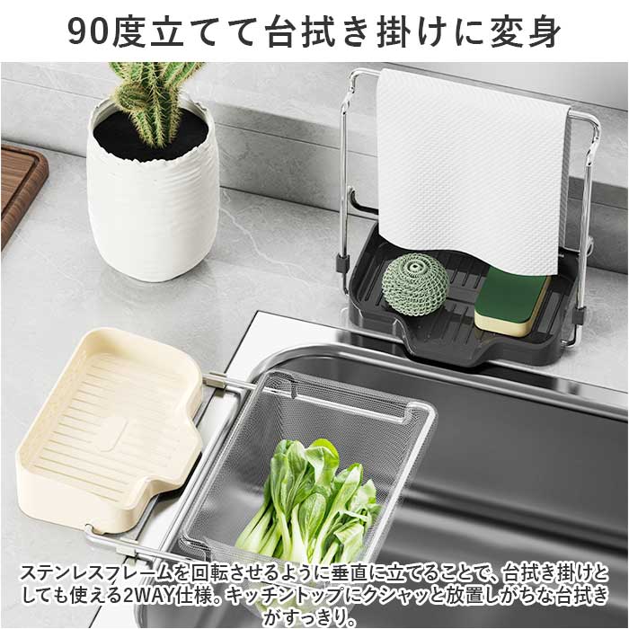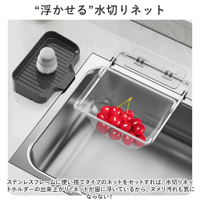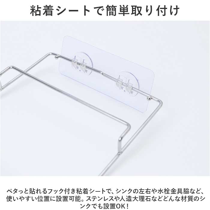 | 商品説明 | 水切りネットホルダーにも台拭き掛けにもなる♪シンク周りに取り付け簡単「2WAY キッチンドレイン」が新登場!【粘着シートで簡単取り付け】ペタっと貼れるフック付き粘着シートで、シンクの左右や水栓金具脇など、使いやすい位置に設置可能。ステンレスや人造大理石などどんな材質のシンクでも設置OK!【“浮かせる”水切りネット】ステンレスフレームに使い捨てタイプのネットをセットすれば、水切りネットホルダーの出来上がり!ネットが宙に浮いているから、ヌメリ汚れも気にならない!【便利なスポンジホルダー付き】水切りネットホルダー奥のスポンジホルダーは、シンクに水分が自然に排出されるドレイン付きなのでスポンジもキッチン周りもいつでも清潔。【90度立てて台拭き掛けに変身】ステンレスフレームを回転させるように垂直に立てることで、台拭き掛けとしても使える2WAY仕様。キッチントップにクシャッと放置しがちな台拭きがすっきり。【高品質スレンレスフレーム】野菜くずや生ごみが水分を含んで重くなっても安心な、錆に強く耐久性に優れたステンレス製フレームを採用。【取り付け方は簡単4ステップ】1.設置するシンク表面の水分を拭き取り、フック付き粘着シートをフック開口部をシンクの奥または外側に向けた状態で貼りつける。2.水切りネットを掛ける長方形に広がった部分を上に向けて、ステンレスフレームをフック付き粘着シートにはめ込む。3.ステンレスフレームのシンクに直接触れるシャフト部分に「キズ防止パーツ」を取り付ける。4.フック付き粘着シートが隠れるように、スポンジホルダーを取り付けたら完成!【使い方はアイディア次第♪】生ごみ処理用の水切りネットとしてだけでなく、野菜を水洗いするときや、シンクに水を張って缶飲料を冷却するなどにも大活躍。【三角コーナーより省スペース】食べ残しが生ごみ容器に直接触れないので、ヌメリ汚れをスポンジで落とす手間がなくお手入れ楽ちん。シンクの一角を占領する三角コーナーより省スペースに使えるのも嬉しいポイント。 |