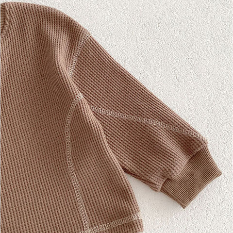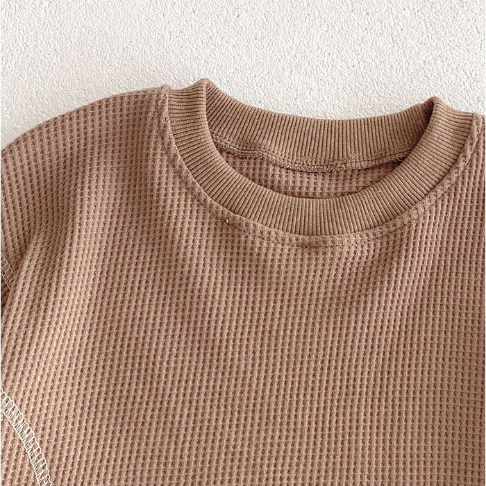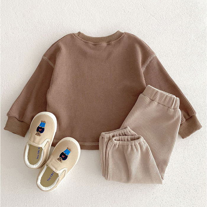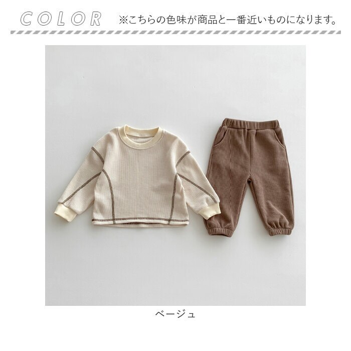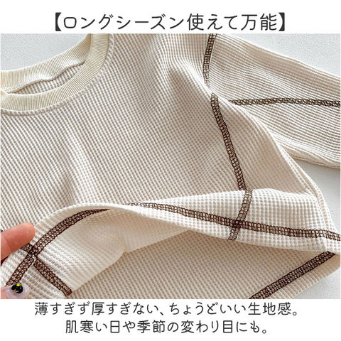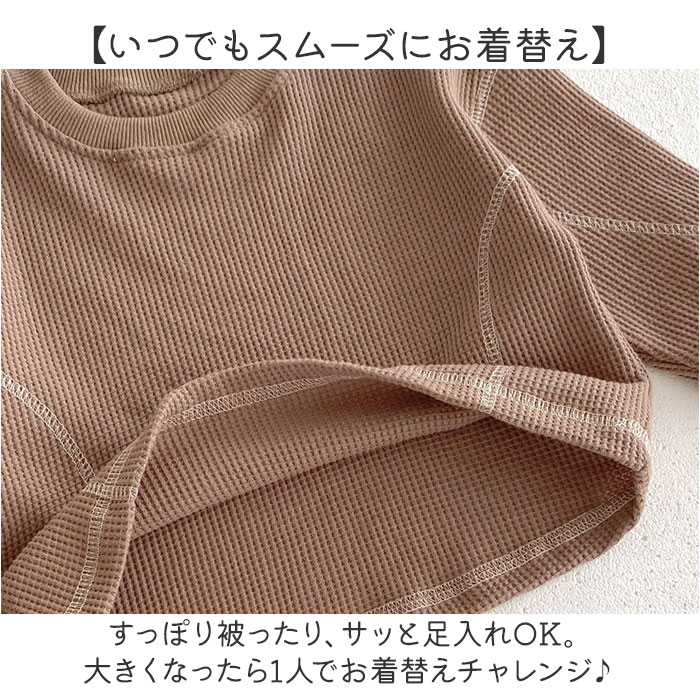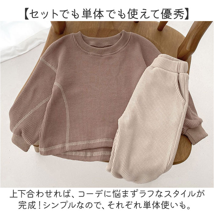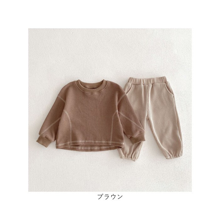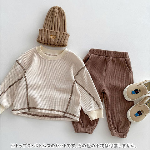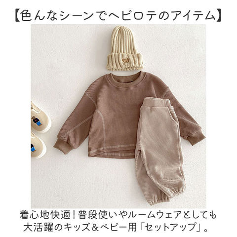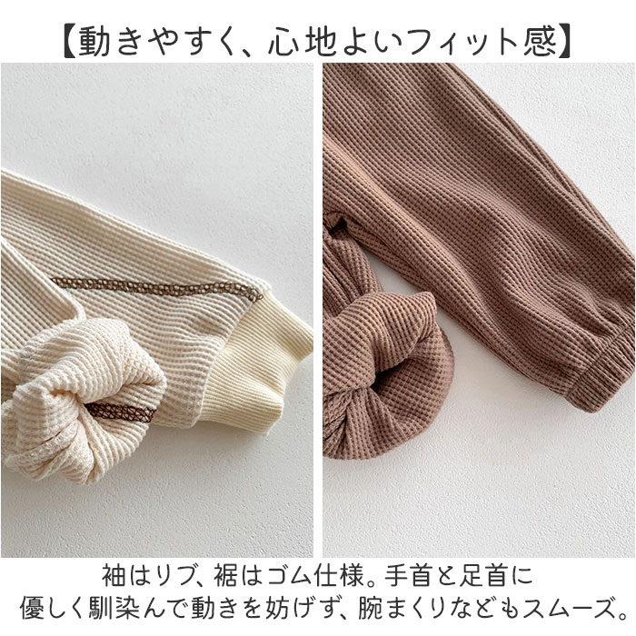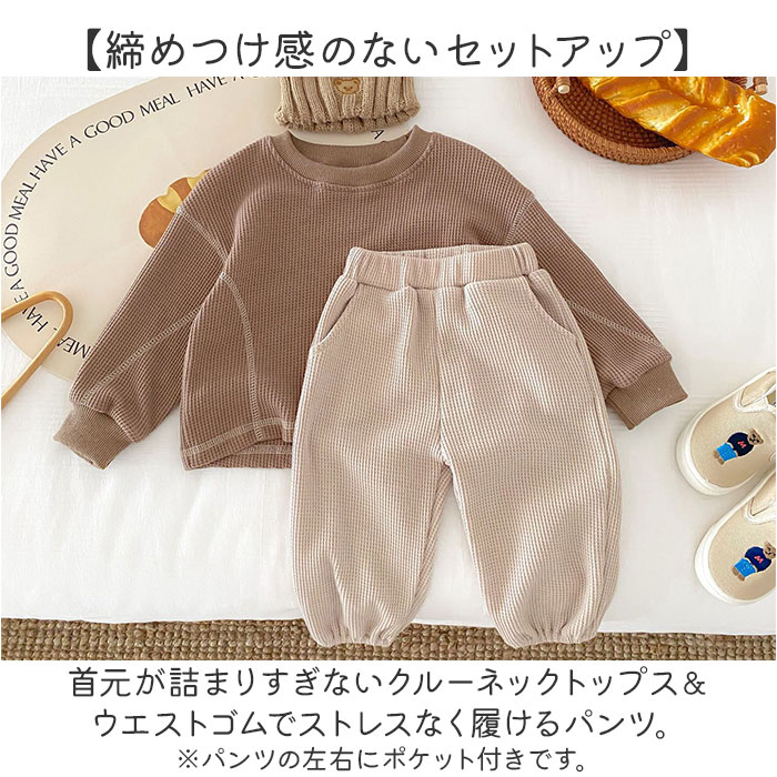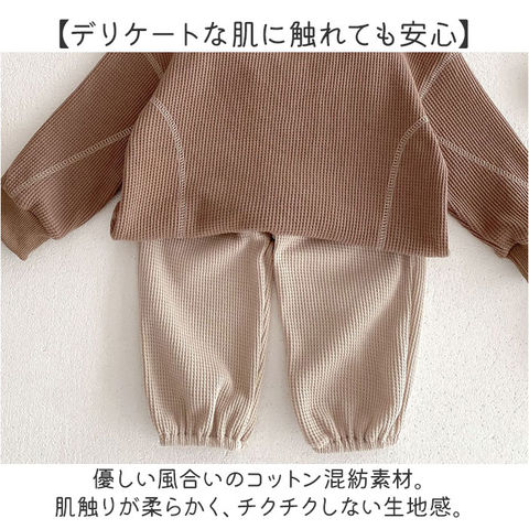 | 商品説明 | 【色んなシーンでヘビロテのアイテム】着心地快適!普段使いやルームウェアとしても大活躍のキッズ&ベビー用「セットアップ」。【締めつけ感のないセットアップ】首元が詰まりすぎないクルーネックトップス&ウエストゴムでストレスなく履けるパンツ。(※)パンツの左右にポケット付きです。【セットでも単体でも使えて優秀】上下合わせれば、コーデに悩まずラフなスタイルが完成!シンプルなので、それぞれ単体使いも。【デリケートな肌に触れても安心】優しい風合いのコットン混紡素材。肌触りが柔らかく、チクチクしない生地感。【いつでもスムーズにお着替え】すっぽり被ったり、サッと足入れOK。大きくなったら1人でお着替えチャレンジ♪【動きやすく、心地よいフィット感】袖はリブ、裾はゴム仕様。手首と足首に優しく馴染んで動きを妨げず、腕まくりなどもスムーズ。【ロングシーズン使えて万能】薄すぎず厚すぎない、ちょうどいい生地感。肌寒い日や季節の変わり目にも。【シンプル&ナチュラルなデザイン】ぽこぽこワッフル生地仕上げ。男の子も女の子も着こなせる、温かみのあるカラー。 |