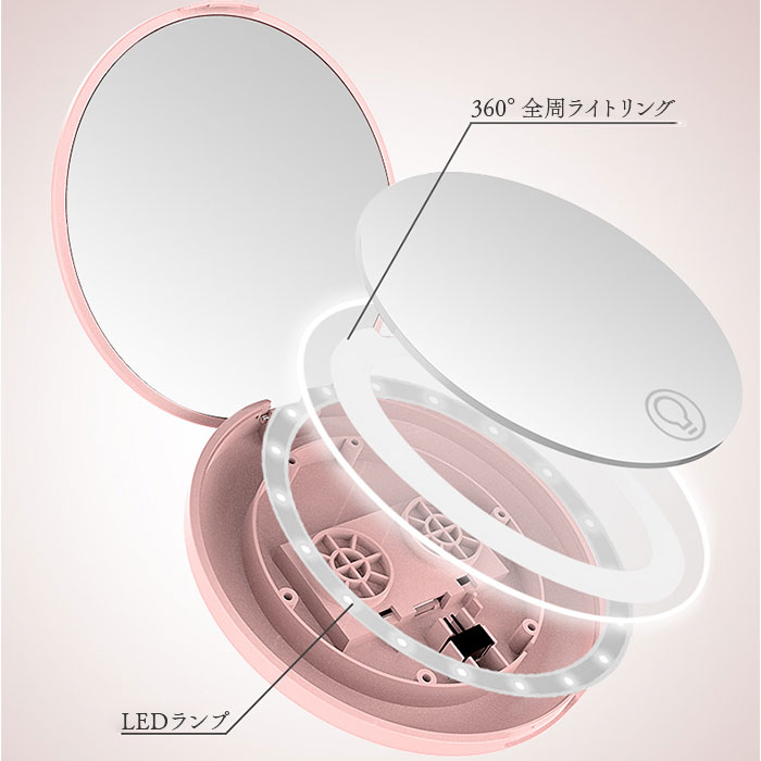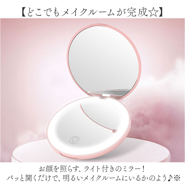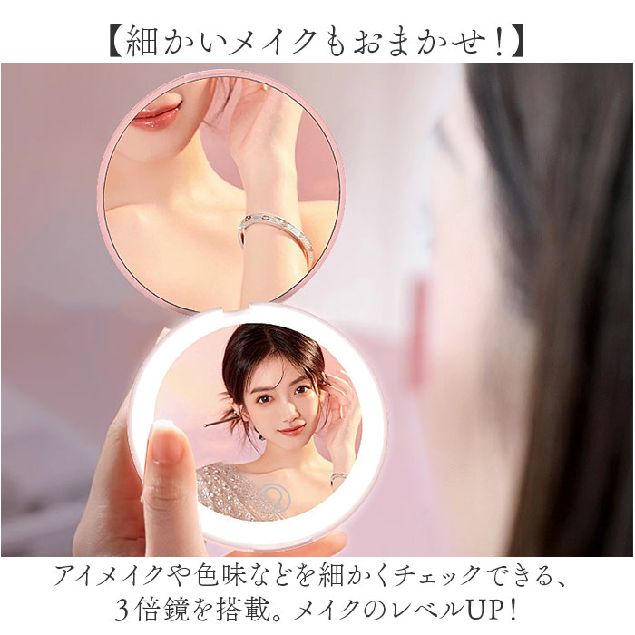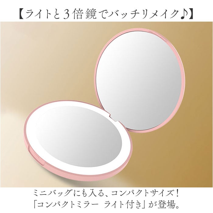 商品説明【ライトと3倍鏡でバッチリメイク♪】ミニバッグにも入る、コンパクトサイズ!「コンパクトミラー ライト付き」が登場。【どこでもメイクルームが完成☆】お顔を照らす、ライト付きのミラー!パッと開くだけで、明るいメイクルームにいるかのよう♪※ライトは、裏面のON/OFFボタンで点灯できます。【細かいメイクもおまかせ!】アイメイクや色味などを細かくチェックできる、3倍鏡を搭載。メイクのレベルUP!【毎日一緒にお出かけできる】ミニバッグにも入る、コンパクトさがポイント。お家でもお出かけ先でも大活躍!【シンプルデザインでいつでも使える】使用シーンを選ばない、シンプルさが魅力。オンもオフも気にせず使える!お好みでデコるのも◎【電池タイプでずっと使える】乾電池タイプだから、ライトが消える心配なし!繰り返し使用できる◎※CR2032 x 2個が付属します。