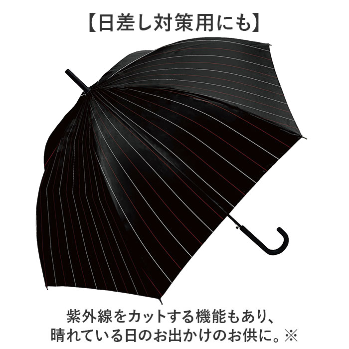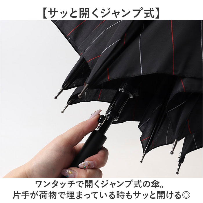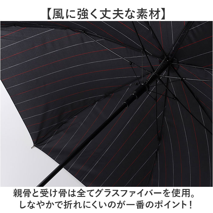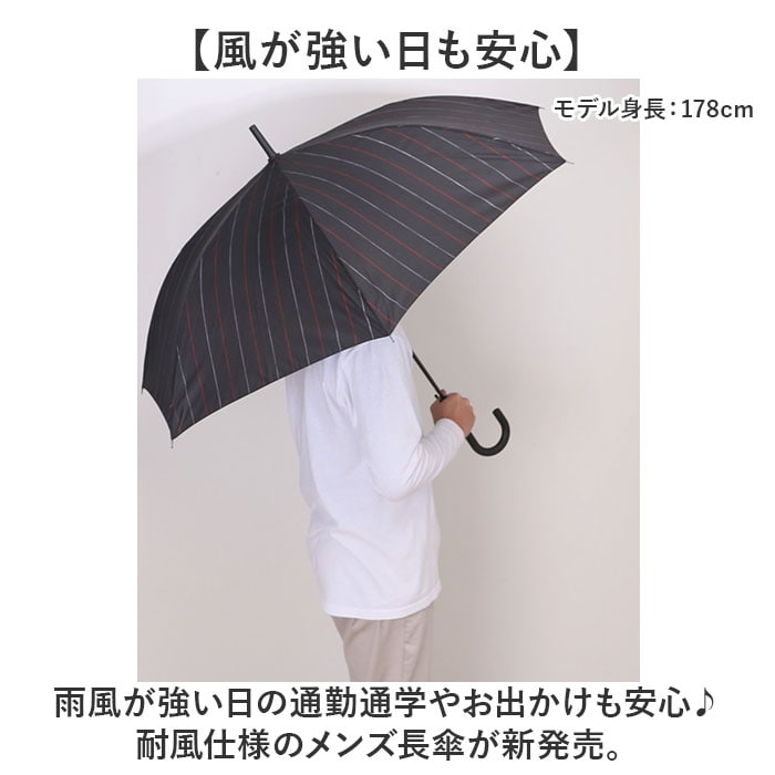 | 商品説明 | 【風が強い日も安心】雨風が強い日の通勤通学やお出かけも安心♪耐風仕様のメンズ長傘が新発売。【風に強く丈夫な素材】親骨と受け骨は全てグラスファイバーを使用。しなやかで折れにくいのが一番のポイント!【大柄な男性でも安心】男性の体もすっぽりと収まる親骨65mサイズ。開くと直径約110cmとビッグサイズ♪【サッと開くジャンプ式】ワンタッチで開くジャンプ式の傘。片手が荷物で埋まっている時もサッと開ける◎【シンプルでシーンを問わない】普段使いはもちろん、スーツや制服にも合うデザイン♪通勤通学にもオススメ♪【日差し対策用にも】紫外線をカットする機能もあり、晴れている日のお出かけのお供に。※【スナップボタン式のベルト】留めバンドは、スナップボタン仕様でパチッと留めるだけでOK。【サッと見つけてまとめやすい】留めベルトは太めの作りで見つけやすくサッとまとめやすいのもGOOD。【荷物や送迎が多い女性の方に】大きなサイズで雨からカバーしてくれるので荷物が多い時や送迎用として女性の方にも!【注意事項】※ カラーにより紫外線カット率が異なります。 |