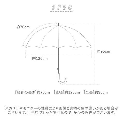 | サイズ | [親骨の長さ]約70cm/[直径]約126cm/[全長]約95cm ※サイズは当店計測の実寸サイズです。実際の商品ならびにメーカー表記サイズとは多少の誤差が生じる場合がございます。あらかじめご了承ください。 |