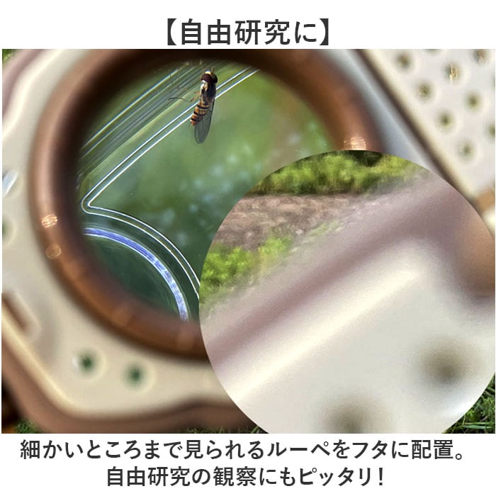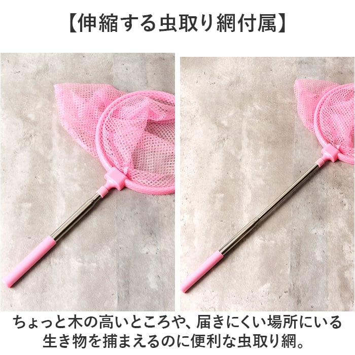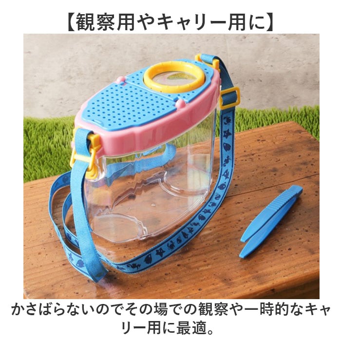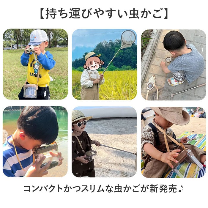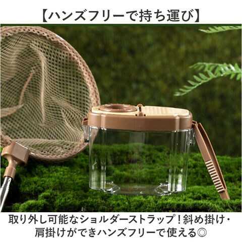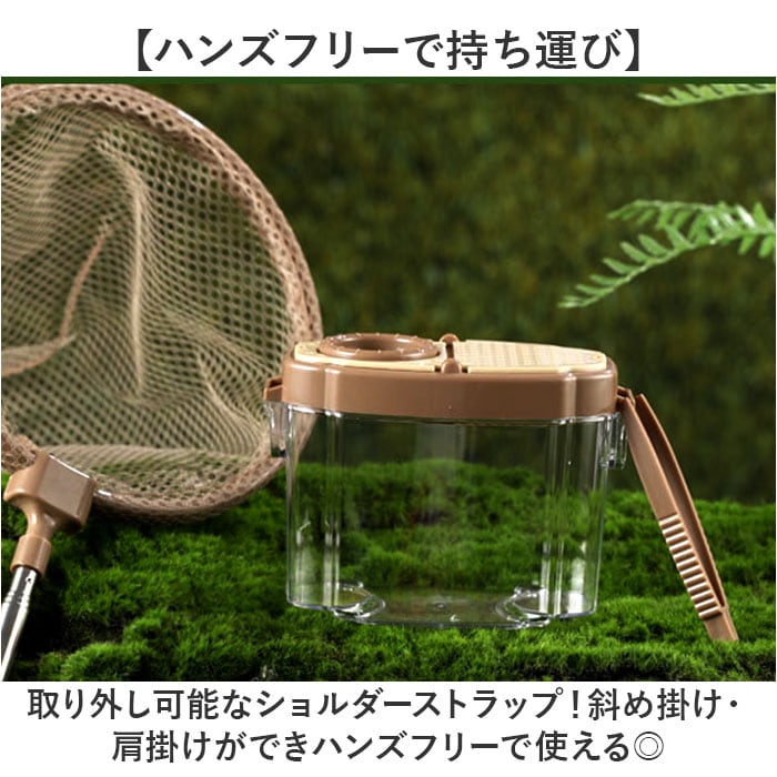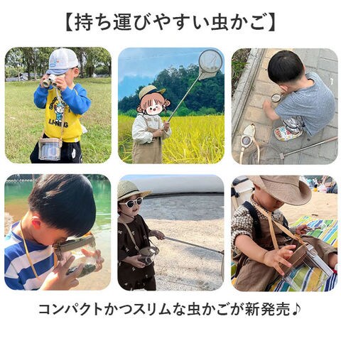 商品説明【持ち運びやすい虫かご】コンパクトかつスリムな虫かごが新発売♪【観察用やキャリー用に】かさばらないのでその場での観察や一時的なキャリー用に最適。【自由研究に】細かいところまで見られるルーペをフタに配置。自由研究の観察にもピッタリ!【通気性あり】採取した生き物が息苦しくならないよう、酸素を取り込める通気口。【フタの取り外しOK】使い終わった後の掃除や、生き物を逃がしやすいよう、フタの取り外しが可能。【伸縮する虫取り網付属】ちょっと木の高いところや、届きにくい場所にいる生き物を捕まえるのに便利な虫取り網。【ハンズフリーで持ち運び】取り外し可能なショルダーストラップ!斜め掛け・肩掛けができハンズフリーで使える◎
