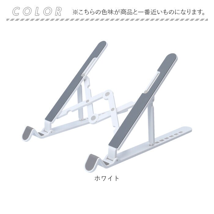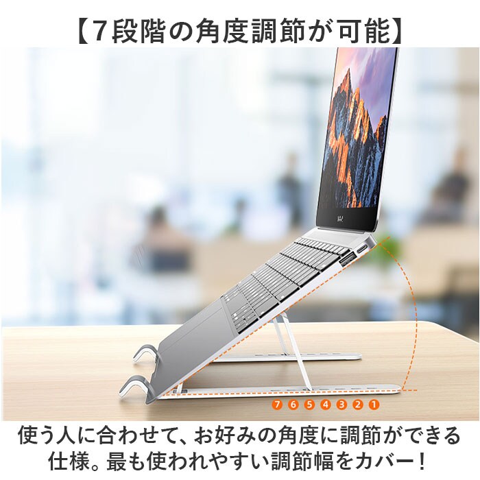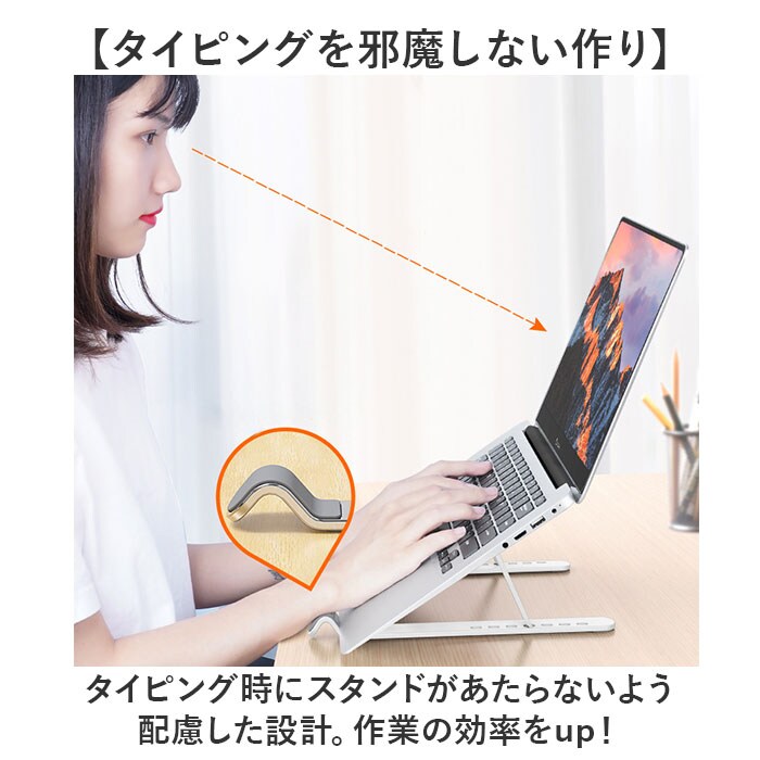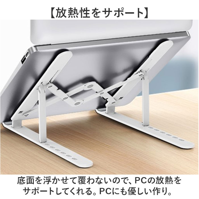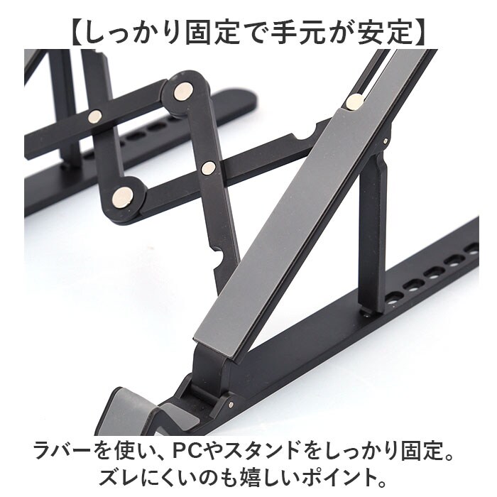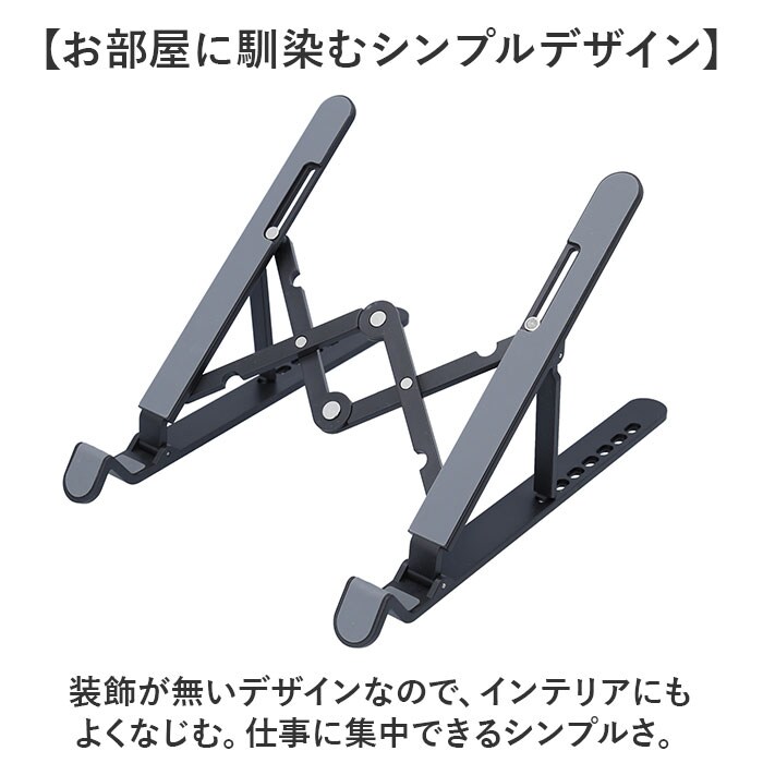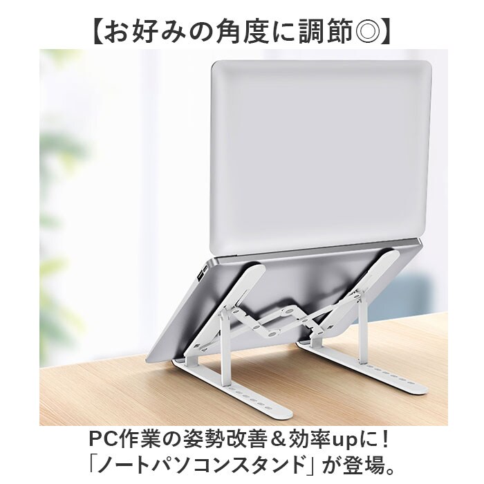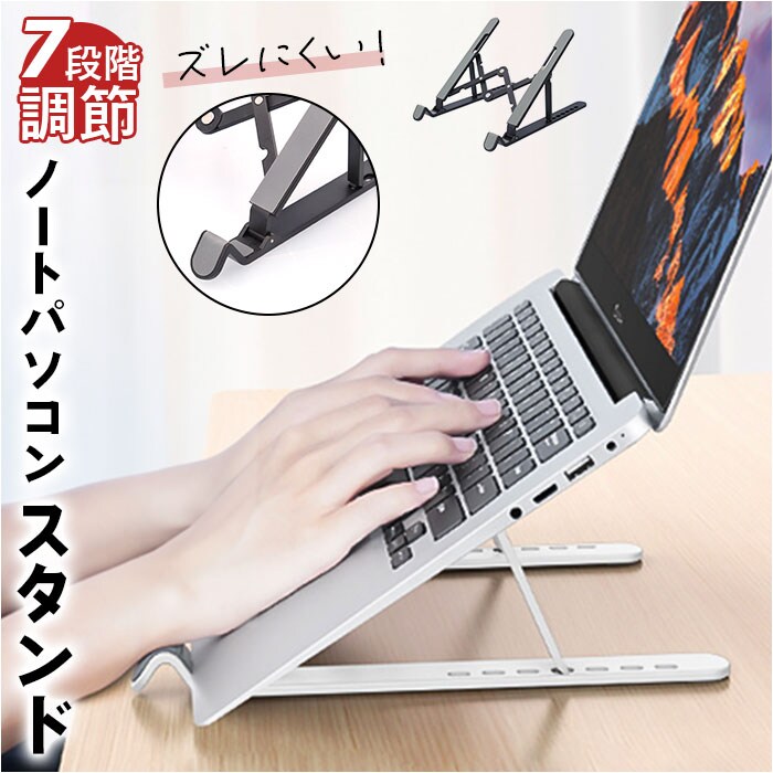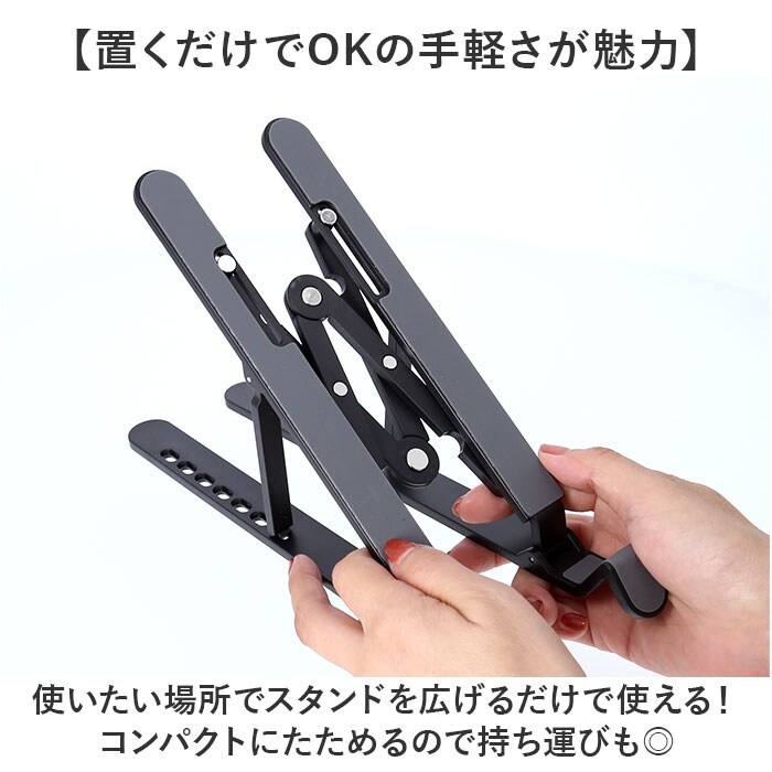 | 商品説明 | 【お好みの角度に調節◎】PC作業の姿勢改善&効率upに!「ノートパソコンスタンド」が登場。【7段階の角度調節が可能】使う人に合わせて、お好みの角度に調節ができる仕様。最も使われやすい調節幅をカバー!【タイピングを邪魔しない作り】タイピング時にスタンドがあたらないよう配慮した設計。作業の効率をup!【しっかり固定で手元が安定】ラバーを使い、PCやスタンドをしっかり固定。ズレにくいのも嬉しいポイント。【置くだけでOKの手軽さが魅力】使いたい場所でスタンドを広げるだけで使える!コンパクトにたためるので持ち運びも◎【放熱性をサポート】底面を浮かせて覆わないので、PCの放熱をサポートしてくれる。PCにも優しい作り。【お部屋に馴染むシンプルデザイン】装飾が無いデザインなので、インテリアにもよくなじむ。仕事に集中できるシンプルさ。【マルチに使えるアイテム】PCだけでなく、タブレットやスマホ、ブックスタンドとしても大活躍! |
