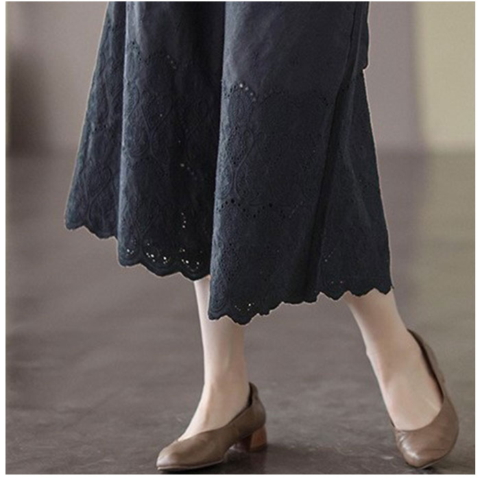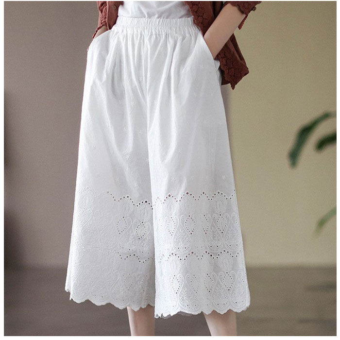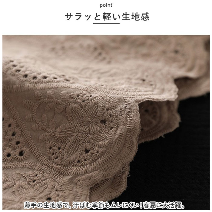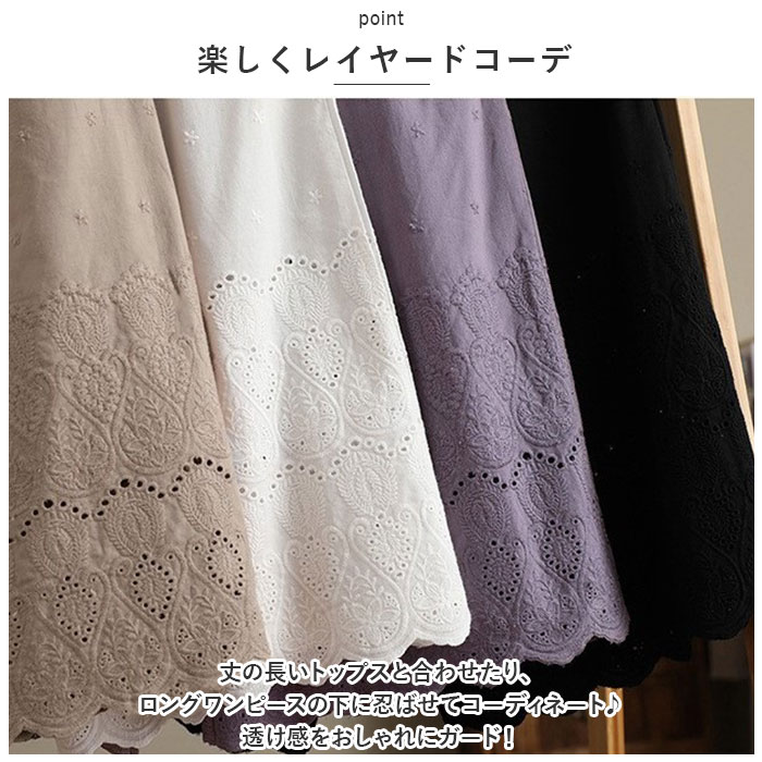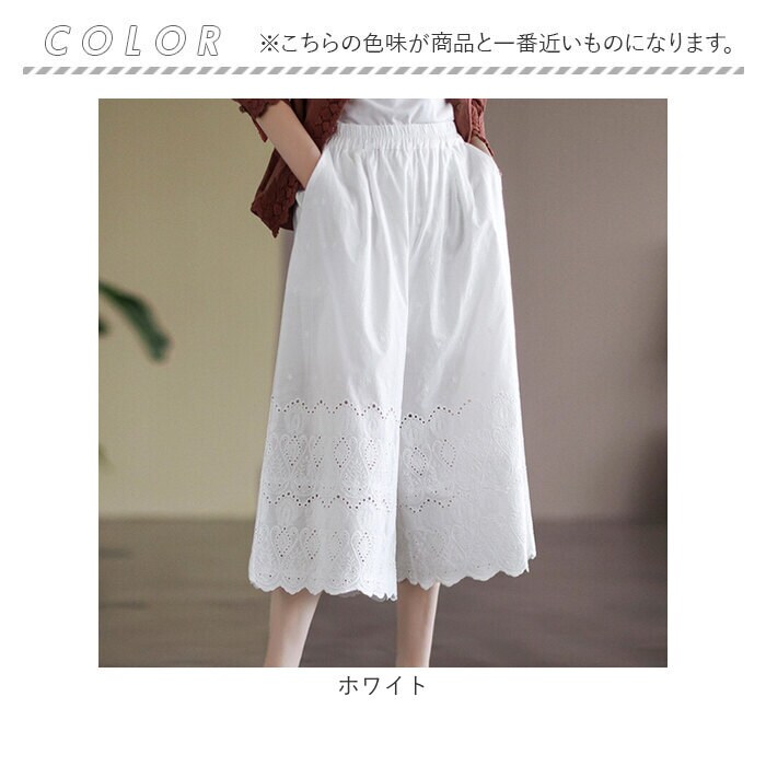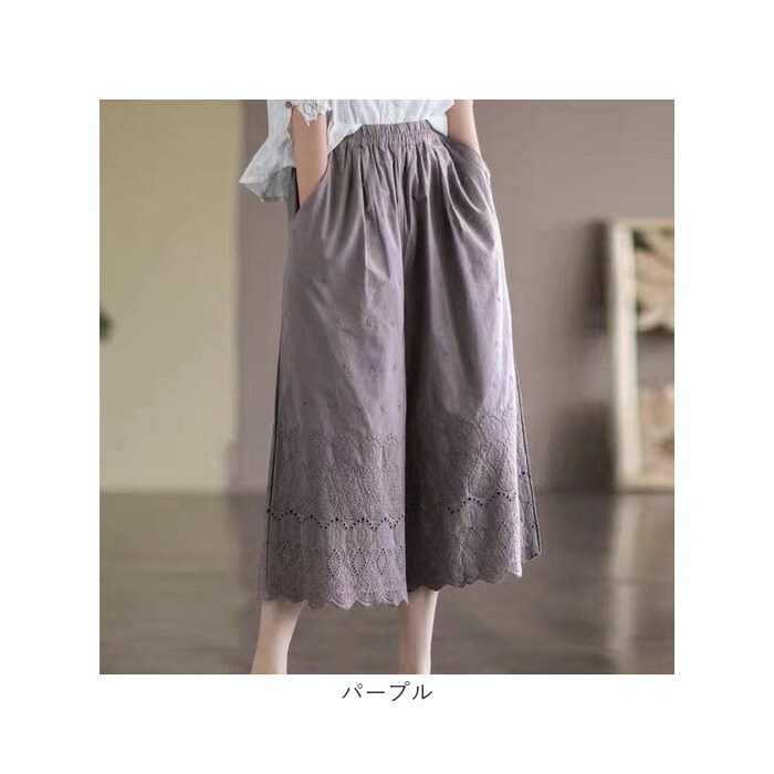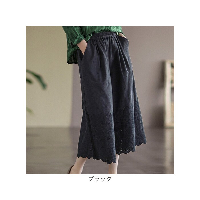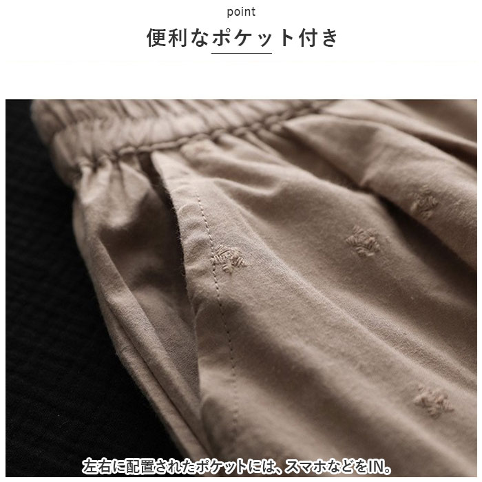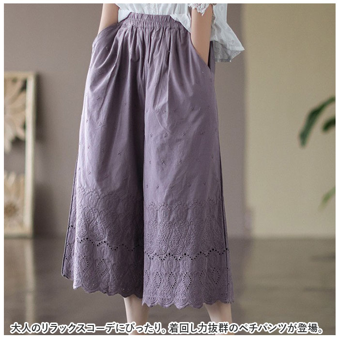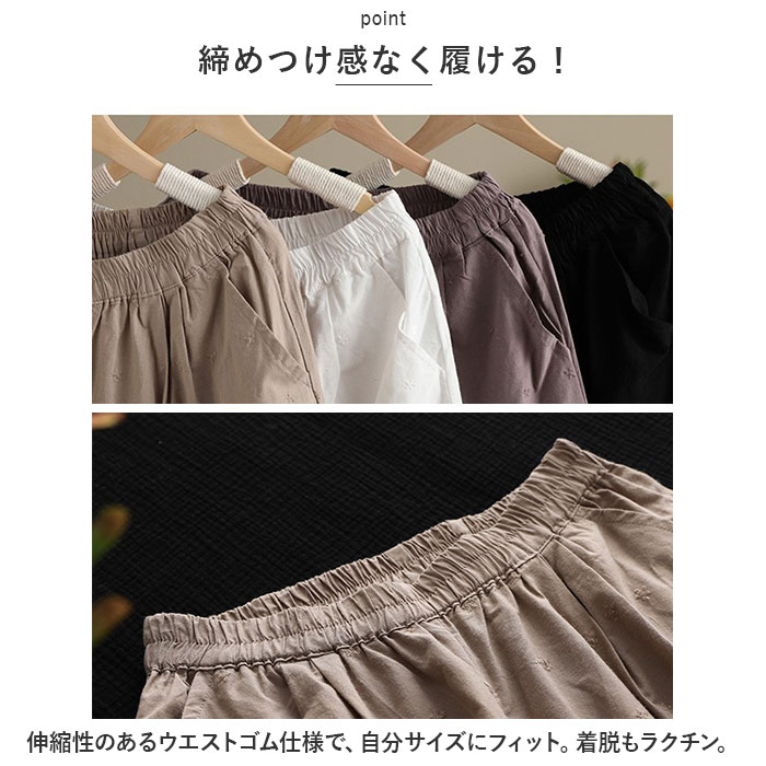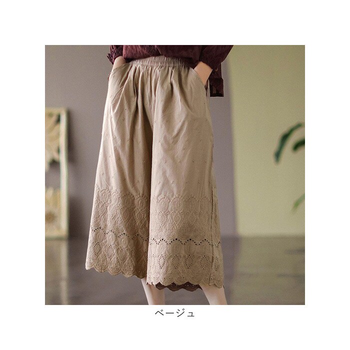| 商品説明 | 大人のリラックスコーデにぴったり。着回し力抜群のペチパンツが登場。【大人可愛い、涼しげなデザイン】ナチュラルな風合いの生地に、刺繍や型抜き、裾部分のスカラップデザインをプラス。ガーリーな雰囲気がありつつ、甘すぎない印象に。【締めつけ感なく履ける!】伸縮性のあるウエストゴム仕様で、自分サイズにフィット。着脱もラクチン。【ゆったりワイドタイプ】体のラインを拾いにくいワイドパンツ。気になる太ももまわりなどもカバーできちゃうのが、嬉しいポイント◎【サラッと軽い生地感】薄手の生地感で、汗ばむ季節もムレにくい!春夏に大活躍。【便利なポケット付き】左右に配置されたポケットには、スマホなどをIN。【楽しくレイヤードコーデ】丈の長いトップスと合わせたり、ロングワンピースの下に忍ばせてコーディネート♪透け感をおしゃれにガード! |