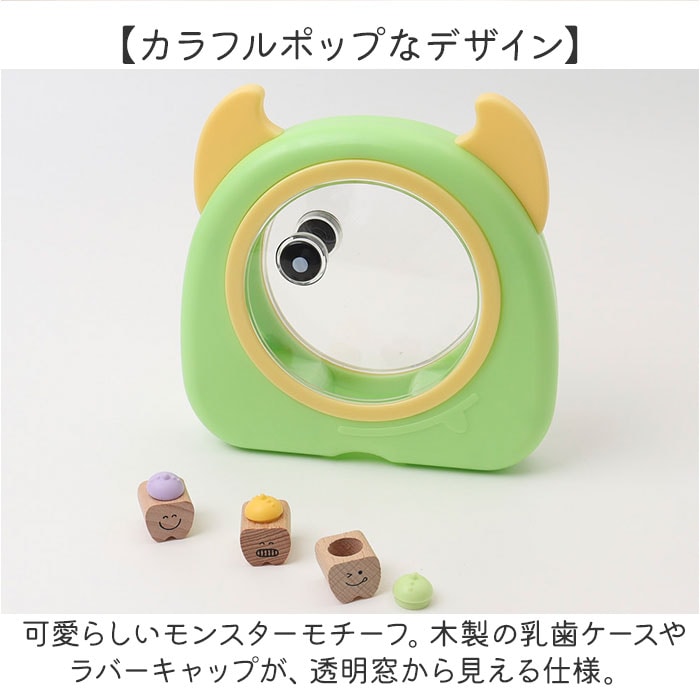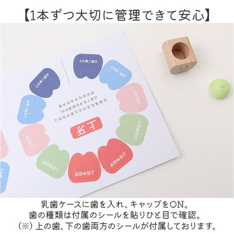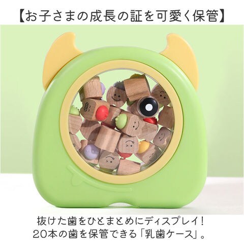 | 商品説明 | 【お子さまの成長の証を可愛く保管】抜けた歯をひとまとめにディスプレイ!20本の歯を保管できる「乳歯ケース」。【カラフルポップなデザイン】可愛らしいモンスターモチーフ。木製の乳歯ケースやラバーキャップが、透明窓から見える仕様。【1本ずつ大切に管理できて安心】乳歯ケースに歯を入れ、キャップをON。歯の種類は付属のシールを貼りひと目で確認。(※)上の歯、下の歯両方のシールが付属しております。【作業がラクになるアイテム付き】乳歯の固定や深さ調整に便利な脱脂綿、歯を掴むピンセットが付属。【幸せに育つように願いを込めて】産毛を入れておけるミニボトルと、願いを書き込めるウィッシングペーパー。乳歯と一緒に保管。【生まれた日の記録を一緒に】名前や誕生日など、お子さまのプロフィールを書き込めるシート付き。 |