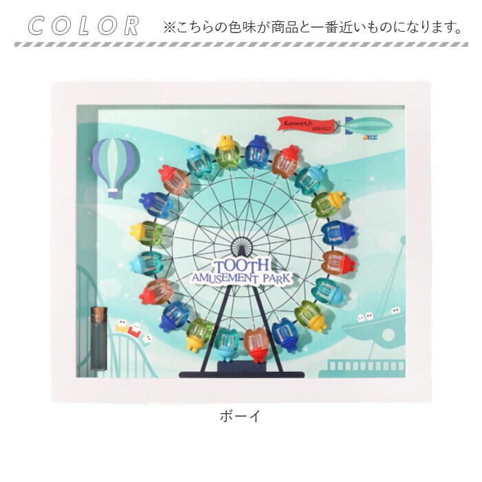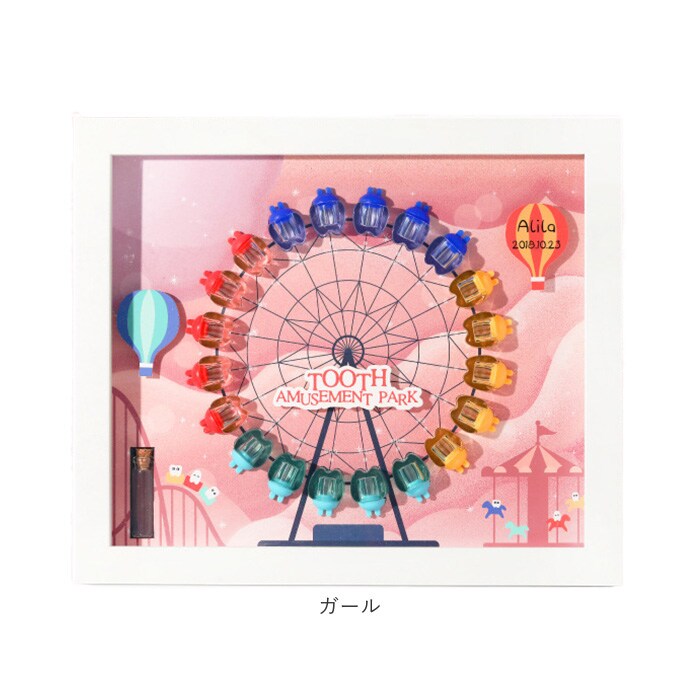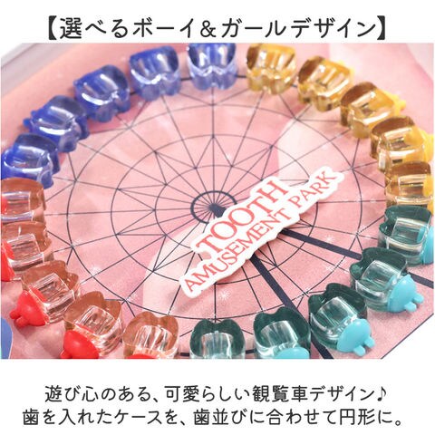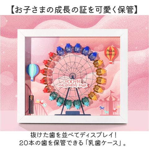| 商品説明 | 【お子さまの成長の証を可愛く保管】抜けた歯を並べてディスプレイ!20本の歯を保管できる「乳歯ケース」。【1本ずつ大切に管理できて安心】乳歯ケースに歯を入れ、キャップをON。歯の種類は付属のシールを貼りひと目で確認。(※1)上の歯、下の歯両方のシールが付属しております。抜けた日付も記入できます。【選べるボーイ&ガールデザイン】遊び心のある、可愛らしい観覧車デザイン♪歯を入れたケースを、歯並びに合わせて円形に。【作業がラクになるアイテム付き】乳歯の固定や深さ調整に便利な脱脂綿、歯を掴むピンセットが付属。【幸せに育つように願いを込めて】産毛を入れておけるミニボトルと、願いを書き込めるウィッシングペーパー。乳歯と一緒に保管。【お好みの位置に装飾OK】装飾用のモチーフも付属。セットで付いている両面テープを使って、好きな位置に貼り付け。(※2)装飾用のモチーフに、お子さまの名前や誕生日などを書くことも可能です。【立てかけも壁掛けもできる2way】背面のスタンドを使って飾っても良し、フックを使って壁掛けも。お好きな飾り方をチョイス。 |