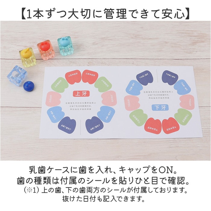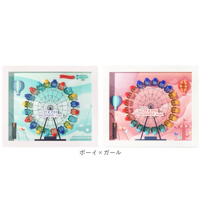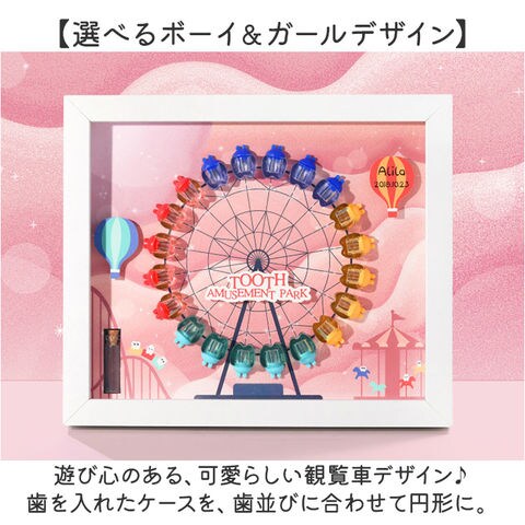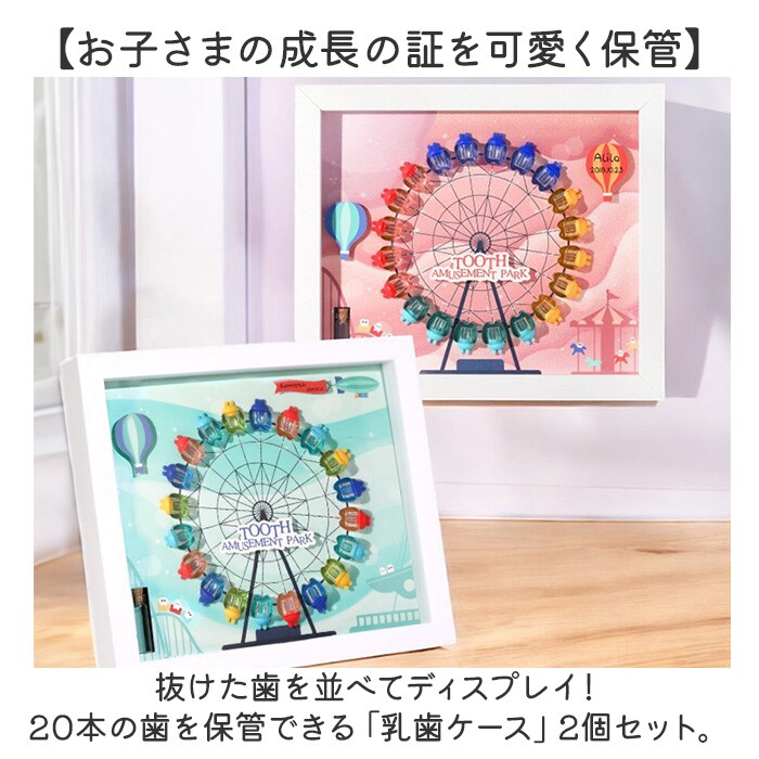 | 商品説明 | 【お子さまの成長の証を可愛く保管】抜けた歯を並べてディスプレイ!20本の歯を保管できる「乳歯ケース」2個セット。【1本ずつ大切に管理できて安心】乳歯ケースに歯を入れ、キャップをON。歯の種類は付属のシールを貼りひと目で確認。(※1)上の歯、下の歯両方のシールが付属しております。抜けた日付も記入できます。【選べるボーイ&ガールデザイン】遊び心のある、可愛らしい観覧車デザイン♪歯を入れたケースを、歯並びに合わせて円形に。【作業がラクになるアイテム付き】乳歯の固定や深さ調整に便利な脱脂綿、歯を掴むピンセットが付属。【幸せに育つように願いを込めて】産毛を入れておけるミニボトルと、願いを書き込めるウィッシングペーパー。乳歯と一緒に保管。【お好みの位置に装飾OK】装飾用のモチーフも付属。セットで付いている両面テープを使って、好きな位置に貼り付け。(※2)装飾用のモチーフに、お子さまの名前や誕生日などを書くことも可能です。【立てかけも壁掛けもできる2way】背面のスタンドを使って飾っても良し、フックを使って壁掛けも。お好きな飾り方をチョイス。【兄弟・姉妹で使える2個セット】お子さま1人1人の成長を、しっかり管理◎双子ちゃんにもおすすめ! |