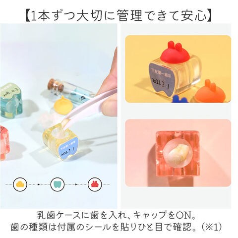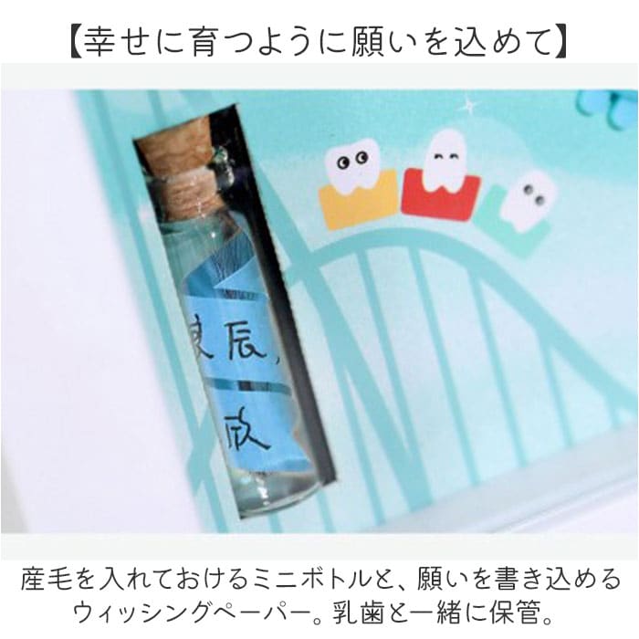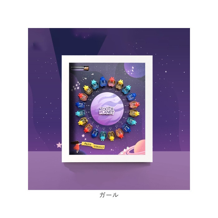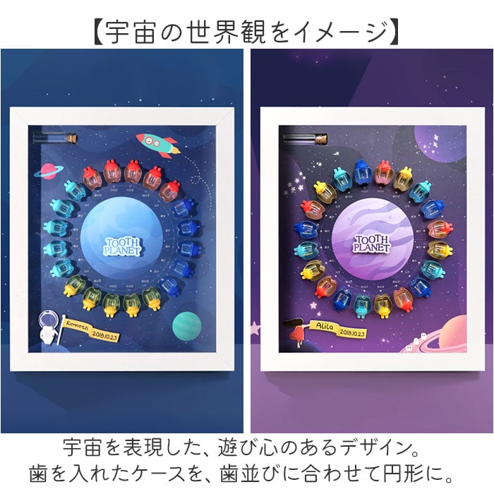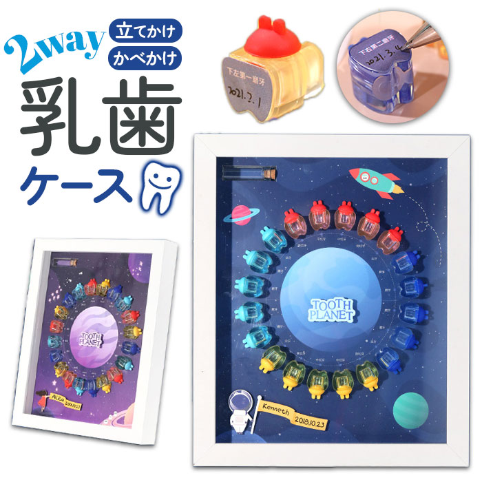 | 商品説明 | 【お子さまの成長の証を可愛く保管】抜けた歯を並べてディスプレイ!20本の歯を保管できる「乳歯ケース」。【1本ずつ大切に管理できて安心】乳歯ケースに歯を入れ、キャップをON。歯の種類は付属のシールを貼りひと目で確認。(※1)上の歯、下の歯両方のシールが付属しております。【宇宙の世界観をイメージ】宇宙を表現した、遊び心のあるデザイン。歯を入れたケースを、歯並びに合わせて円形に。【作業がラクになるアイテム付き】乳歯の固定や深さ調整に便利な脱脂綿、歯を掴むピンセットが付属。【幸せに育つように願いを込めて】産毛を入れておけるミニボトルと、願いを書き込めるウィッシングペーパー。乳歯と一緒に保管。【お好みの位置に装飾OK】装飾用のモチーフも付属。セットで付いている両面テープを使って、好きな位置に貼り付け。(※2)装飾用のモチーフに、お子さまの名前や誕生日などを書くことも可能です。【立てかけも壁掛けもできる2way】背面のスタンドを使って飾っても良し、フックを使って壁掛けも。お好きな飾り方をチョイス。 |