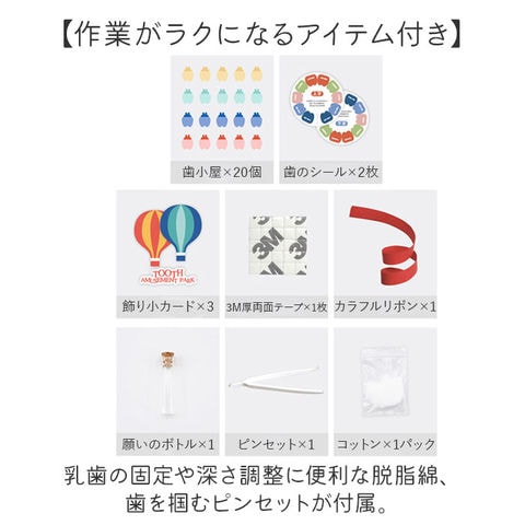 | 注意点 | [付属品]歯ケース x 20個、歯ステッカー x 2枚、装飾カード x 1セット、両面テープ x 1枚、ボトル x 1本、ピンセット x 1個、綿 x 1枚長時間日光にあたったり、摩擦、水漏れなどによる色落ちや色移りすることがあります。お取り扱いの際は、商品やパッケージなどに記載されている品質表示、アテンションタグ、ご使用上の注意事項などを必ずご確認下さい。本来の目的以外にはご使用にならないで下さい。カメラやモニターの性質により、画像と実物の色の違いがある場合がございますのでご理解願います。 |