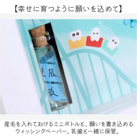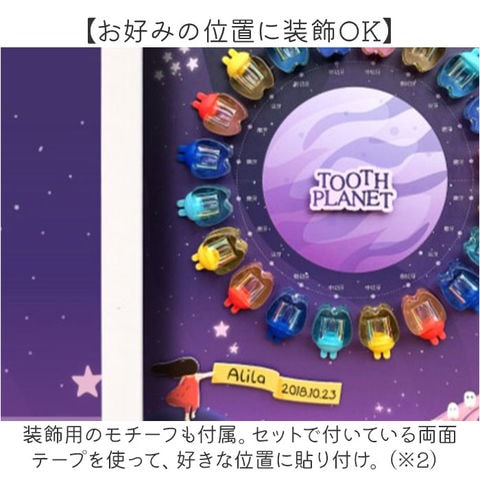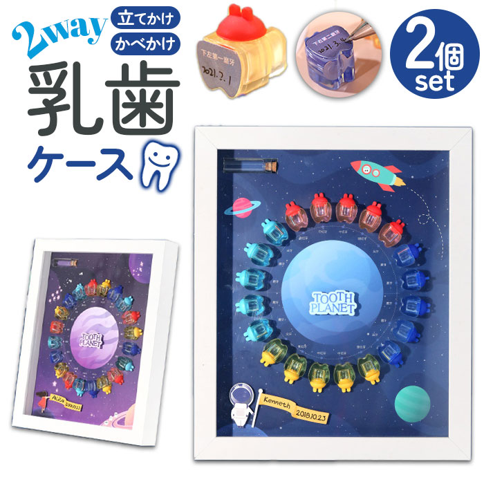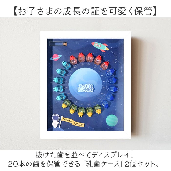 | 商品説明 | 【お子さまの成長の証を可愛く保管】抜けた歯を並べてディスプレイ!20本の歯を保管できる「乳歯ケース」2個セット。【1本ずつ大切に管理できて安心】乳歯ケースに歯を入れ、キャップをON。歯の種類は付属のシールを貼りひと目で確認。(※1)上の歯、下の歯両方のシールが付属しております。【宇宙の世界観をイメージ】宇宙を表現した、遊び心のあるデザイン。歯を入れたケースを、歯並びに合わせて円形に。【作業がラクになるアイテム付き】乳歯の固定や深さ調整に便利な脱脂綿、歯を掴むピンセットが付属。【幸せに育つように願いを込めて】産毛を入れておけるミニボトルと、願いを書き込めるウィッシングペーパー。乳歯と一緒に保管。【お好みの位置に装飾OK】装飾用のモチーフも付属。セットで付いている両面テープを使って、好きな位置に貼り付け。(※2)装飾用のモチーフに、お子さまの名前や誕生日などを書くことも可能です。【立てかけも壁掛けもできる2way】背面のスタンドを使って飾っても良し、フックを使って壁掛けも。お好きな飾り方をチョイス。【兄弟・姉妹で使える2個セット】お子さま1人1人の成長を、しっかり管理◎双子ちゃんにもおすすめ! |