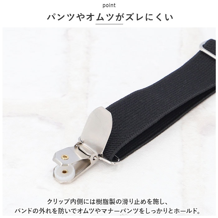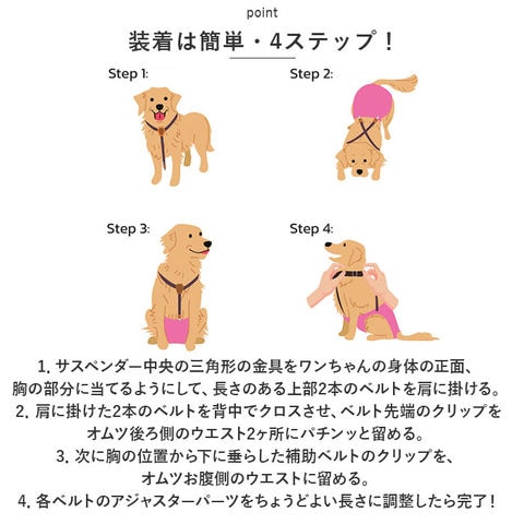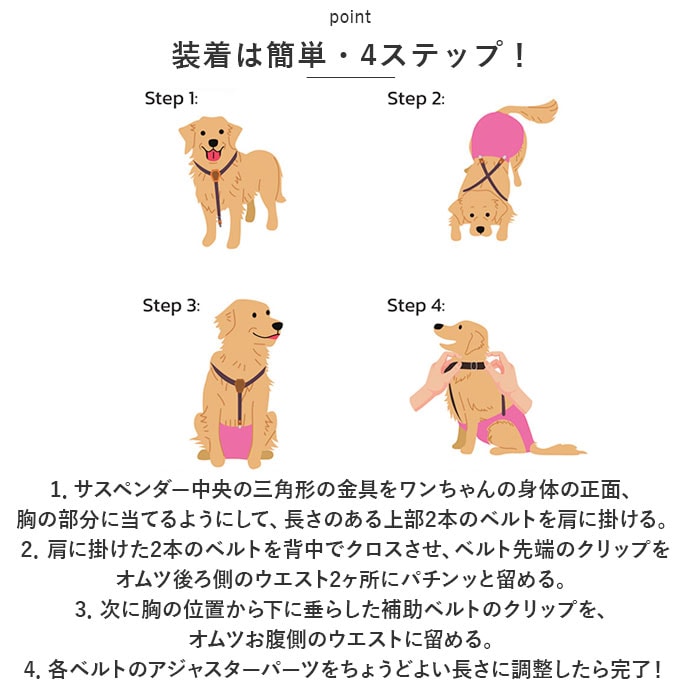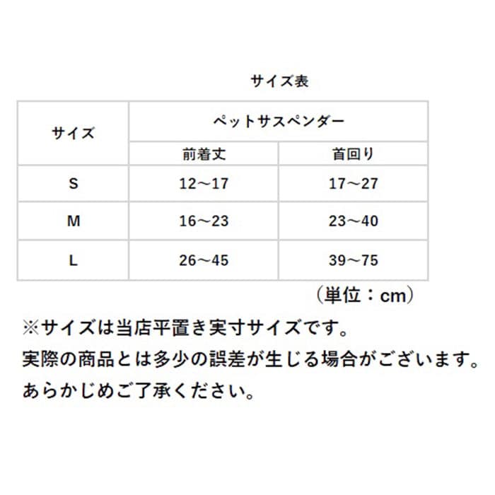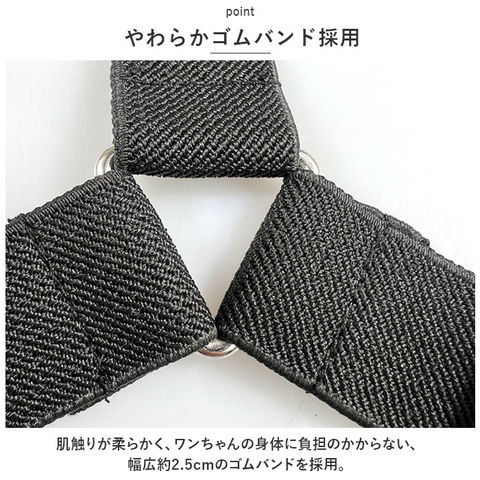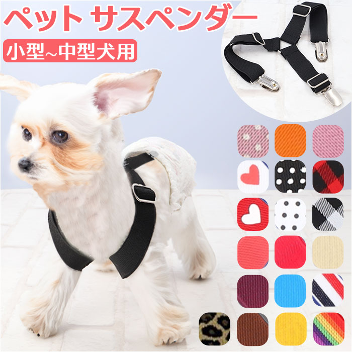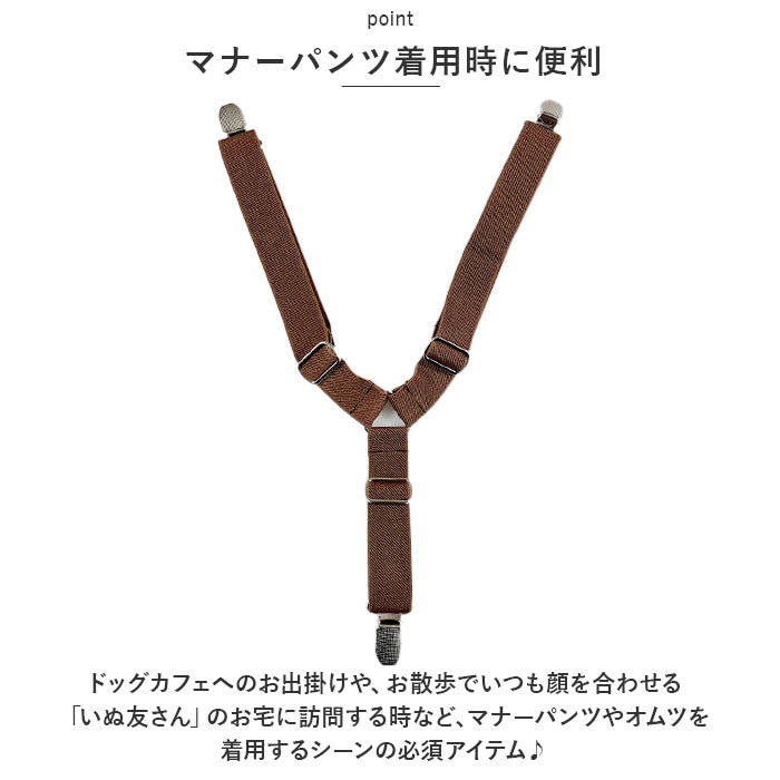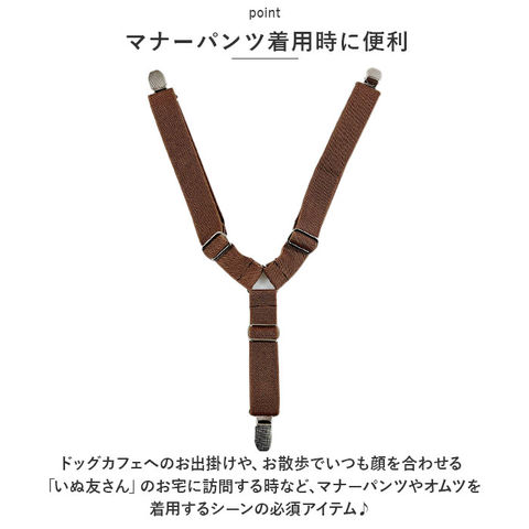 | 商品説明 | お出掛け中のオムツのズレ、もう気にならない!お洒落で実用的なペット用サスペンダー。【マナーパンツ着用時に便利】ドッグカフェへのお出掛けや、お散歩でいつも顔を合わせる「いぬ友さん」のお宅に訪問する時など、マナーパンツやオムツを着用するシーンの必須アイテム♪【装着は簡単・4ステップ!】1.サスペンダー中央の三角形の金具をワンちゃんの身体の正面、胸の部分に当てるようにして、長さのある上部2本のベルトを肩に掛ける。2.肩に掛けた2本のベルトを背中でクロスさせ、ベルト先端のクリップをオムツ後ろ側のウエスト2ヶ所にパチンッと留める。3.次に胸の位置から下に垂らした補助ベルトのクリップを、オムツお腹側のウエストに留める。4.各ベルトのアジャスターパーツをちょうどよい長さに調整したら完了!【やわらかゴムバンド採用】肌触りが柔らかく、ワンちゃんの身体に負担のかからない、幅広約2.5cmのゴムバンドを採用。【パンツやオムツがズレにくい】クリップ内側には樹脂製の滑り止めを施し、バンドの外れを防いでオムツやマナーパンツをしっかりとホールド。【アジャスターパーツで調節自在】・3ヶ所のアジャスターパーツで、ベルトの長さをワンちゃんの身体にフィットするサイズに調節可能。【ぴったりサイズをチョイス!】S・M・Lサイズの3つのサイズの中から、ぴったりサイズがチョイス可能!超小型犬から中型のワンちゃんに最適なサイズ感。【お散歩が楽しくなるデザイン】ペットウェアやマナーパンツのデザインに合わせてコーディネート自在!種類豊富なパターン柄と色鮮やかなカラーバリエーションも魅力のひとつ。 |