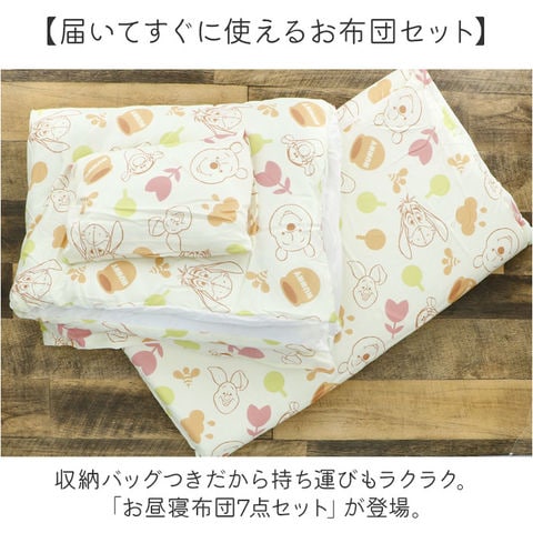| 商品説明 | 【届いてすぐに使えるお布団セット】収納バッグつきだから持ち運びもラクラク。「お昼寝布団7点セット」が登場。【全部が揃う、7点セット】掛け敷き布団、まくら、各カバー、収納バッグの7点セット。いつでもどこでもお昼寝空間に◎【家はもちろん、保育園やお出かけに】ひとまとめにできる収納バッグつき!手軽に持ち運べるから、登園や旅行などにも持ち出しOK。【コンパクトに収納できる】敷き布団は3つ折りでコンパクトにたためる作り。厚さは約2cmあり身体を支えてくれる。【ふっくらお布団でリラックス】ほどよいボリューム感が気持ちいい、ソフトタッチの掛け布団。サラっとやわらかい肌触り。【お洗濯がしやすいファスナーカバー】面倒なカバーの着脱がスムーズにできる、ファスナー開閉。丸洗いできるからいつでも清潔に!【ネームタグつきが嬉しいポイント】収納バッグにはお名前を書き込めるタグを採用。登園や外出先でも安心の仕様。【みんな大好きなキャラクターたち☆】お昼寝気分をUPしてくれる、可愛いキャラクターデザインをご用意。お気に入りをチョイス! |
