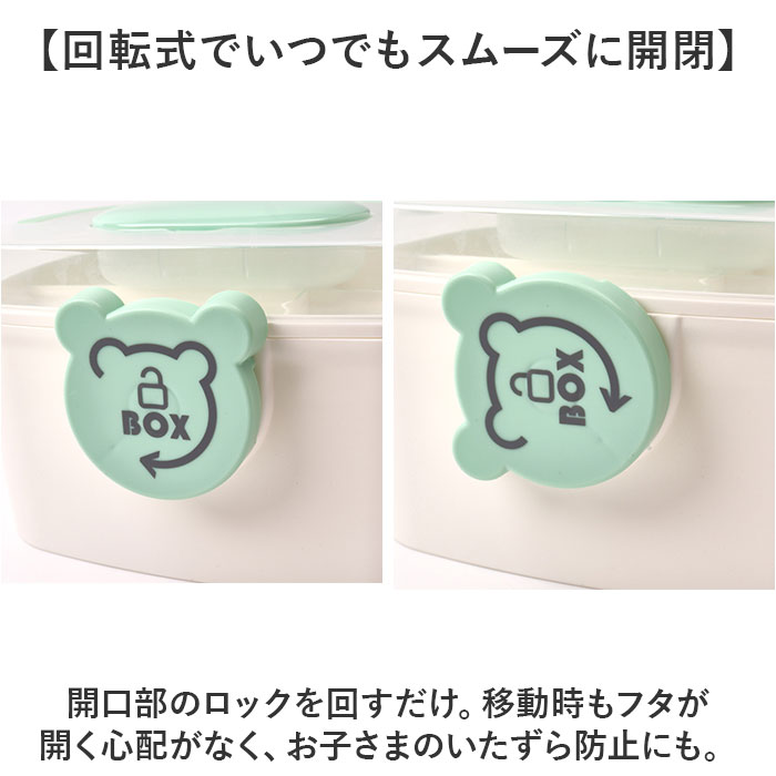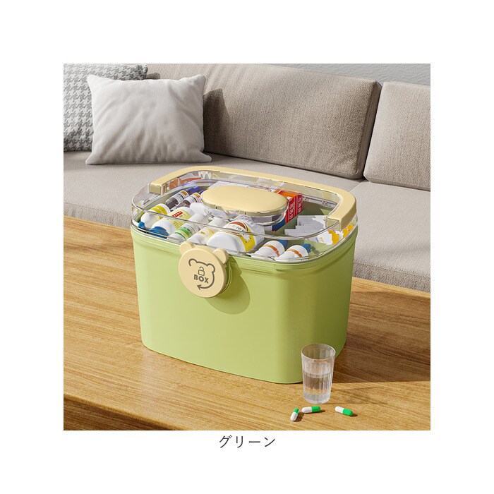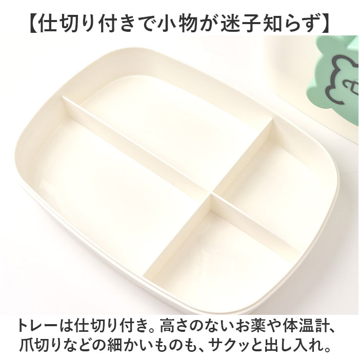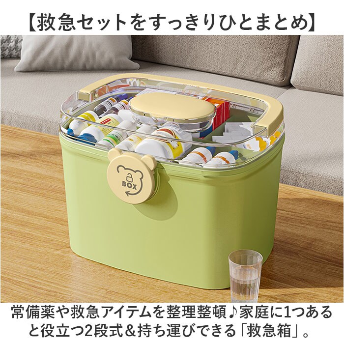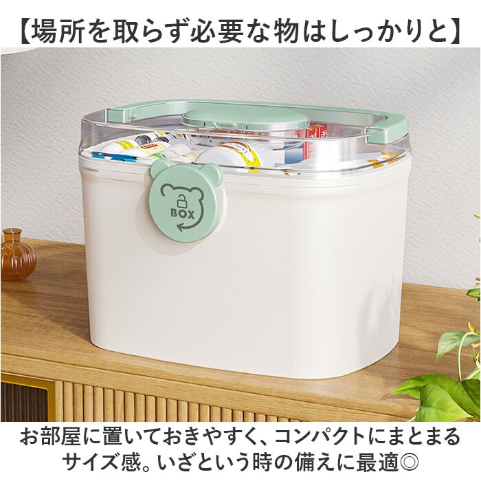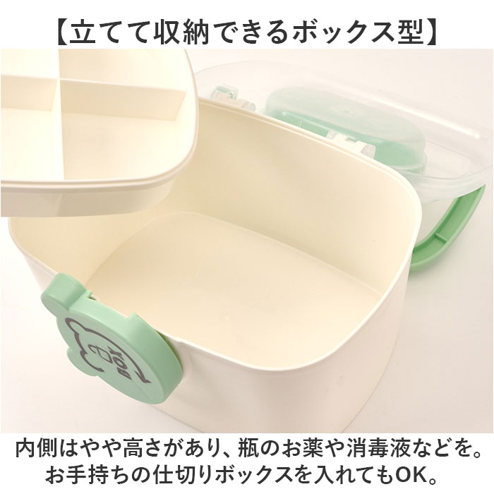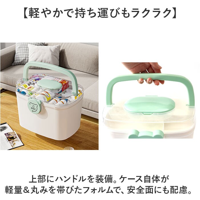 | 商品説明 | 【救急セットをすっきりひとまとめ】常備薬や救急アイテムを整理整頓♪家庭に1つあると役立つ2段式&持ち運びできる「救急箱」。【場所を取らず必要な物はしっかりと】お部屋に置いておきやすく、コンパクトにまとまるサイズ感。いざという時の備えに最適◎【回転式でいつでもスムーズに開閉】開口部のロックを回すだけ。移動時もフタが開く心配がなく、お子さまのいたずら防止にも。【立てて収納できるボックス型】内側はやや高さがあり、瓶のお薬や消毒液などを。お手持ちの仕切りボックスを入れてもOK。【仕切り付きで小物が迷子知らず】トレーは仕切り付き。高さのないお薬や体温計、爪切りなどの細かいものも、サクッと出し入れ。【+@で使用頻度の高いアイテムを】フタ上部にもミニサイズの収納スペースを配置。絆創膏やよく飲むお薬を入れておけて便利。【軽やかで持ち運びもラクラク】上部にハンドルを装備。ケース自体が軽量&丸みを帯びたフォルムで、安全面にも配慮。【ナチュラルで可愛らしいデザイン】柔らかなカラーリングに、クマさん型のロックがポイント!デコレーションできるシール付き。 |