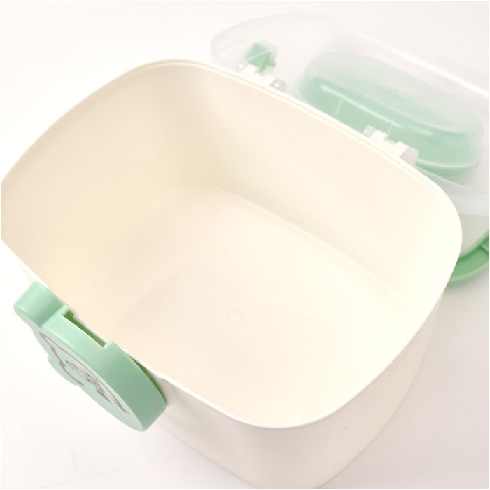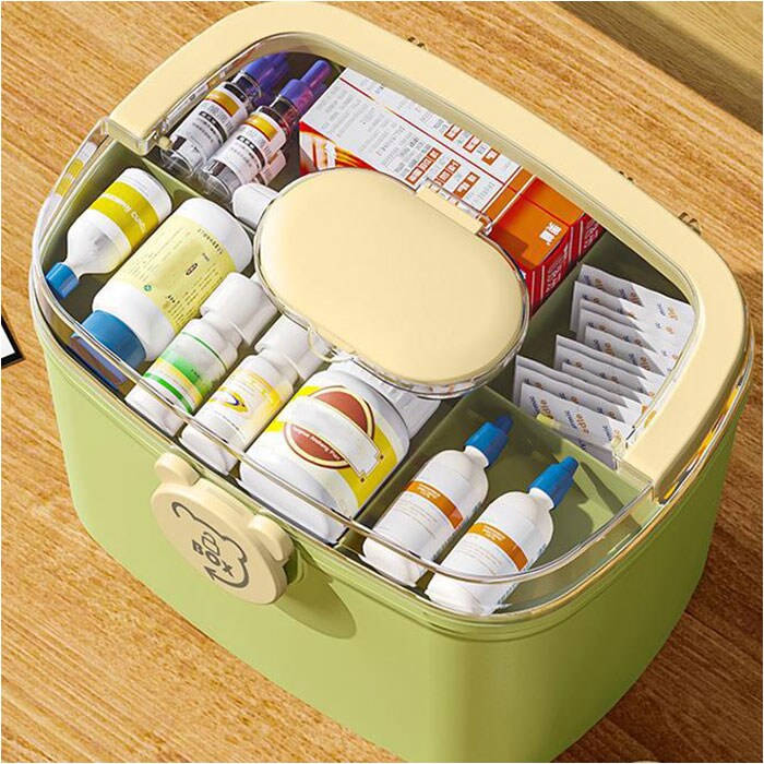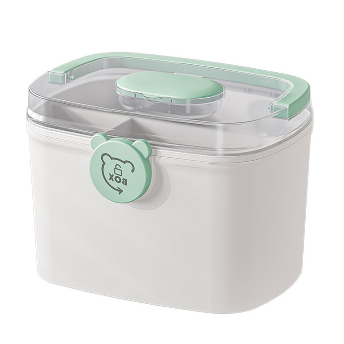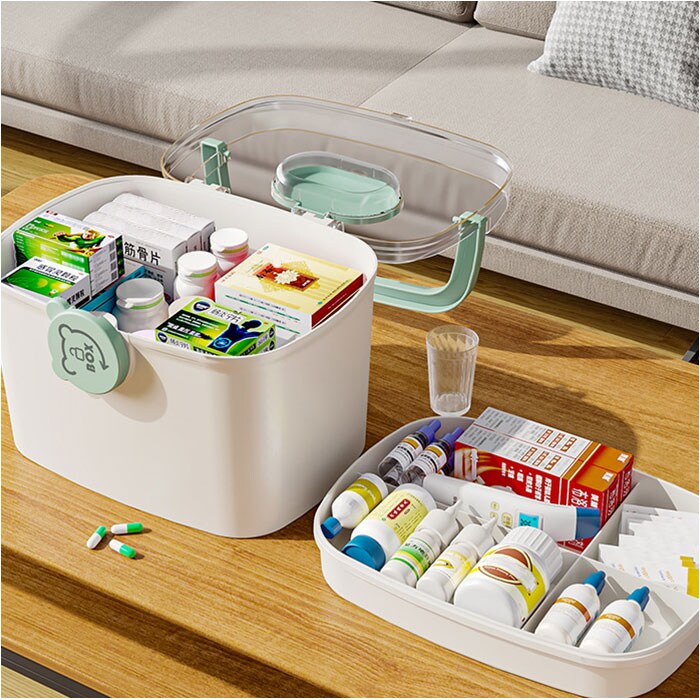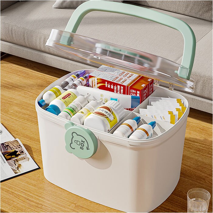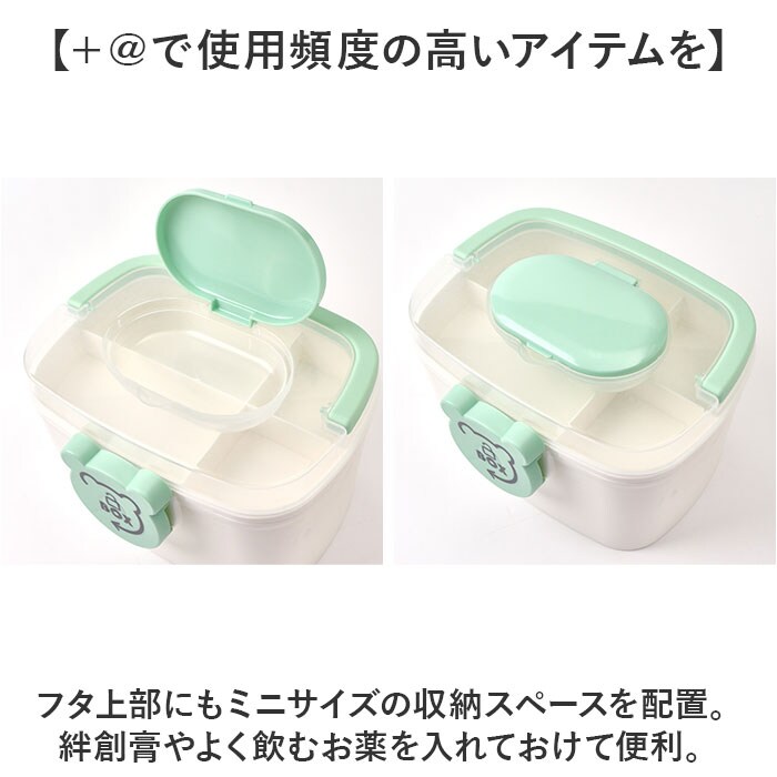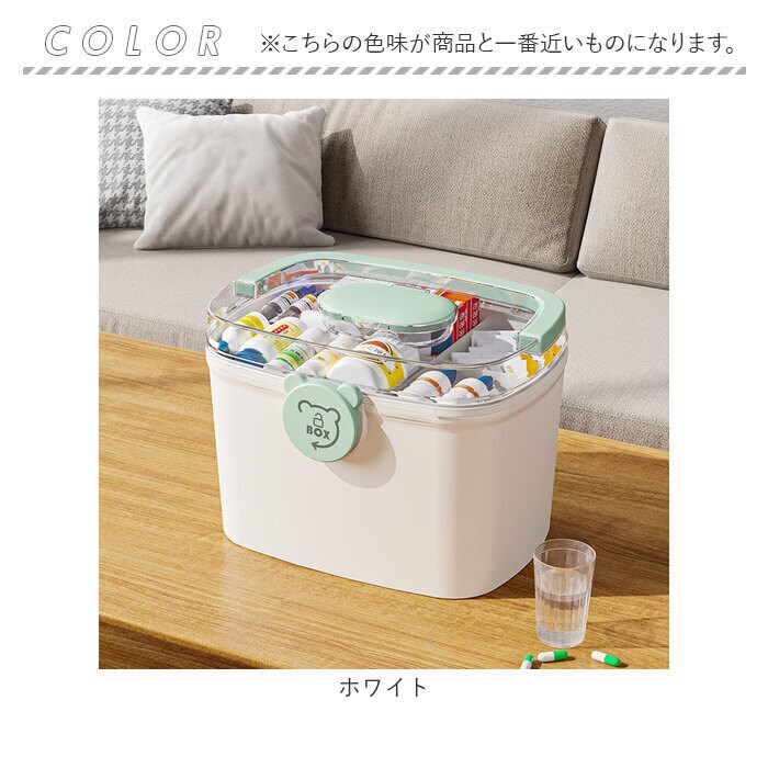 | 商品説明 | 【救急セットをすっきりひとまとめ】常備薬や救急アイテムを整理整頓♪家庭に1つあると役立つ2段式&持ち運びできる「救急箱」。【場所を取らず必要な物はしっかりと】お部屋に置いておきやすく、コンパクトにまとまるサイズ感。いざという時の備えに最適◎【回転式でいつでもスムーズに開閉】開口部のロックを回すだけ。移動時もフタが開く心配がなく、お子さまのいたずら防止にも。【立てて収納できるボックス型】内側はやや高さがあり、瓶のお薬や消毒液などを。お手持ちの仕切りボックスを入れてもOK。【仕切り付きで小物が迷子知らず】トレーは仕切り付き。高さのないお薬や体温計、爪切りなどの細かいものも、サクッと出し入れ。【+@で使用頻度の高いアイテムを】フタ上部にもミニサイズの収納スペースを配置。絆創膏やよく飲むお薬を入れておけて便利。【軽やかで持ち運びもラクラク】上部にハンドルを装備。ケース自体が軽量&丸みを帯びたフォルムで、安全面にも配慮。【ナチュラルで可愛らしいデザイン】柔らかなカラーリングに、クマさん型のロックがポイント!デコレーションできるシール付き。 |