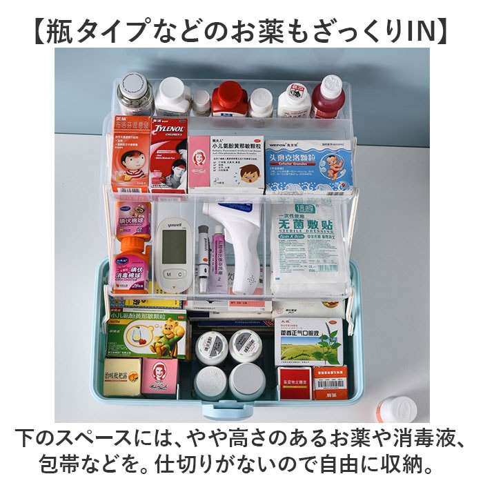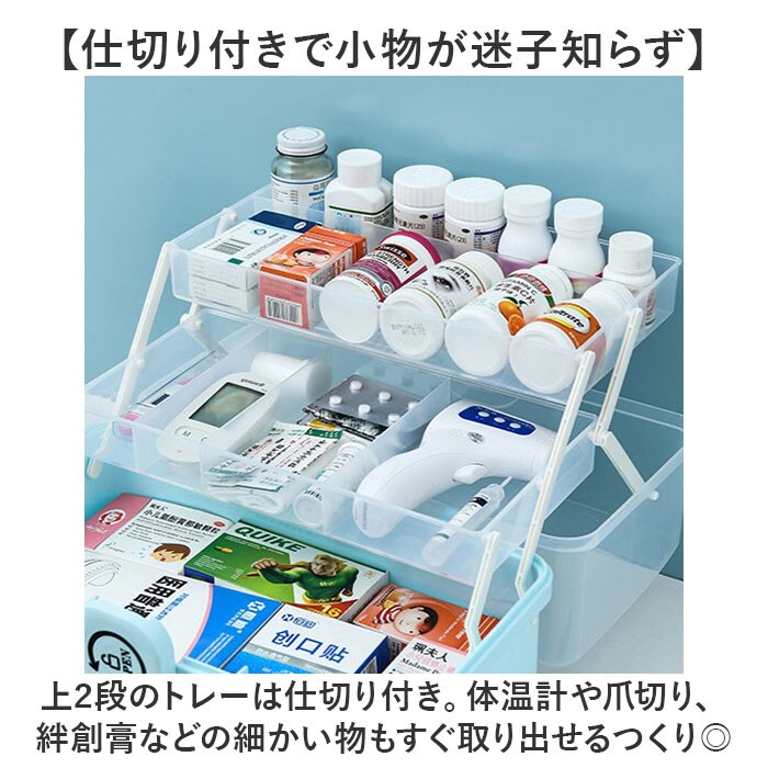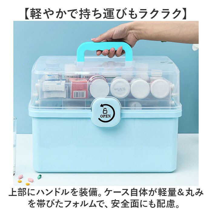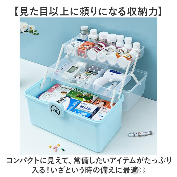 | 商品説明 | 【救急セットをすっきりひとまとめ】常備薬や救急アイテムを整理整頓♪持ち運びにも便利な「救急箱」が新登場。【見た目以上に頼りになる収納力】コンパクトに見えて、常備したいアイテムがたっぷり入る!いざという時の備えに最適◎【回転式でいつでもスムーズに開閉】開口部のロックを回すだけ。移動時もフタが開く心配がなく、お子さまのいたずら防止にも。【取り出し簡単折りたたみ式3段構造】ガバっと180度オープン。中身を確認しやすく、必要なものをすぐに取り出せるのが嬉しい!【仕切り付きで小物が迷子知らず】上2段のトレーは仕切り付き。体温計や爪切り、絆創膏などの細かい物もすぐ取り出せるつくり◎【瓶タイプなどのお薬もざっくりIN】下のスペースには、やや高さのあるお薬や消毒液、包帯などを。仕切りがないので自由に収納。【軽やかで持ち運びもラクラク】上部にハンドルを装備。ケース自体が軽量&丸みを帯びたフォルムで、安全面にも配慮。 |