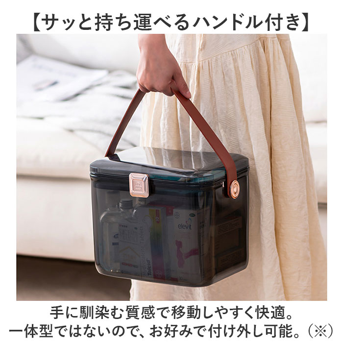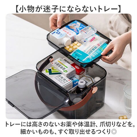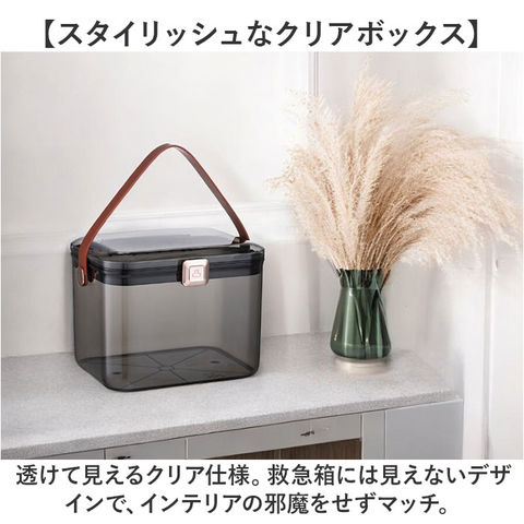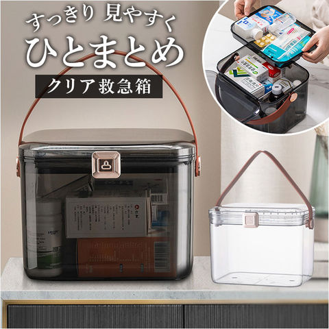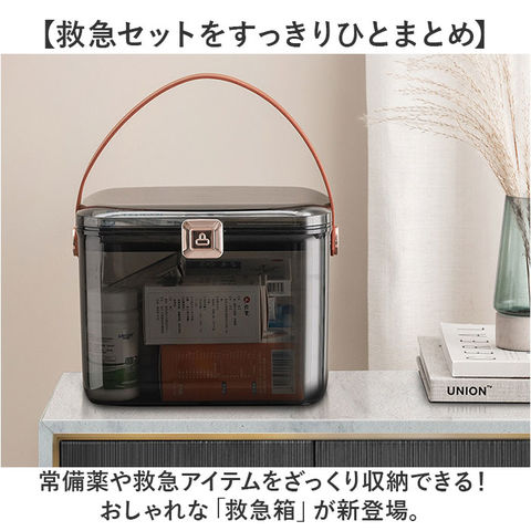 | 商品説明 | 【救急セットをすっきりひとまとめ】常備薬や救急アイテムをざっくり収納できる!おしゃれな「救急箱」が新登場。【スタイリッシュなクリアボックス】透けて見えるクリア仕様。救急箱には見えないデザインで、インテリアの邪魔をせずマッチ。【いつでもサクッとスムーズに開閉】開口部のパーツをフタから外してオープン!閉める時はカチッと固定できて安心。【立てて収納できるボックス型】内側は程よく高さがあり、瓶に入ったお薬や消毒液などもIN。整理しやすいスクエアボックス。【小物が迷子にならないトレー】トレーには高さのないお薬や体温計、爪切りなどを。細かいものも、すぐ取り出せるつくり◎【サッと持ち運べるハンドル付き】手に馴染む質感で移動しやすく快適。一体型ではないので、お好みで付け外し可能。(※)付属のパーツを使って、ハンドルを取り付けてください。【使い方いろいろ☆自分仕様に】スキンケア用品やコスメをまとめたり、裁縫箱、お茶などのストック入れとしても重宝。 |