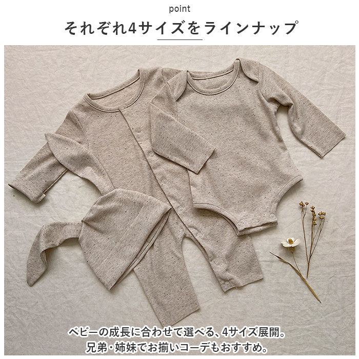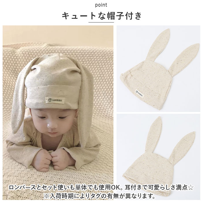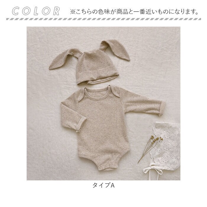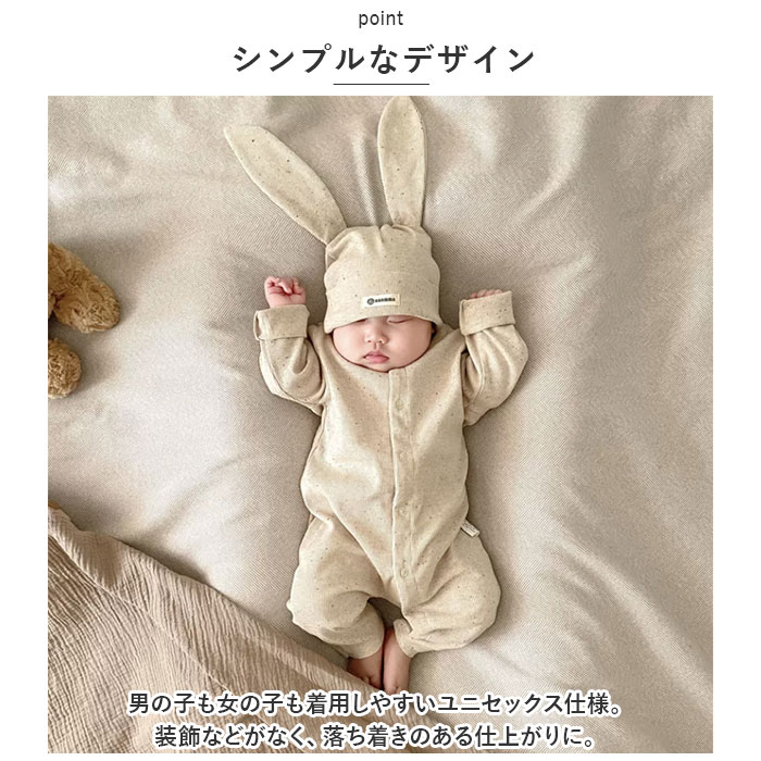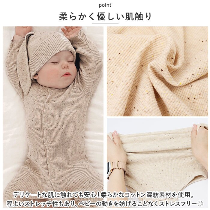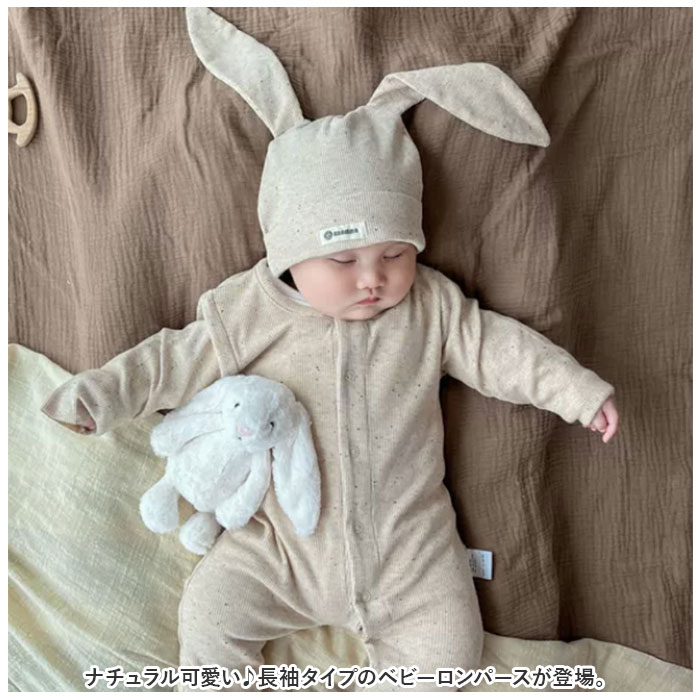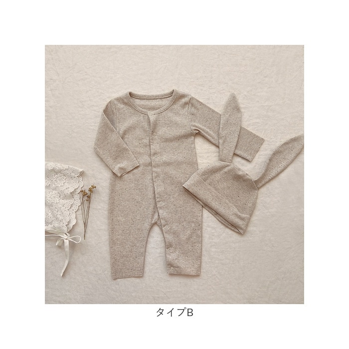 | 商品説明 | ナチュラル可愛い♪長袖タイプのベビーロンパースが登場。【シンプルなデザイン】男の子も女の子も着用しやすいユニセックス仕様。装飾などがなく、落ち着きのある仕上がりに。【柔らかく優しい肌触り】デリケートな肌に触れても安心!柔らかなコットン混紡素材を使用。程よいストレッチ性もあり、ベビーの動きを妨げることなくストレスフリー◎【季節やお好みで選べる2タイプ】頭からかぶって股下のスナップボタンで着脱するAタイプ。襟元から足首までのスナップボタンで全開にオープンできるBタイプ。どちらもおむつ替えの際に、洋服を脱がす必要なし!(※タイプによりフォルムや丈感が異なります。)【キュートな帽子付き】ロンパースとセット使いも単体でも使用OK。耳付きで可愛らしさ満点☆【それぞれ4サイズをラインナップ】ベビーの成長に合わせて選べる、4サイズ展開。兄弟・姉妹でお揃いコーデもおすすめ。 |