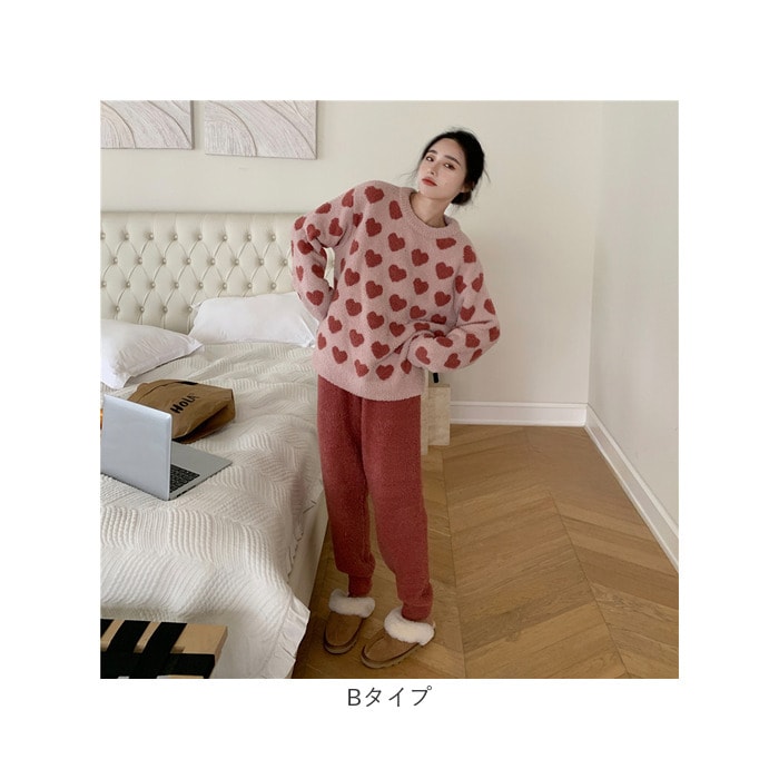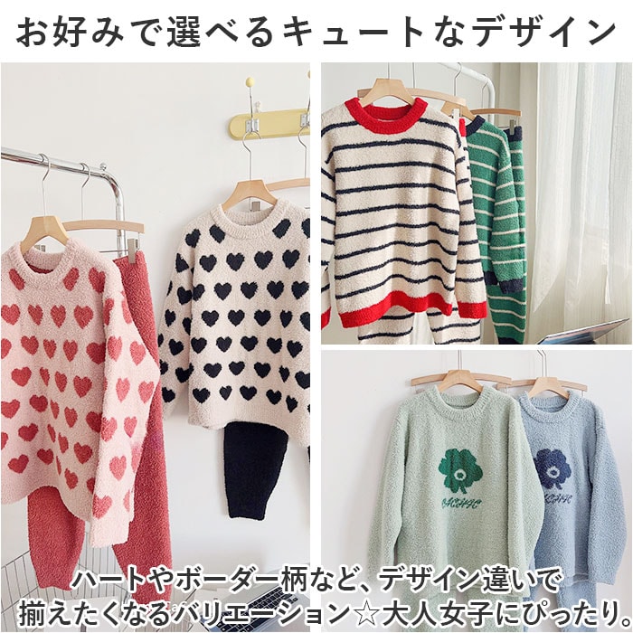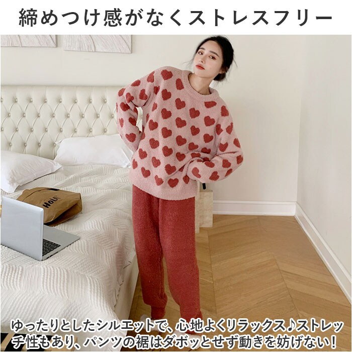 | 商品説明 | お気に入りのアイテムで、お家時間を快適に。寒い季節にぴったりな「ふわふわルームウェア」が新登場。【ふんわり寒さからガード】表裏両面、柔らかくふわふわとした心地よい肌触り。ボリュームのある生地で優しく包み込み、冷え込む季節もあったか♪【着脱しやすく自分サイズにフィット】上から被るだけのプルオーバー&ウエストゴム仕様のパンツで、着脱ラクラク!【締めつけ感がなくストレスフリー】ゆったりとしたシルエットで、心地よくリラックス♪ストレッチ性もあり、パンツの裾はダボッとせず動きを妨げない!【お好みで選べるキュートなデザイン】ハートやボーダー柄など、デザイン違いで揃えたくなるバリエーション☆大人女子にぴったり。 |