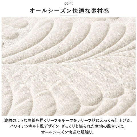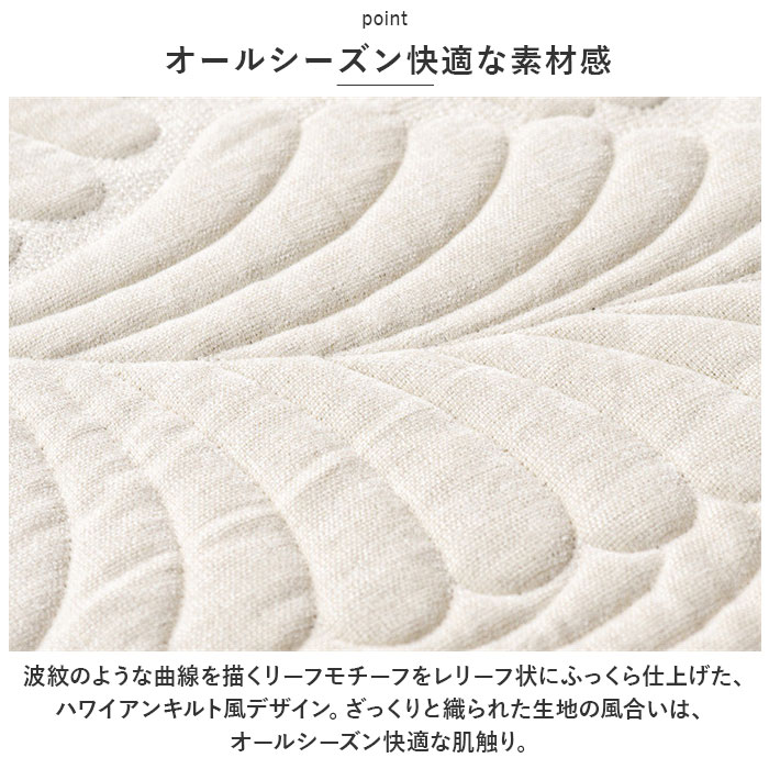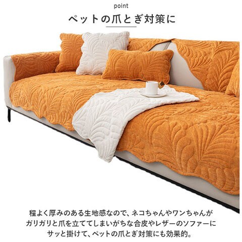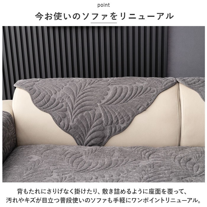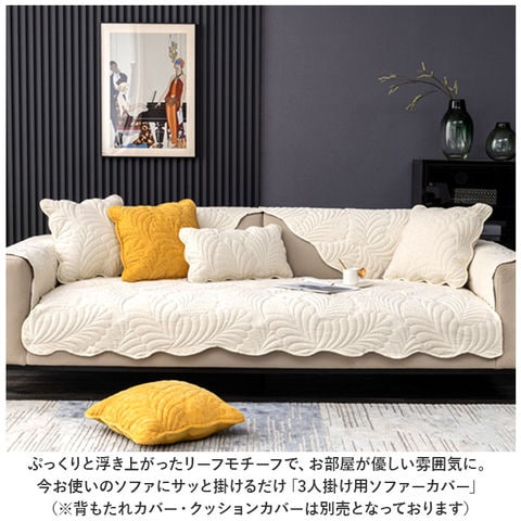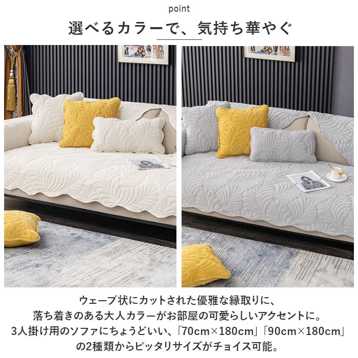 | 商品説明 | ぷっくりと浮き上がったリーフモチーフで、お部屋が優しい雰囲気に。今お使いのソファにサッと掛けるだけ「3人掛け用ソファーカバー」【オールシーズン快適な素材感】波紋のような曲線を描くリーフモチーフをレリーフ状にふっくら仕上げた、ハワイアンキルト風デザイン。ざっくりと織られた生地の風合いは、オールシーズン快適な肌触り。【今お使いのソファをリニューアル】背もたれにさりげなく掛けたり、敷き詰めるように座面を覆って、汚れやキズが目立つ普段使いのソファも手軽にワンポイントリニューアル。【ペットの爪とぎ対策に】程よく厚みのある生地感なので、ネコちゃんやワンちゃんがガリガリと爪を立ててしまいがちな合皮やレザーのソファーにサッと掛けて、ペットの爪とぎ対策にも効果的。【裏面ドット滑り止め加工】裏面にはドット状に滑り止めが施されているため、お掃除のたびにカバーを直す手間がないのも嬉しいポイント!【ご家庭でお洗濯OK!】手軽にお手入れができる簡単ウォッシャブル仕様。いつでも清潔に使えて、小さなお子様やペットがいるご家庭でも安心。(※洗濯ネットをご使用ください。)【選べるカラーで、気持ち華やぐ】ウェーブ状にカットされた優雅な縁取りに、落ち着きのある大人カラーがお部屋の可愛らしいアクセントに。3人掛け用のソファにちょうどいい、「70cm×180cm」「90cm×180cm」の2種類からピッタリサイズがチョイス可能。 |