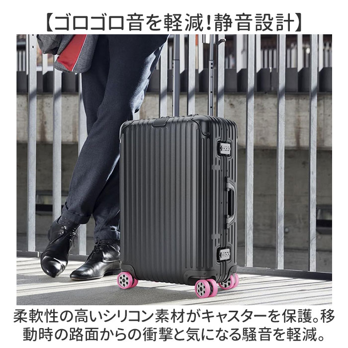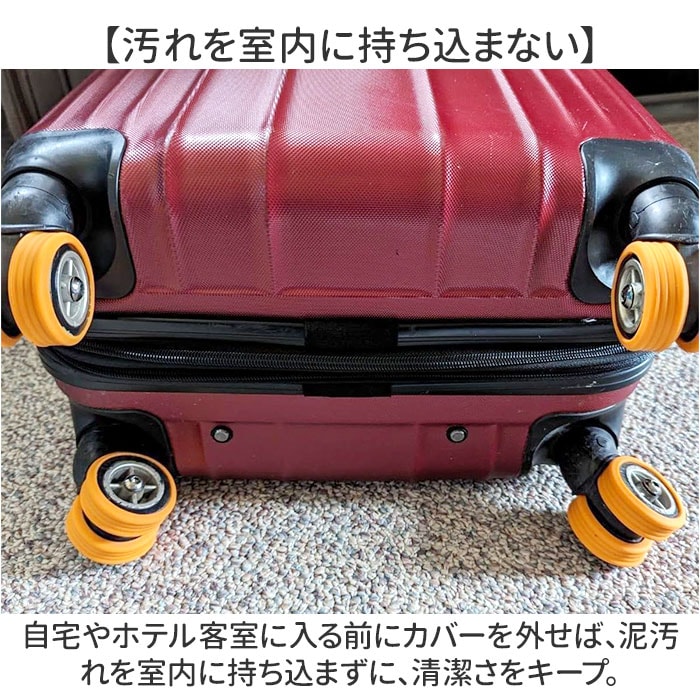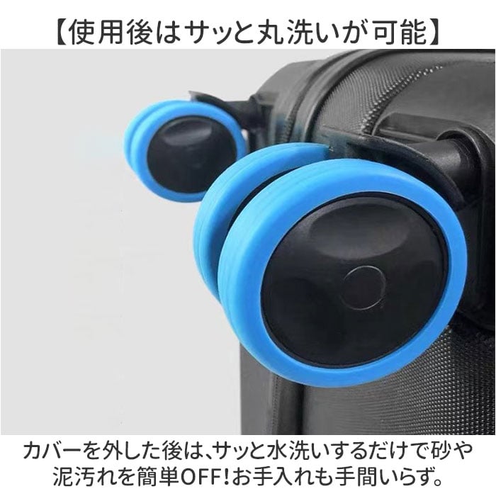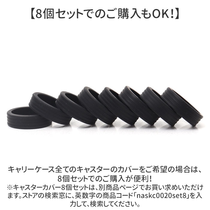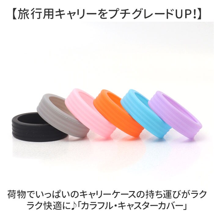 | 商品説明 | 【旅行用キャリーをプチグレードUP!】荷物でいっぱいのキャリーケースの持ち運びがラクラク快適に♪「カラフル・キャスターカバー」【ゴロゴロ音を軽減!静音設計】柔軟性の高いシリコン素材がキャスターを保護。移動時の路面からの衝撃と気になる騒音を軽減。【汚れを室内に持ち込まない】自宅やホテル客室に入る前にカバーを外せば、泥汚れを室内に持ち込まずに、清潔さをキープ。【使用後はサッと丸洗いが可能】カバーを外した後は、サッと水洗いするだけで砂や泥汚れを簡単OFF!お手入れも手間いらず。【自分のキャリーがすぐに見つかる】鮮やかな色合いのキャスターカバーを履かせれば、空港の手荷物受取所でも慌てずに回収が可能!※ブラックなど、ベーシックな色合いのカラーバリエーションもございます。【スマートで快適な旅を実現】キャリーケースを引く時のゴロゴロ音がせず、滑るようなスムーズな走行で旅行や出張が快適に。【単品購入ができてとってもエコ】カバー1個分から購入できるので、キャスターがすぐに摩耗してしまう旅行好きさんでも安心!【8個セットでのご購入もOK!】キャリーケース全てのキャスターのカバーをご希望の場合は、8個セットでのご購入が便利!※キャスターカバー8個セットは、別商品ページでお買い求めいただけます。ストアの検索窓に、英数字の商品コード「naskc0020set8」を入力して、検索してください。 |