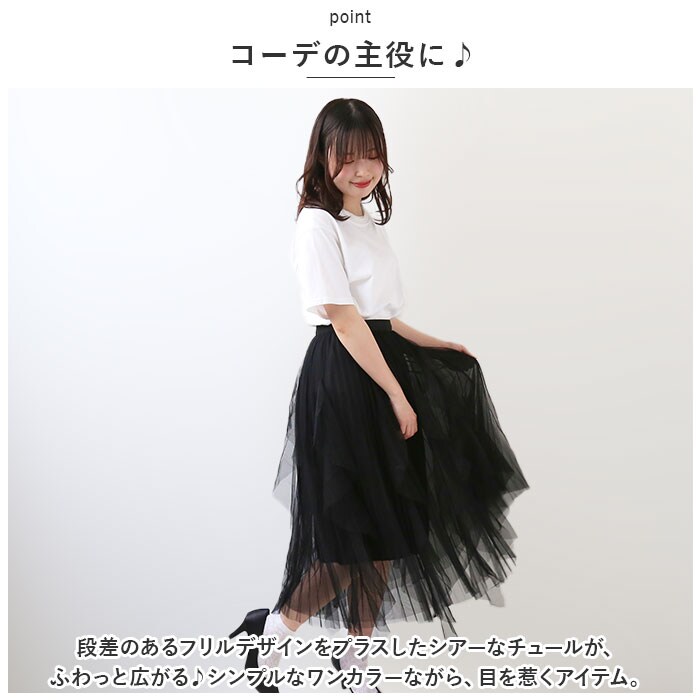| 商品説明 | フェミニンな雰囲気を演出してくれる♪ミモレ丈のチュールスカートが新登場。【コーデの主役に♪】段差のあるフリルデザインをプラスしたシアーなチュールが、ふわっと広がる♪シンプルなワンカラーながら、目を惹くアイテム。【ストレスフリー】締めつけ感のないウエストゴム仕様で、心地よくフィット◎着脱もラクチン。【Aラインシルエット】体のラインを拾いすぎず、気になるボディラインをふんわりカバー。【サラッとした生地感】チュールの下(裏地)は滑らかな素材。すとんと落ちてめくれ上がることなく、快適な着用感!【オールシーズン活躍】トップスを替えたり、秋冬やタイツを仕込んで♪シーズン問わず着られる1着。【選べるカラーバリエーション】ベーシックカラーや差し色になるカラーをラインナップ!色味によって雰囲気もチェンジ♪ |