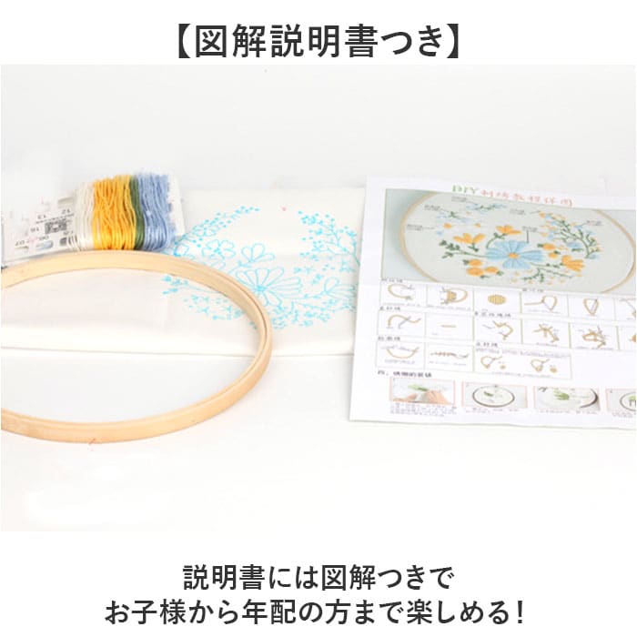 | 注意点 | 【セット内容】・刺繍用布(図案印刷済)・刺繍枠・刺繍糸・刺繍用針x 2本・説明書お取り扱いの際は、商品やパッケージなどに記載されている品質表示、アテンションタグ、ご使用上の注意事項などを必ずご確認下さい。本来の目的以外にはご使用にならないで下さい。カメラやモニターの性質により、画像と実物の色の違いがある場合がございますのでご理解願います。 |