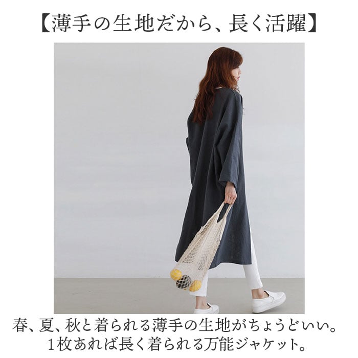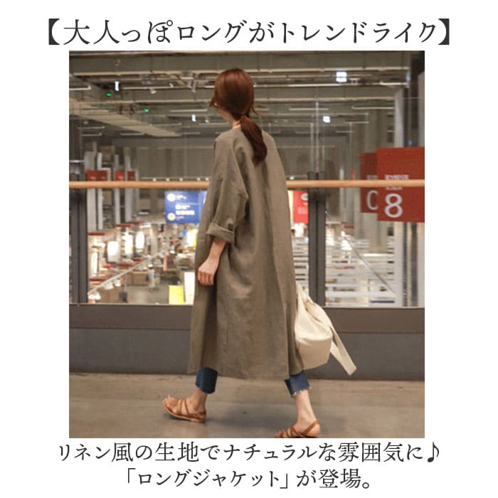 | 商品説明 | 【大人っぽロングがトレンドライク】リネン風の生地でナチュラルな雰囲気に♪「ロングジャケット」が登場。【季節の変わり目にぴったり☆】ライトな着心地で、肌寒くなってきた季節に大活躍!デイリー使いできるカジュアルアウター。【ラフすぎないロングシルエット】気軽に羽織れるのに、ちょっときれいに仕上げてくれる大人っぽいロング丈。【ノーカラーで旬さUP☆】シンプルさを極めた、ノーカラーが今の気分♪着るだけでトレンドライクに決まるのがポイント。【おしゃれに体型カバーが叶う!】身体のラインを拾いにくいから、体型カバー効果も◎スカートもパンツにもマッチする。【嬉しいポケットつき仕様】両サイドにポケットを配置。お出かけ中にスマホなどの小物を入れられるから、便利で快適!【薄手の生地だから、長く活躍】春、夏、秋と着られる薄手の生地がちょうどいい。1枚あれば長く着られる万能ジャケット。 |