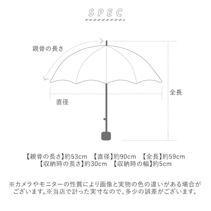 | サイズ | [親骨の長さ]約53cm/[直径]約90cm/[全長]約59cm [収納時の長さ]約30cm [収納時の幅]約5cm ※サイズは当店計測の実寸サイズです。実際の商品ならびにメーカー表記サイズとは多少の誤差が生じる場合がございます。あらかじめご了承ください。 |
