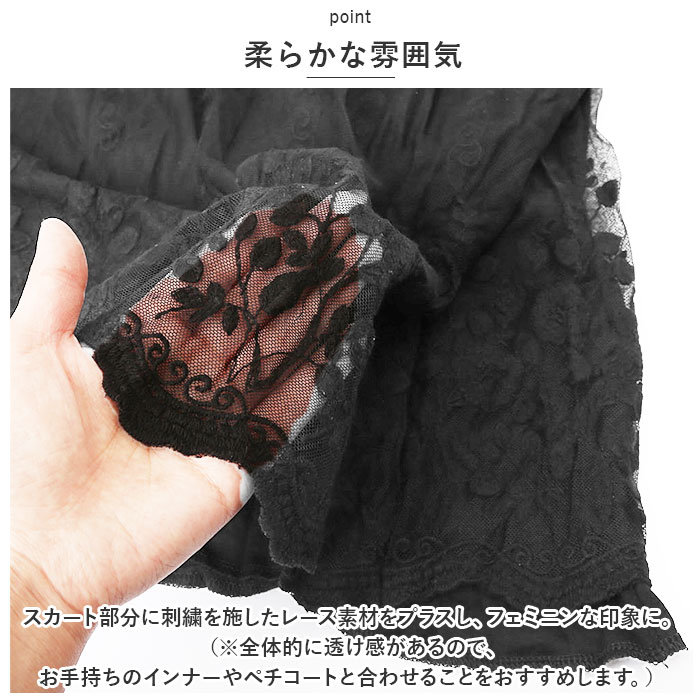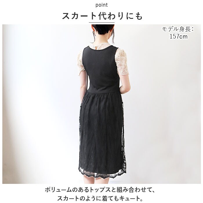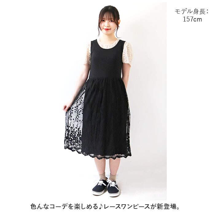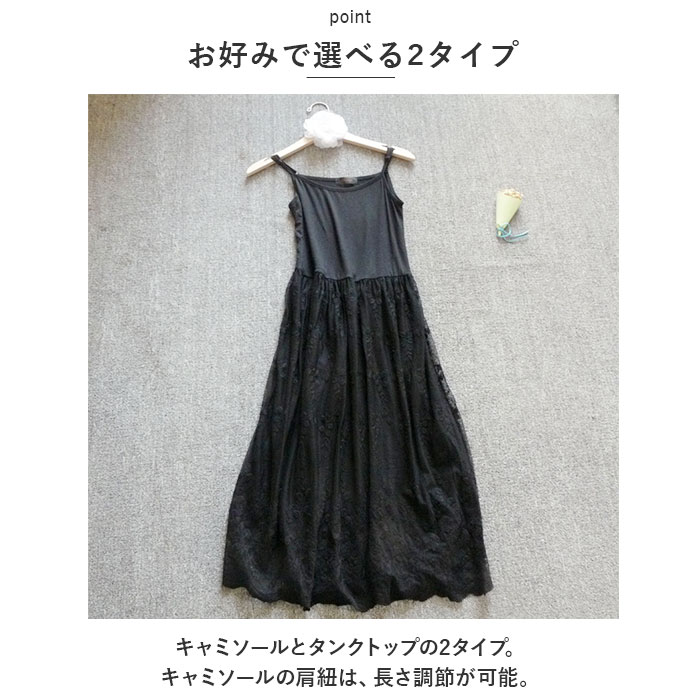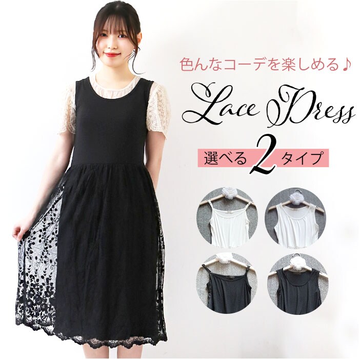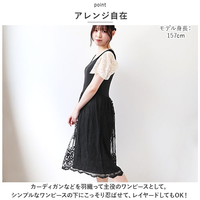 | 商品説明 | 色んなコーデを楽しめる♪レースワンピースが新登場。【着心地抜群!】サラッと軽い生地感でストレッチ性もあり、ボディラインに心地よくフィット。【柔らかな雰囲気】スカート部分に刺繍を施したレース素材をプラスし、フェミニンな印象に。(※全体的に透け感があるので、お手持ちのインナーやペチコートと合わせることをおすすめします。)【お好みで選べる2タイプ】キャミソールとタンクトップの2タイプ。キャミソールの肩紐は、長さ調節が可能。【アレンジ自在】カーディガンなどを羽織って主役のワンピースとして。シンプルなワンピースの下にこっそり忍ばせて、レイヤードしてもOK!【スカート代わりにも】ボリュームのあるトップスと組み合わせて、スカートのように着てもキュート。【着回し力ばっちり】どんなコーデにも合わせやすい、スタンダードカラーをラインナップ。 |