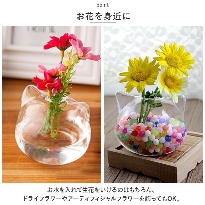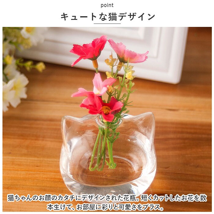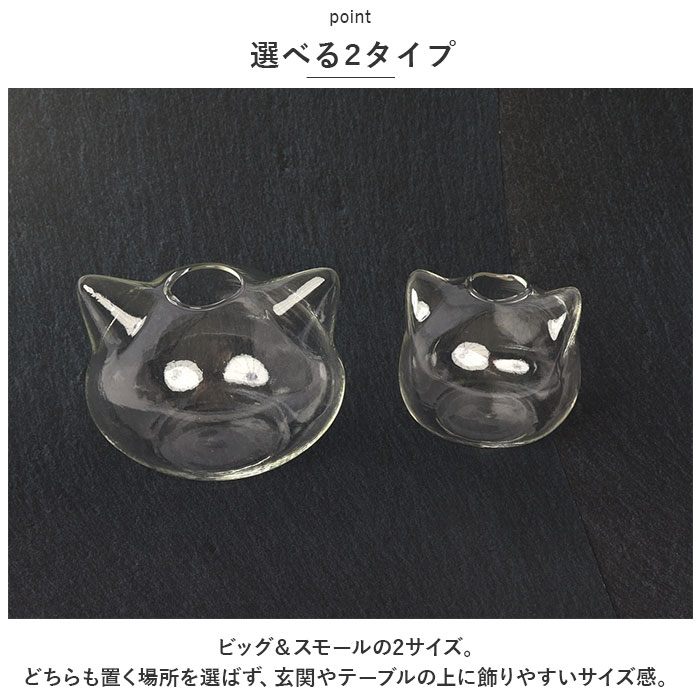 商品説明ころんと可愛い♪猫モチーフの花瓶が新登場。【キュートな猫デザイン】猫ちゃんのお顔のカタチにデザインされた花瓶。短くカットしたお花を数本生けて、お部屋に彩りと可愛さをプラス。【選べる2タイプ】ビッグ&スモールの2サイズ。どちらも置く場所を選ばず、玄関やテーブルの上に飾りやすいサイズ感。【お花を身近に】お水を入れて生花をいけるのはもちろん、ドライフラワーやアーティフィシャルフラワーを飾ってもOK。【癒やしの空間に】猫好きな方にはもちろん、心がほっこりするアイテムを取り入れたい方にもおすすめ。