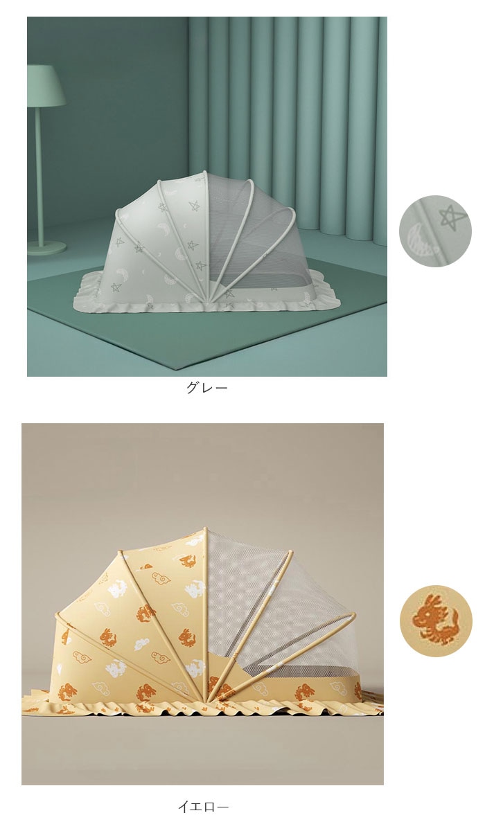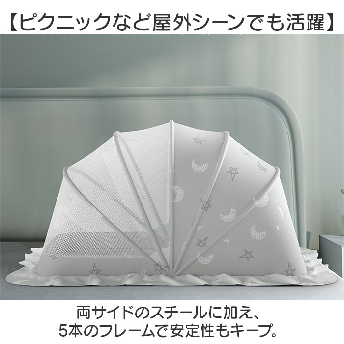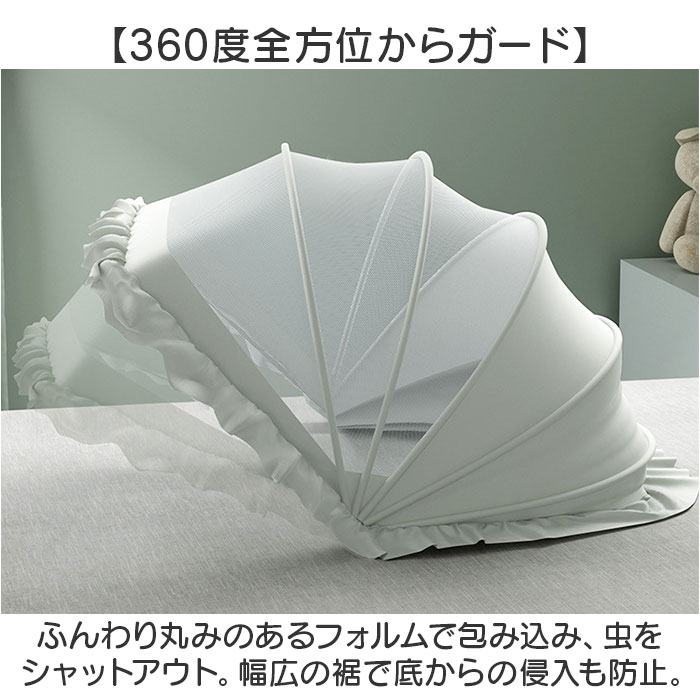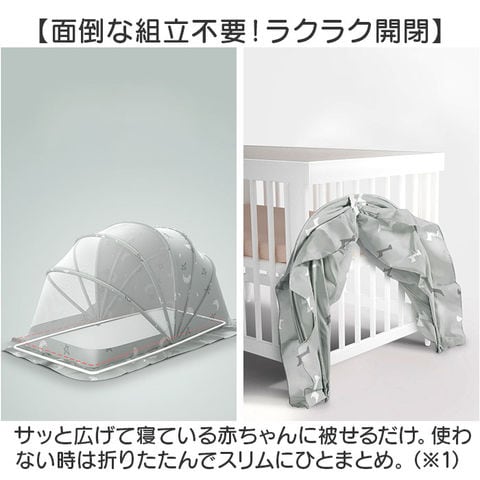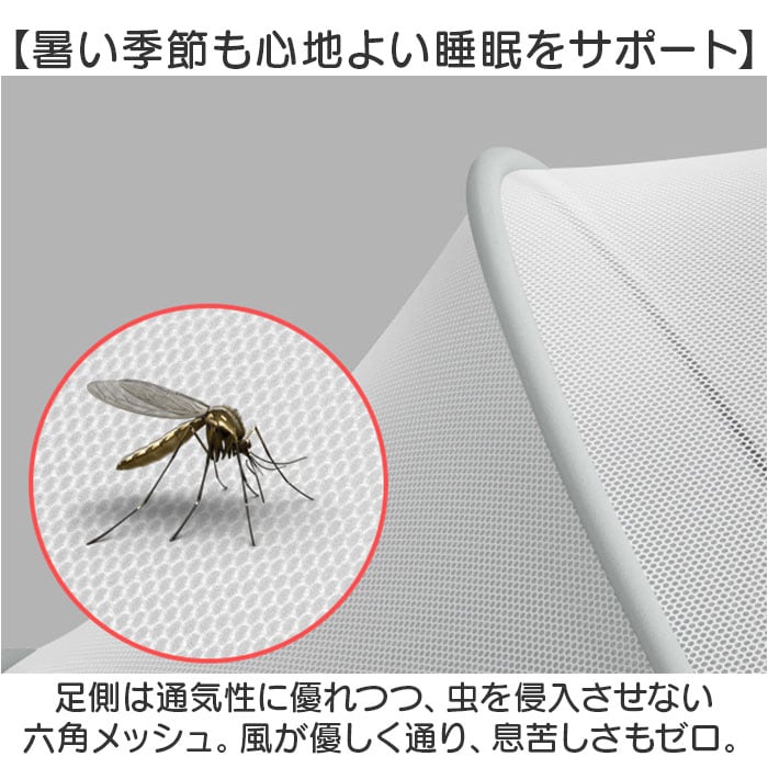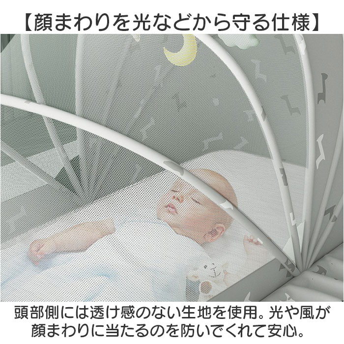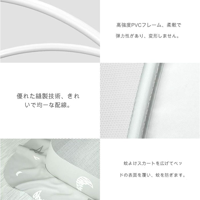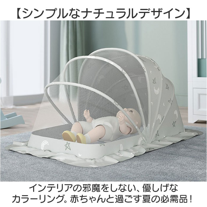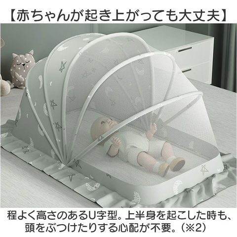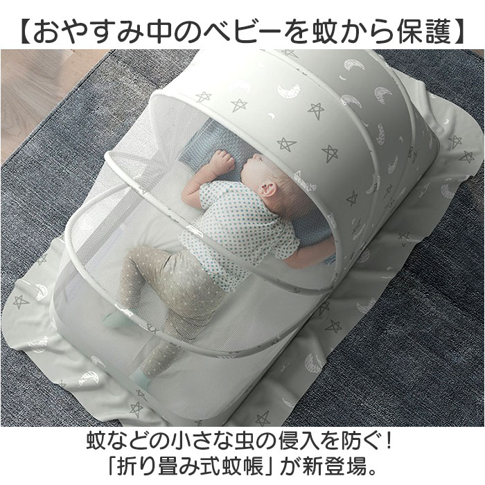 | 商品説明 | 【おやすみ中のベビーを蚊から保護】蚊などの小さな虫の侵入を防ぐ!「折り畳み式蚊帳」が新登場。【面倒な組立不要!ラクラク開閉】サッと広げて寝ている赤ちゃんに被せるだけ。使わない時は折りたたんでスリムにひとまとめ。(※1)まとめるボタンの有無は、カラーにより異なります。【360度全方位からガード】ふんわり丸みのあるフォルムで包み込み、虫をシャットアウト。幅広の裾で底からの侵入も防止。【赤ちゃんが起き上がっても大丈夫】程よく高さのあるU字型。上半身を起こした時も、頭をぶつけたりする心配が不要。(※2)月齢により異なりますので、ご注意願います。【暑い季節も心地よい睡眠をサポート】足側は通気性に優れつつ、虫を侵入させない六角メッシュ。風が優しく通り、息苦しさもゼロ。【顔まわりを光などから守る仕様】頭部側には透け感のない生地を使用。光や風が顔まわりに当たるのを防いでくれて安心。【ピクニックなど屋外シーンでも活躍】両サイドのスチールに加え、5本のフレームで安定性もキープ。【シンプルなナチュラルデザイン】インテリアの邪魔をしない、優しげなカラーリング。赤ちゃんと過ごす夏の必需品! |