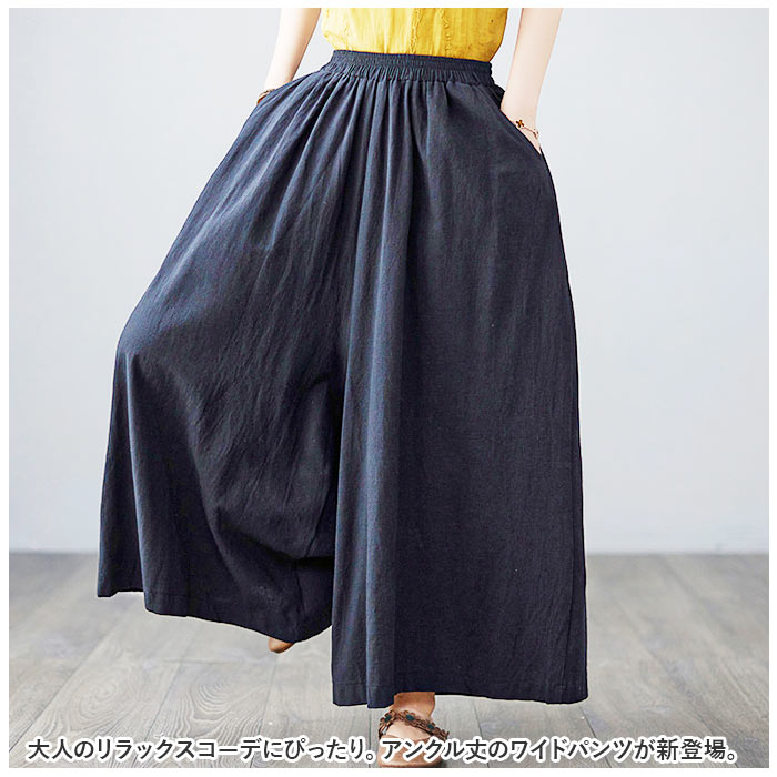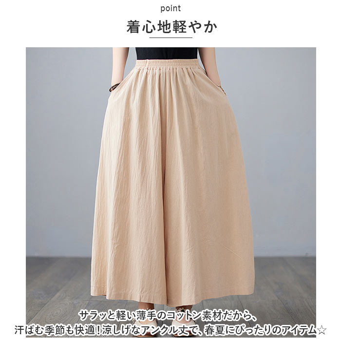 | 商品説明 | 大人のリラックスコーデにぴったり。アンクル丈のワイドパンツが新登場。【着心地軽やか】サラッと軽い薄手のコットン素材だから、汗ばむ季節も快適!涼しげなアンクル丈で、春夏にぴったりのアイテム☆【絶妙なワイドシルエット】体のラインを拾いにくく、気になるボディラインをふんわりカバー◎【ストレスフリー】締め付け感のないウエストゴム仕様で動きやすく、座りっぱなしでもラクチン!股上が深く、安定した履き心地をプラス。【便利なポケット付き】左右に配置されたポケットには、スマホや薄手のハンカチをIN。【着回し力ばっちり】どんなトップスとも相性の良い、シンプルな無地デザイン。カラーにより雰囲気が異なるので、なりたいイメージに合わせてチョイスして♪ |