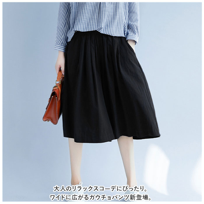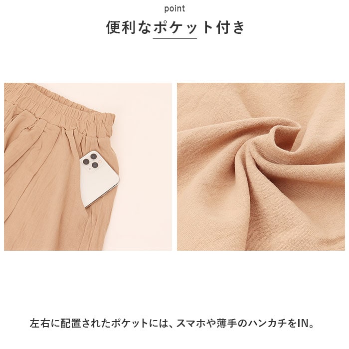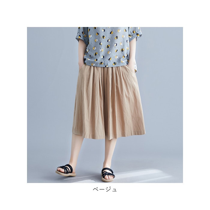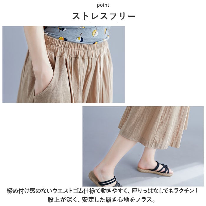 | 商品説明 | 大人のリラックスコーデにぴったり。ワイドに広がるガウチョパンツ新登場。【着心地軽やか】サラッと軽い薄手のコットンリネン素材だから、汗ばむ季節も快適!涼しげな七分丈で、春夏にぴったりのアイテム☆【絶妙なワイドシルエット】体のラインを拾いにくく、気になる部分もふんわりカバー◎【ストレスフリー】締め付け感のないウエストゴム仕様で動きやすく、座りっぱなしでもラクチン!股上が深く、安定した履き心地をプラス。【便利なポケット付き】左右に配置されたポケットには、スマホや薄手のハンカチをIN。【着回し力ばっちり】どんなトップスとも相性の良い、シンプルな無地デザイン。カラーにより雰囲気が異なるので、なりたいイメージに合わせてチョイスして♪ |