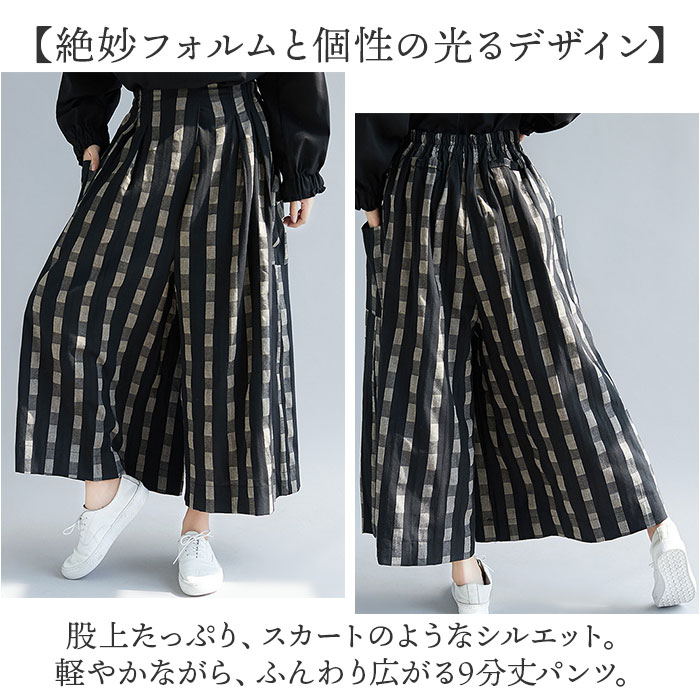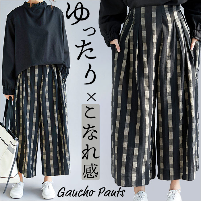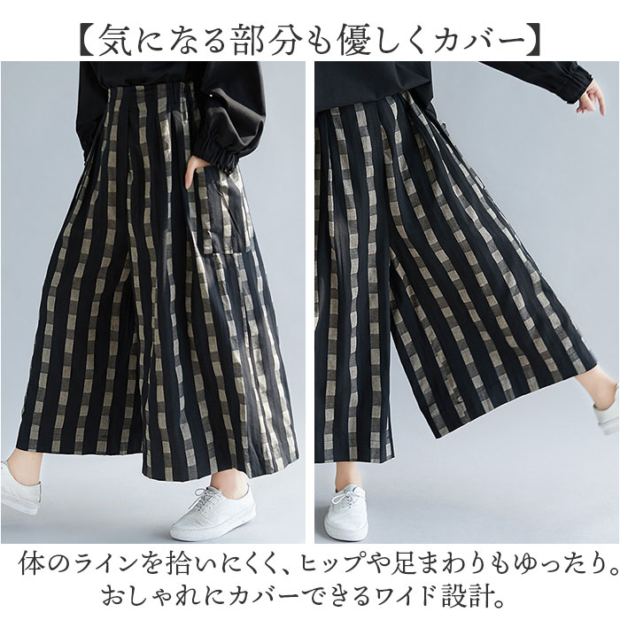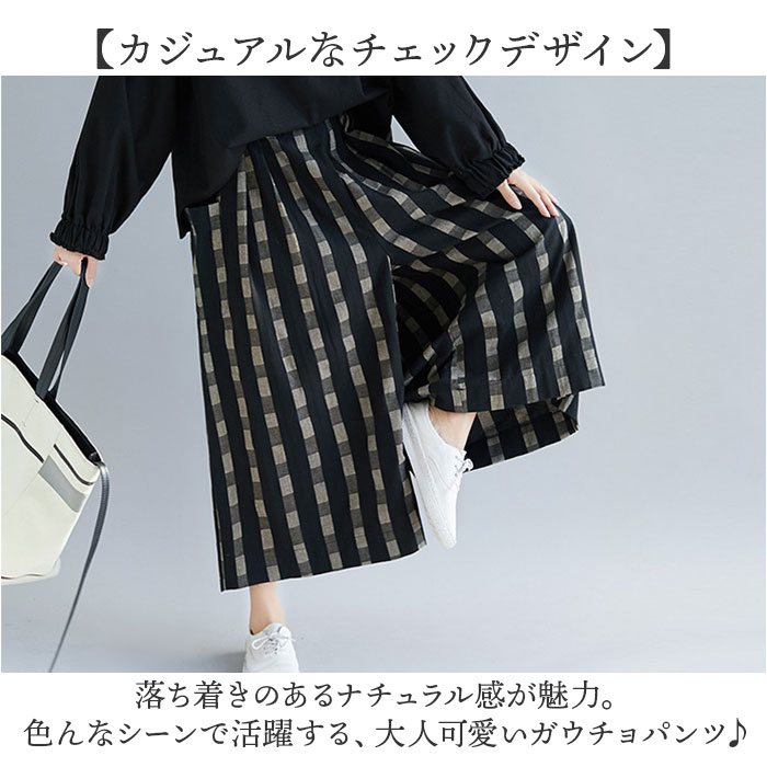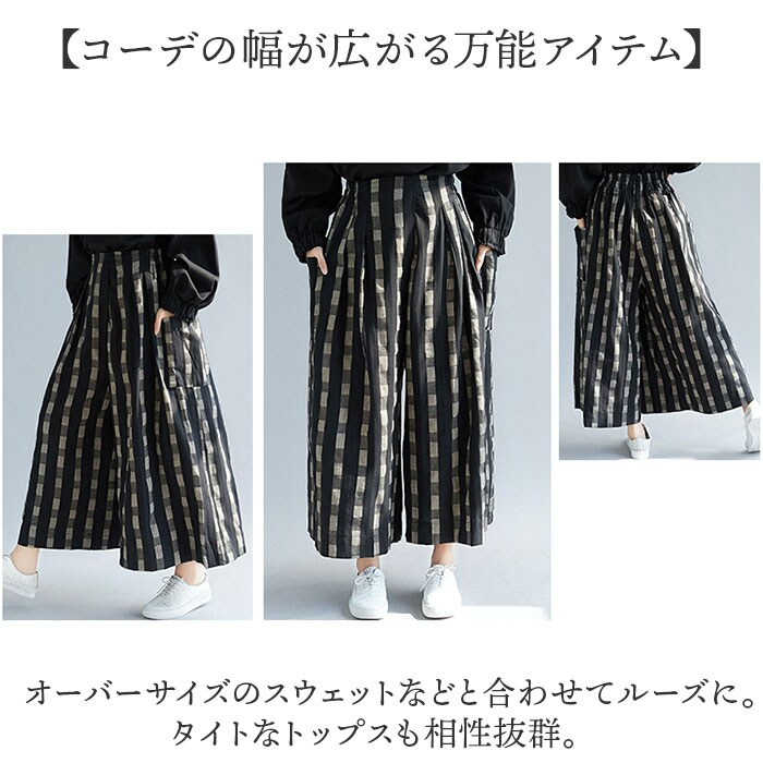 | 商品説明 | 【ゆったり×こなれ感のある着こなし】着心地快適&わりと差をつけるデザイン!ファッションを楽しむ「ガウチョパンツ」。【絶妙フォルムと個性の光るデザイン】股上たっぷり、スカートのようなシルエット。軽やかながら、ふんわり広がる9分丈パンツ。【気になる部分も優しくカバー】体のラインを拾いにくく、ヒップや足まわりもゆったり。おしゃれにカバーできるワイド設計。【締め付け感がなくストレスフリー】自分サイズにフィットするバックゴム仕様。着脱もしやすく、フロントからの見た目もすっきり。【小物を入れておける左右ポケット】左右に配置されたポケットには、スマホや薄手のハンカチなどをIN。【コーデの幅が広がる万能アイテム】オーバーサイズのスウェットなどと合わせてルーズに。タイトなトップスも相性抜群。【カジュアルなチェックデザイン】落ち着きのあるナチュラル感が魅力。色んなシーンで活躍する、大人可愛いガウチョパンツ♪ |